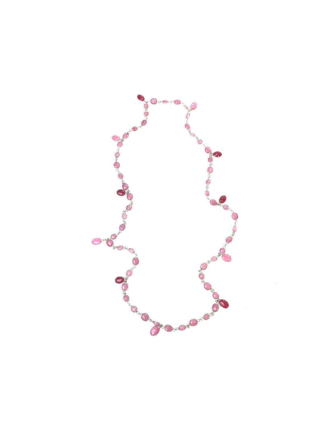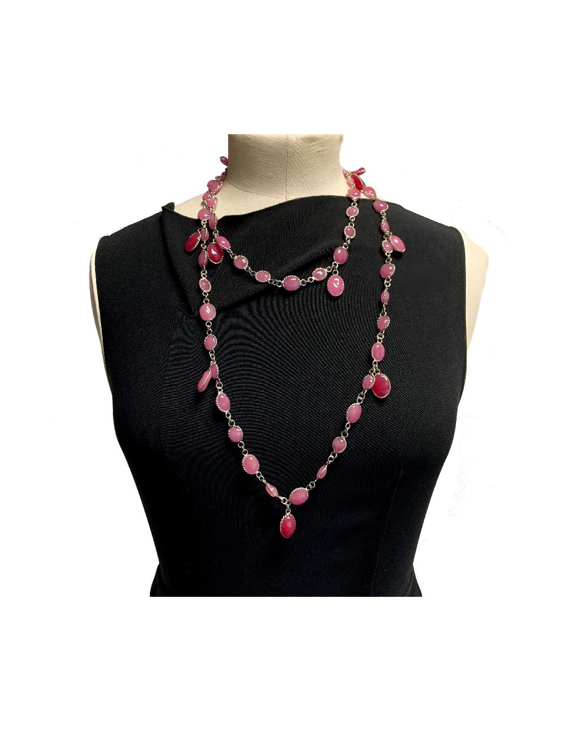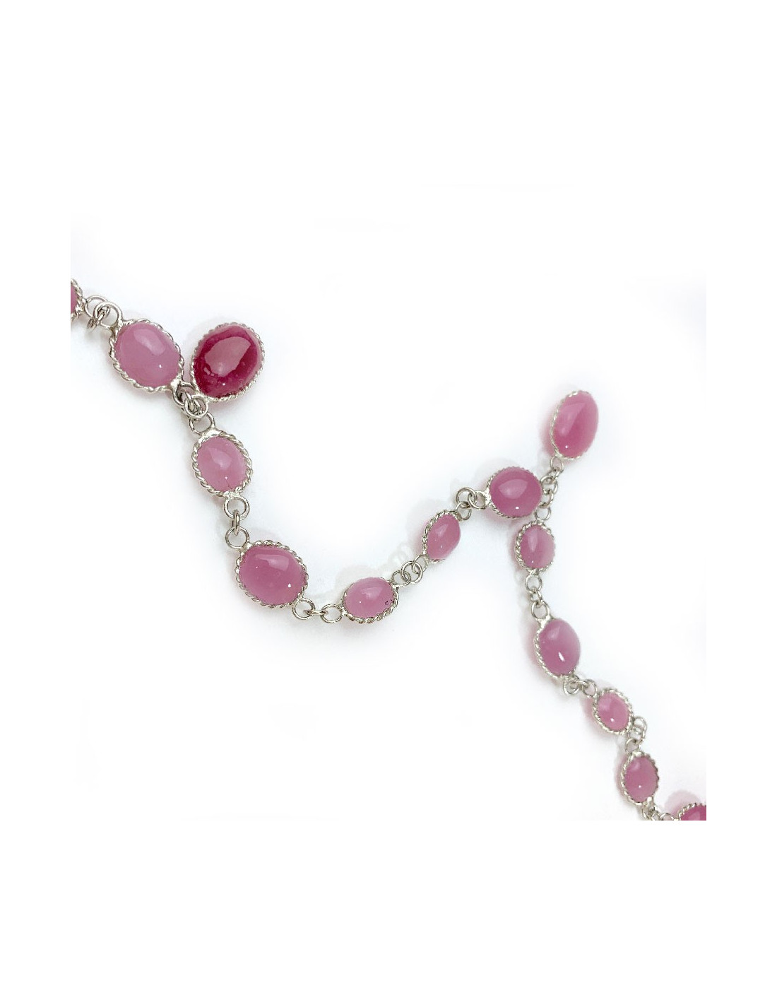 Sophisticated long necklace by Marguerite de Valois, Waterfalls model, with molten glass pendants in light pink and some in dark pink. It can be worn as a long necklace or as a double-row necklace.