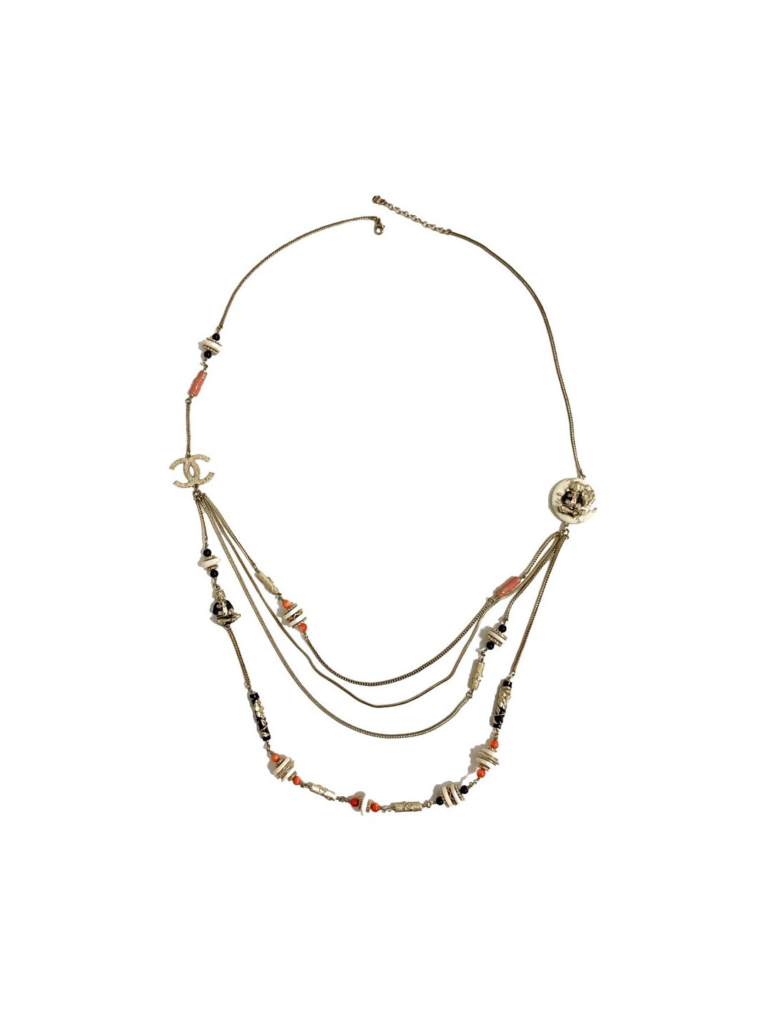 Sold NECKLACES Chanel glass beads breastplate CHANEL 27014 3,550.00 € Chanel glass beads breastplate multicolored Condition : goodMaterial : Glass beads, metalColor : multicolorDimensions : Total length: 54 cmBreastplate height: 5 cm Made In France View
