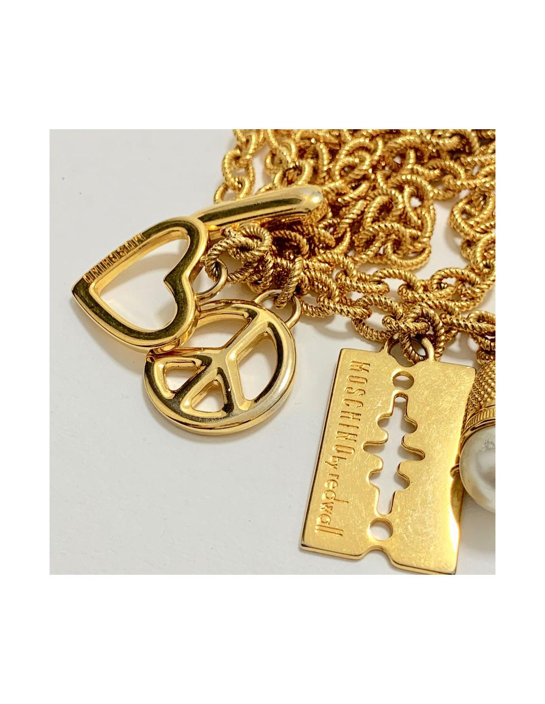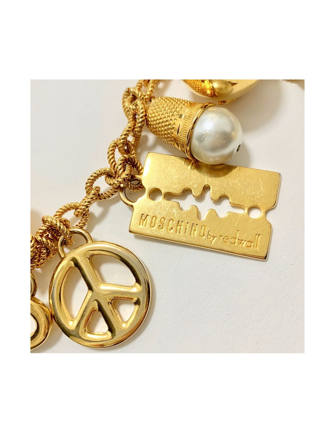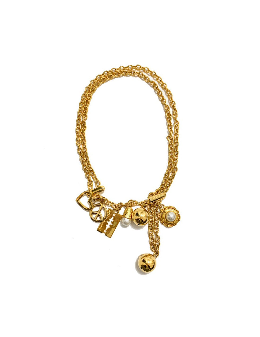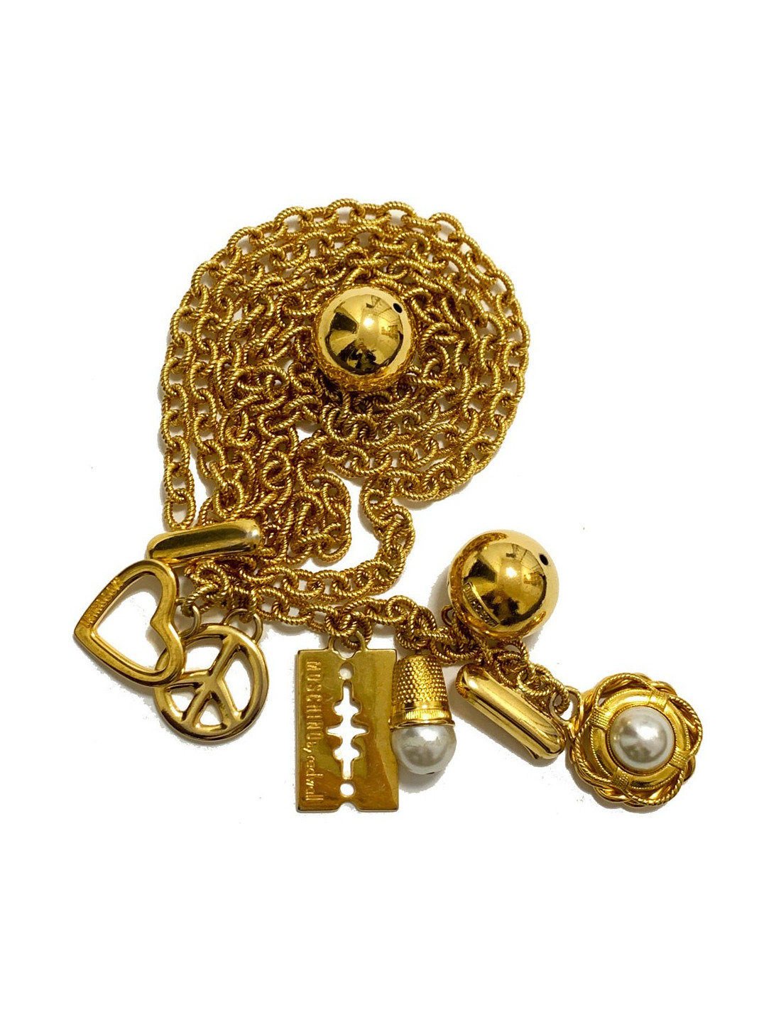 Vintage MOSCHINO by Redwall chain necklace-belt in gilt metal set with charms: a heart, peace sign, razor, thimble with a pearly fancy pearl, a gold balloon and a flower with a fancy pearly pearl. The MOSCHINO brand is engraved on the golden pearls.