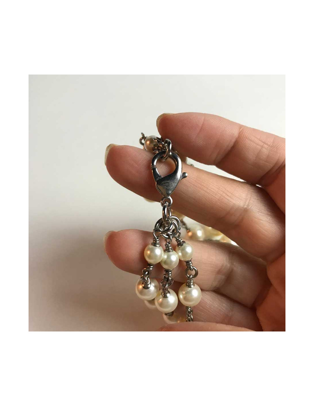 Last items in stock NECKLACES CHANEL pearl and gold bib necklace CHANEL 34334 2,850.00 € CHANEL mother-of-pearl beads and gold bib necklace Condition : very goodMade in FranceMaterials : metal, pearly beadsColor : goldMeasurements : length (adjustable) up to 40 cm, pendant : 15 cmHardware : gold finish metalStamp : yesYear : Spring 2002Details : CC pendant on the clasp, rigid choker with dangling beaded chains. Advantage Valois Vintage Paris... Add to cart