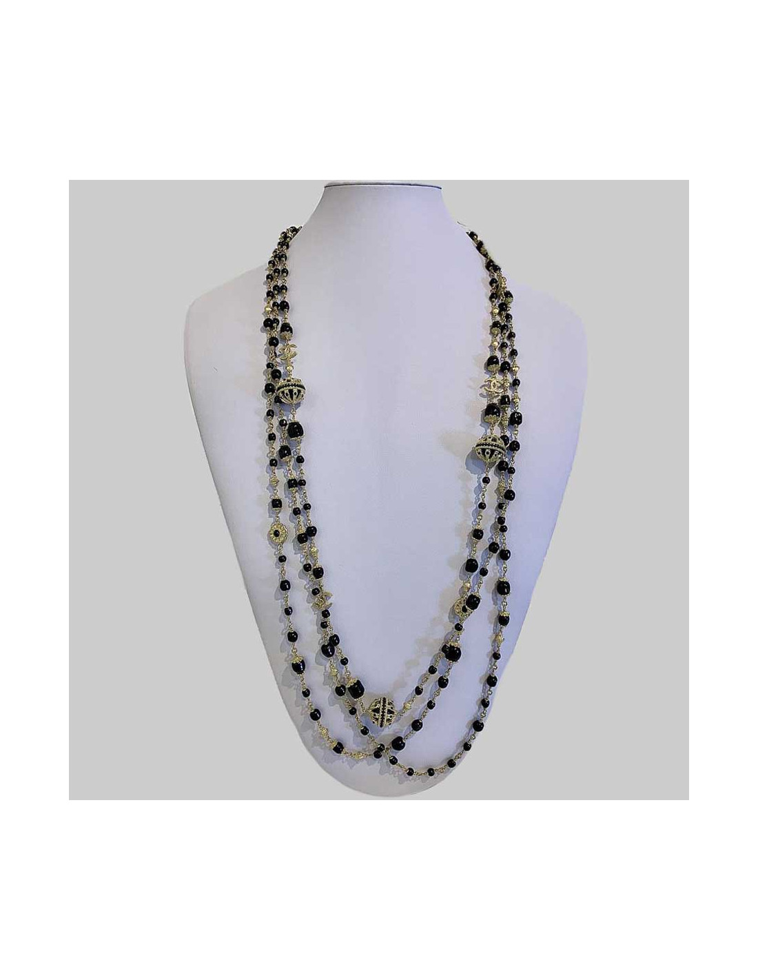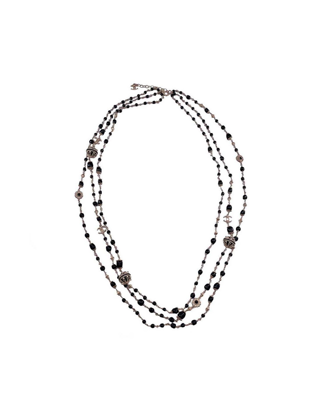 Last items in stock NECKLACES CHANEL couture ceremonial necklace CHANEL 33739 3,500.00 € CHANEL couture ceremonial necklace Condition : very goodMaterials : pearls, stones, resin, metalColors : black, burgundy, greyMeasurement : total length: 45 cmDetails : triple-row necklace with large pendant, CC on metal next to rhinestones. Baguette-cut rhinestones. Triple rows of stones and rhinestones. Add to cart