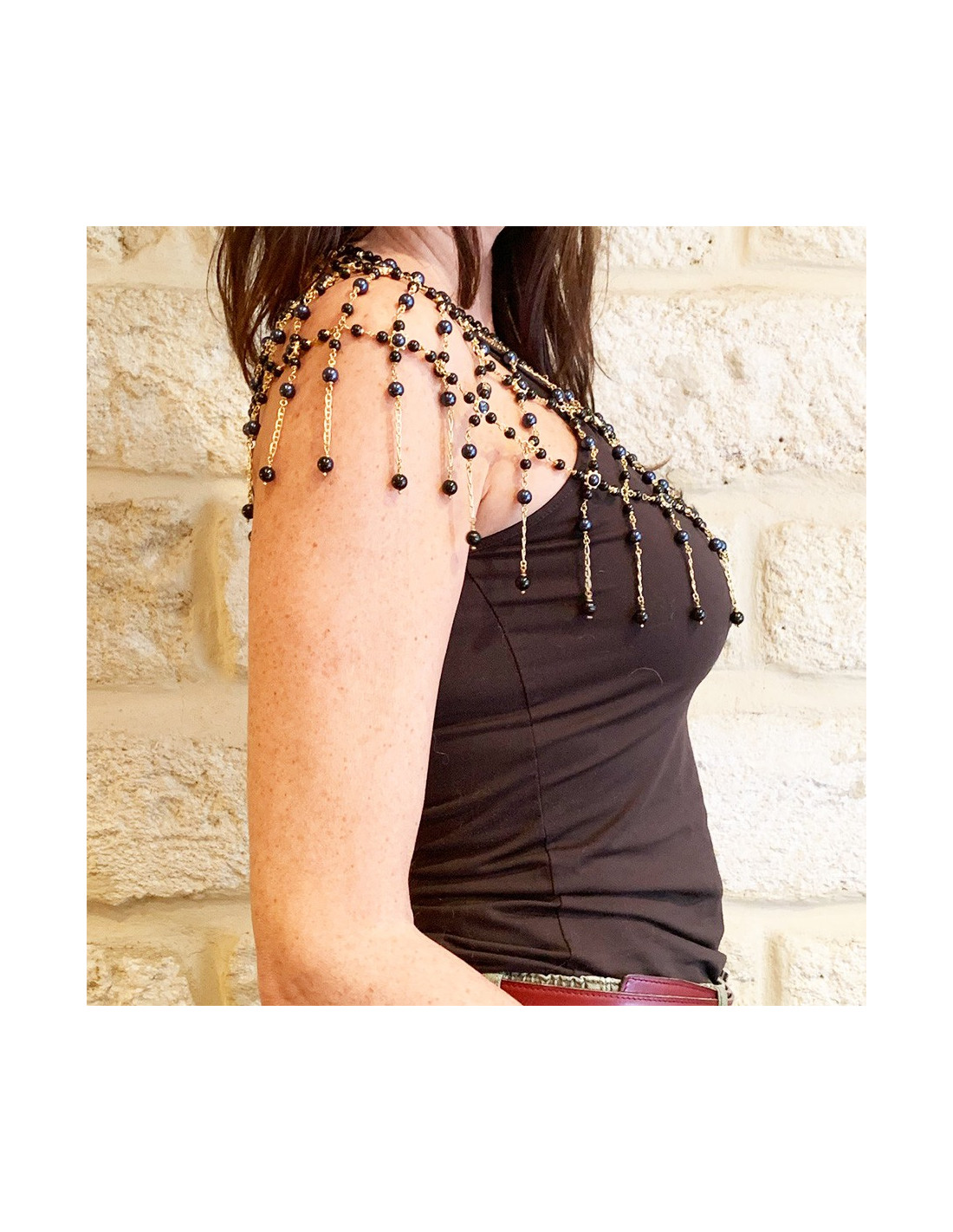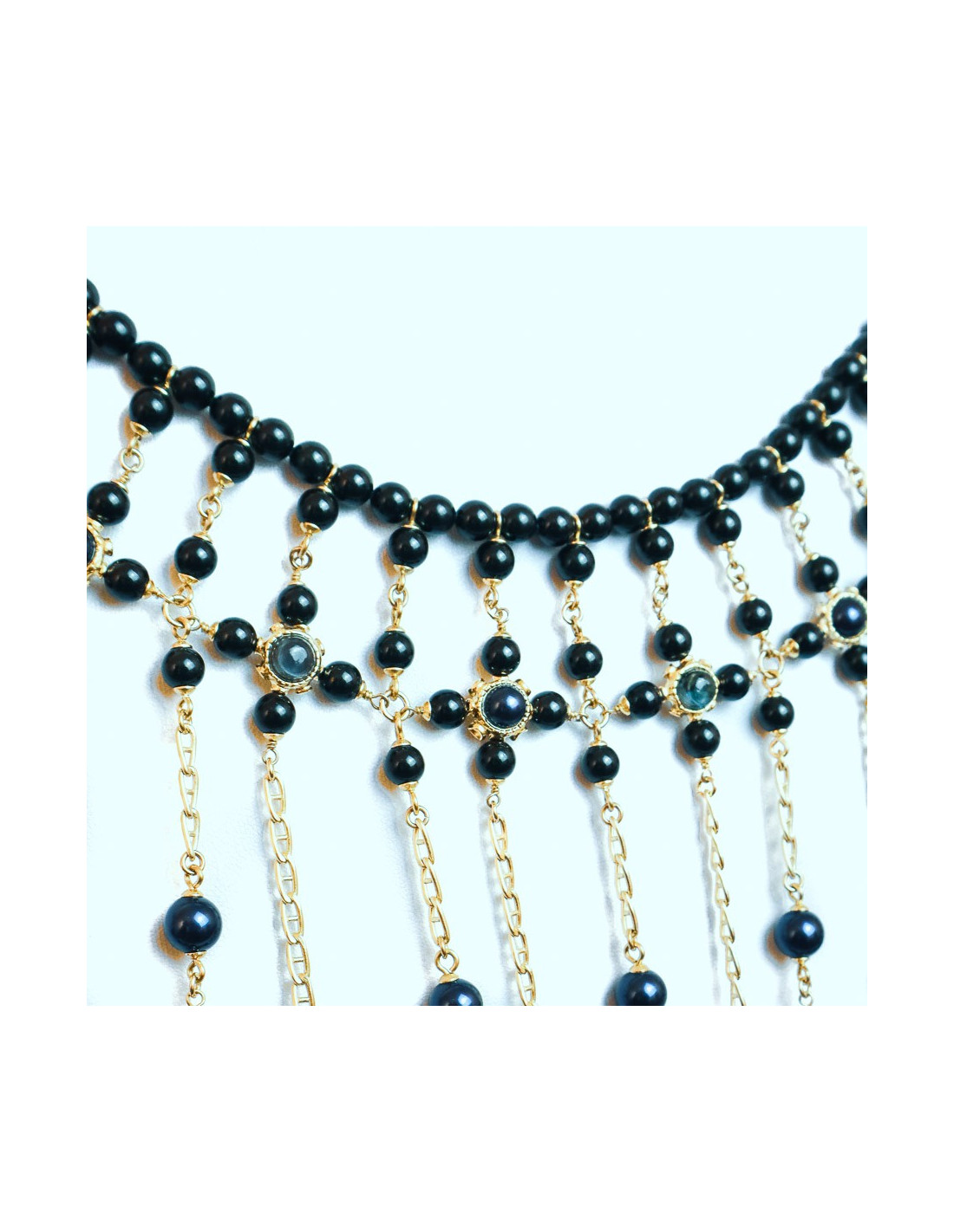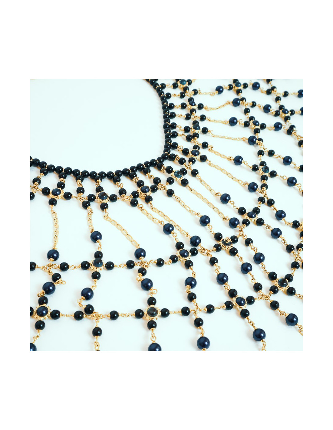 The jewel is a magnificent piece that will dress your most sophisticated parties. It is a breastplate that will cover your entire bust (and your back), a succession of bangs of gold metal chains, beaded in night blue and black. Magnify your beauty and bet on the Nefertiti look!