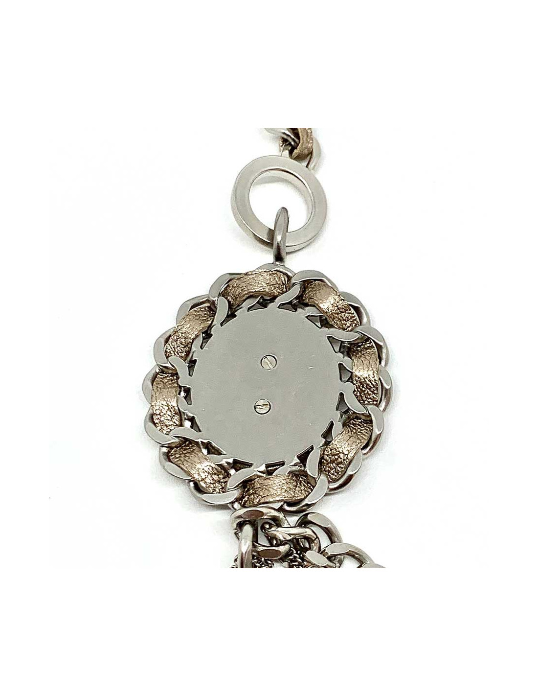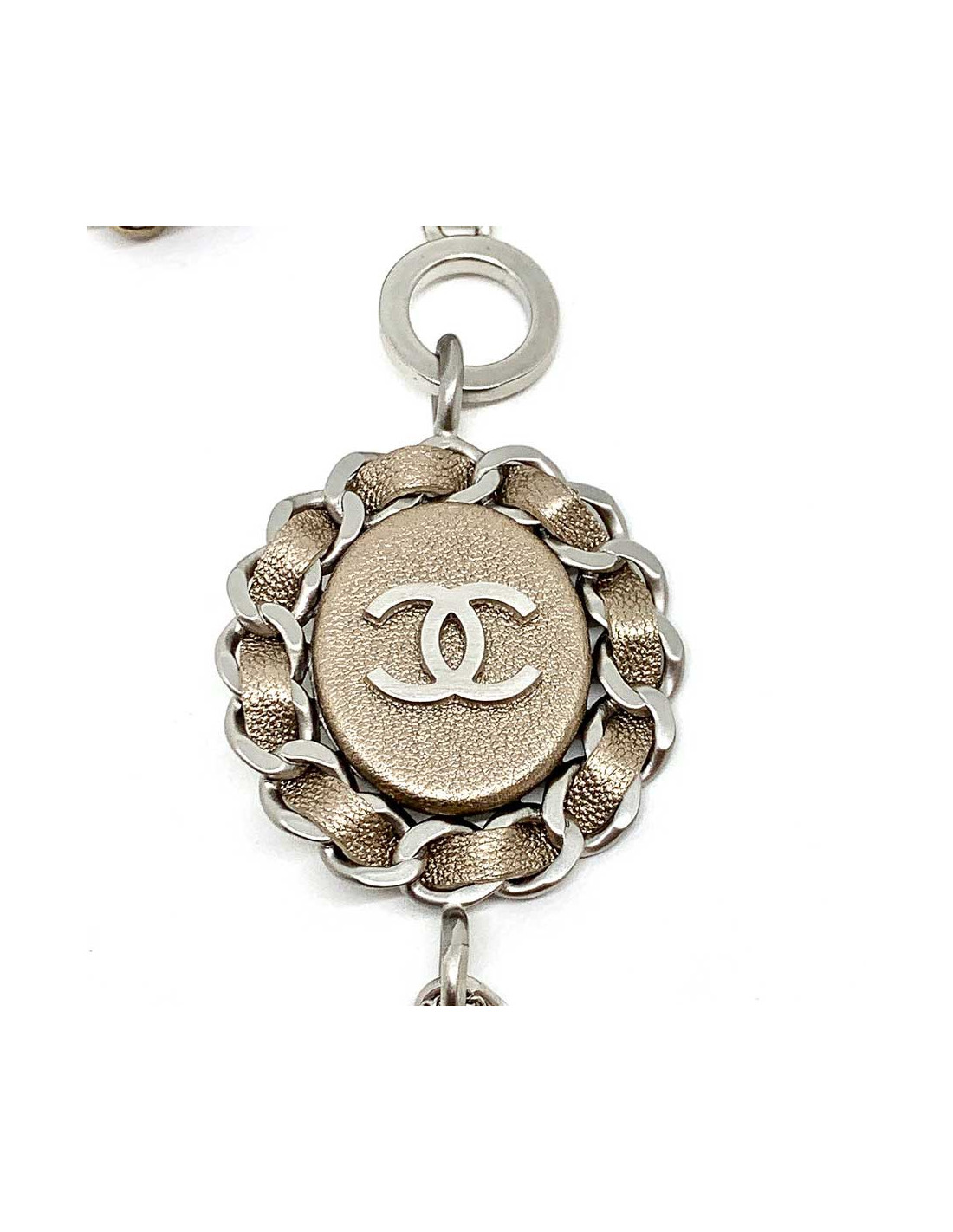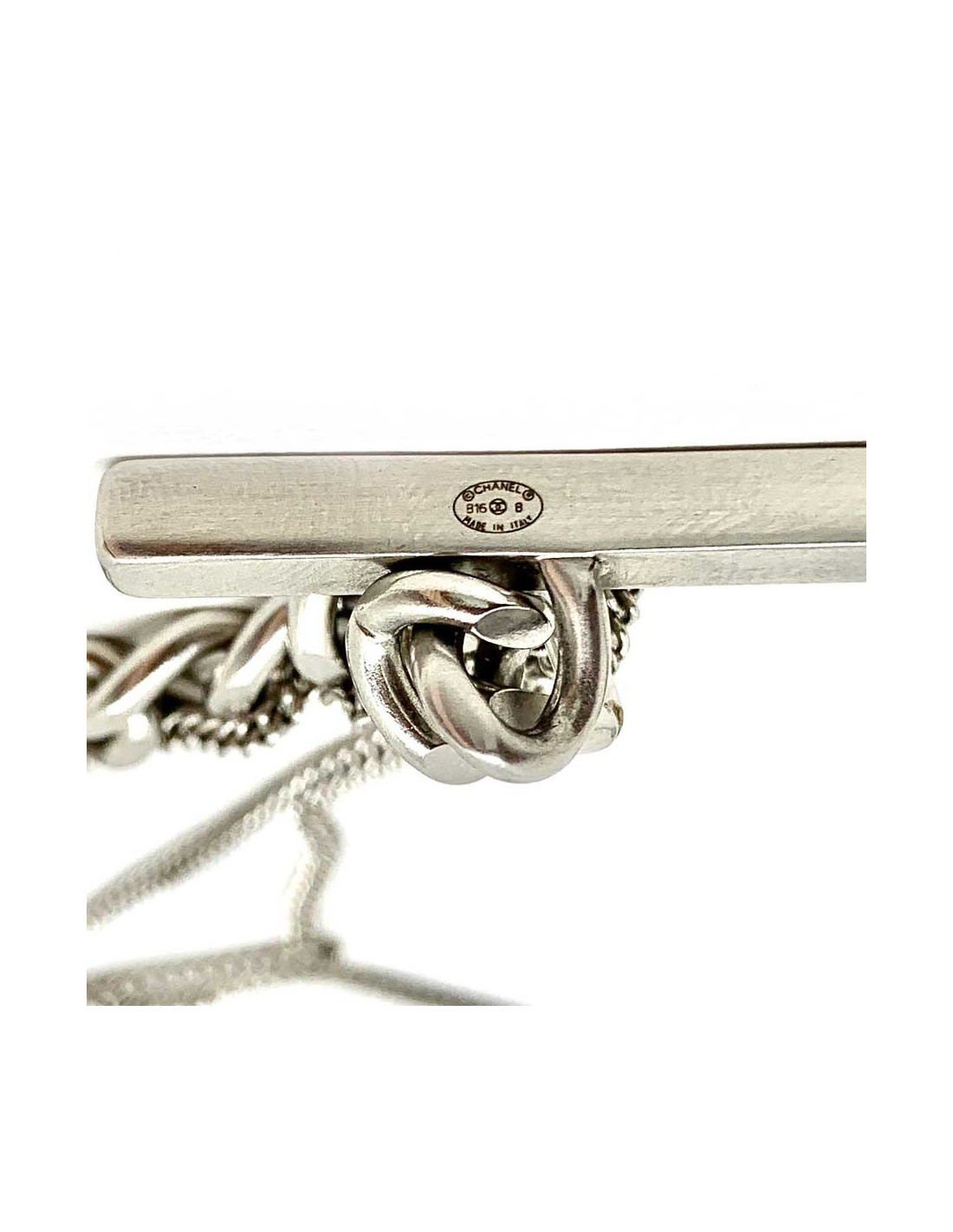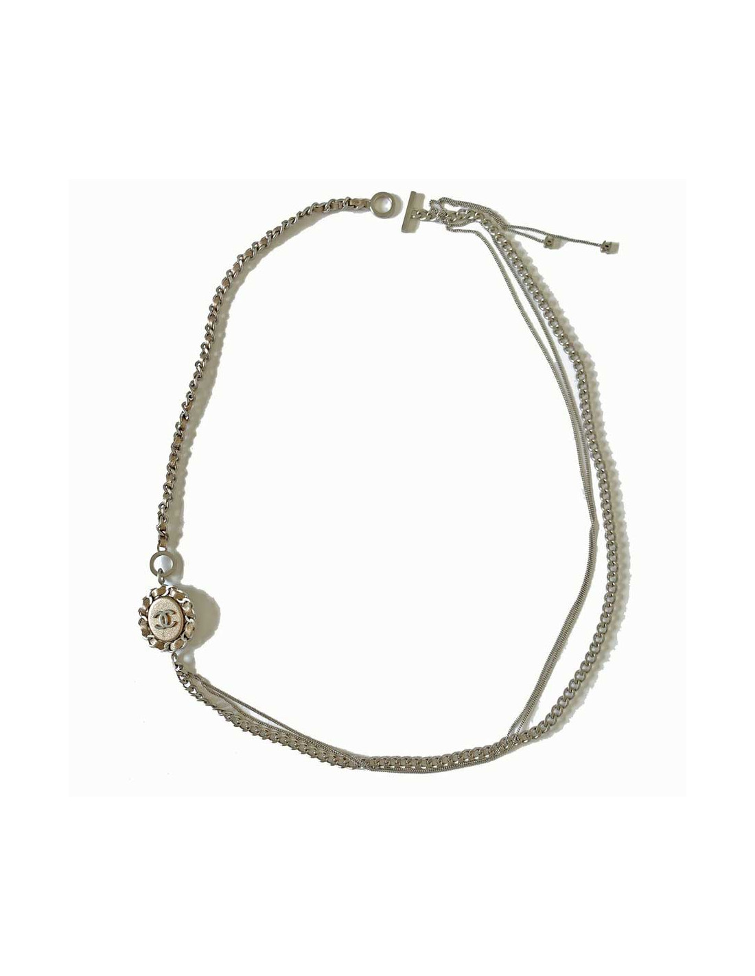 Last items in stock NECKLACES CHANEL ruthenium chain and pearly beads belt-necklace CHANEL 22057 1,200.00 € CHANEL belt in large matte ruthenium chain and pearls Made in FranceCondition: very goodMaterial: metal, pearly beadsColors: silver, mother-of-pearlHardware: mat ruthenium silver finish metalYear: Fall 2006Measurements: total length: 93cm, worn at its longest: 86.5cm, width: 1.5cmDetails: Chanel necklace-belt, large matte ruthenium metal chain, 3 pearly... Add to cart