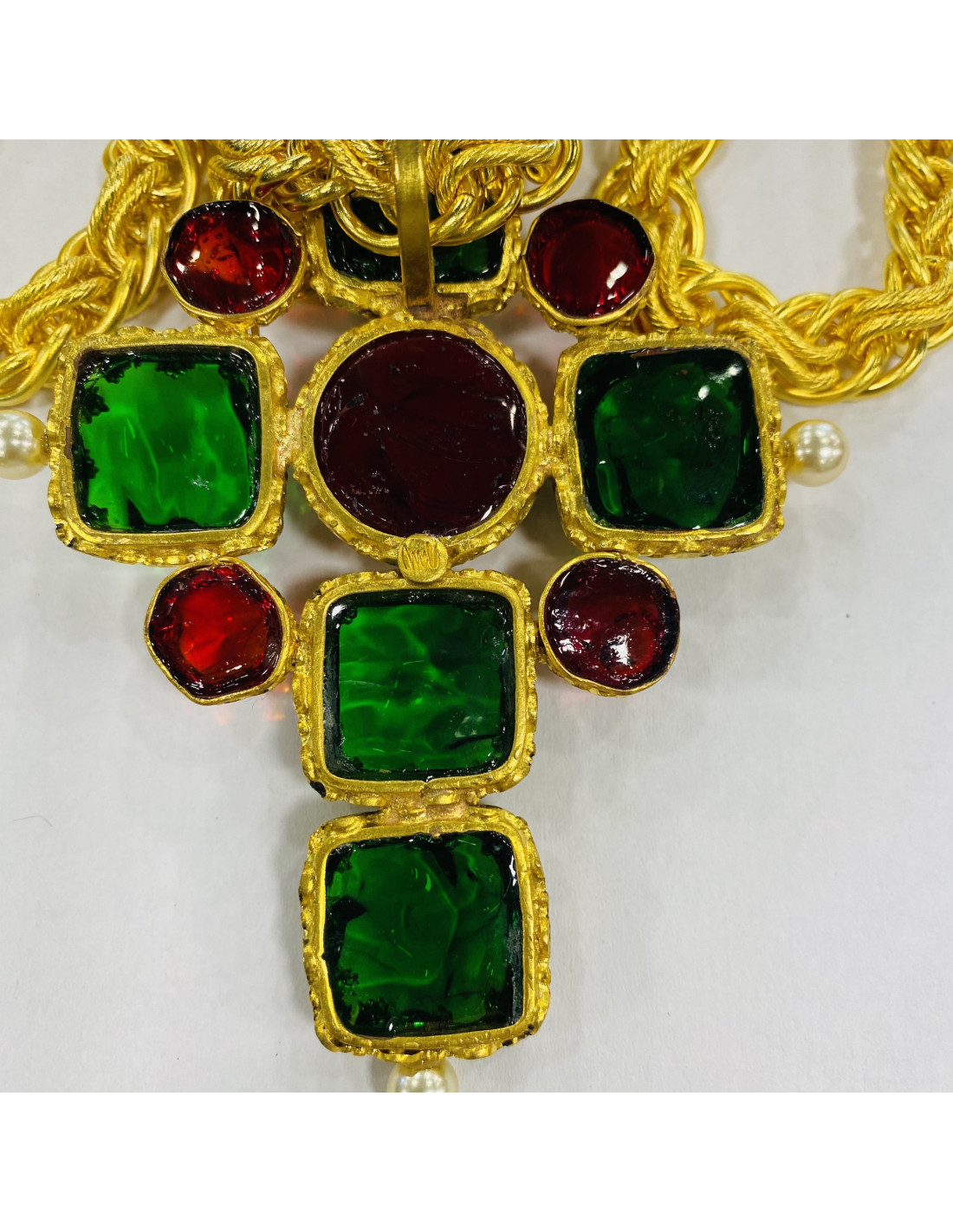 Last items in stock NECKLACES LOULOU DE LA FALAISE choker necklace in gilded metal and dove pendant in molten glass LOULOU DE LA FALAISE 21897 390.00 € Vintage. Loulou de La Falaise choker necklace in golden metal and brilliant Swarovski. It was manufactured at the time by the House Gripoix. The pendant represents a dove made of white molten glass. In very good condition. Size: short neck 35 cm, longer 41 cm, size of the jewel 4x3.5 cm. Will be delivered in a Valois Vintage Paris dustbag. Add to cart