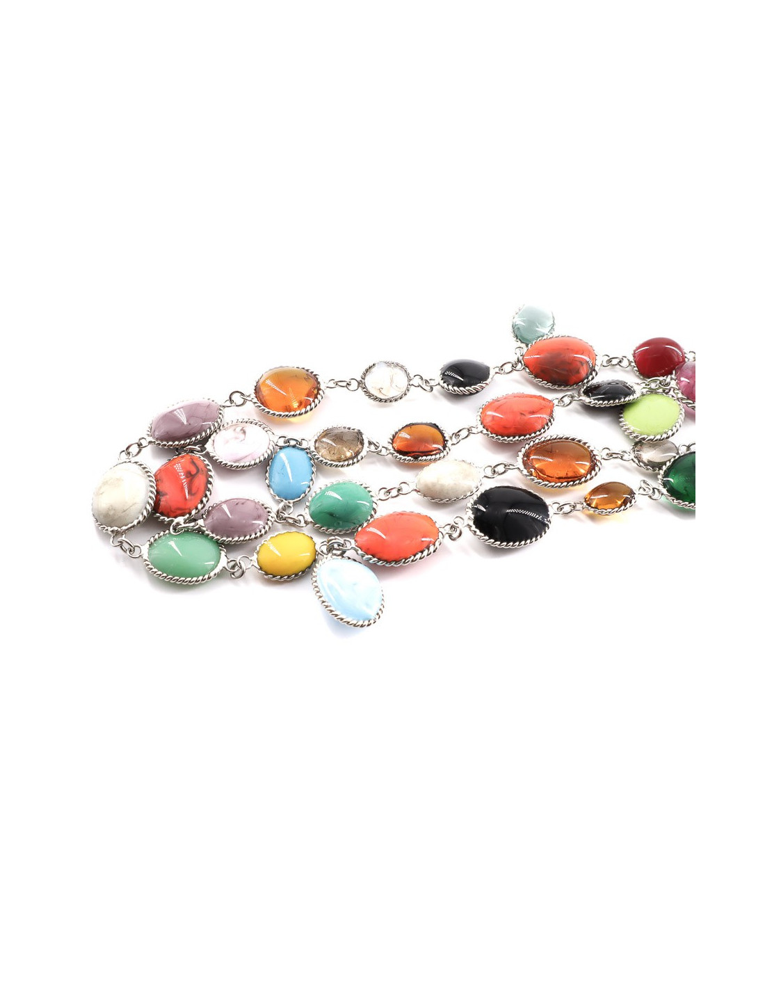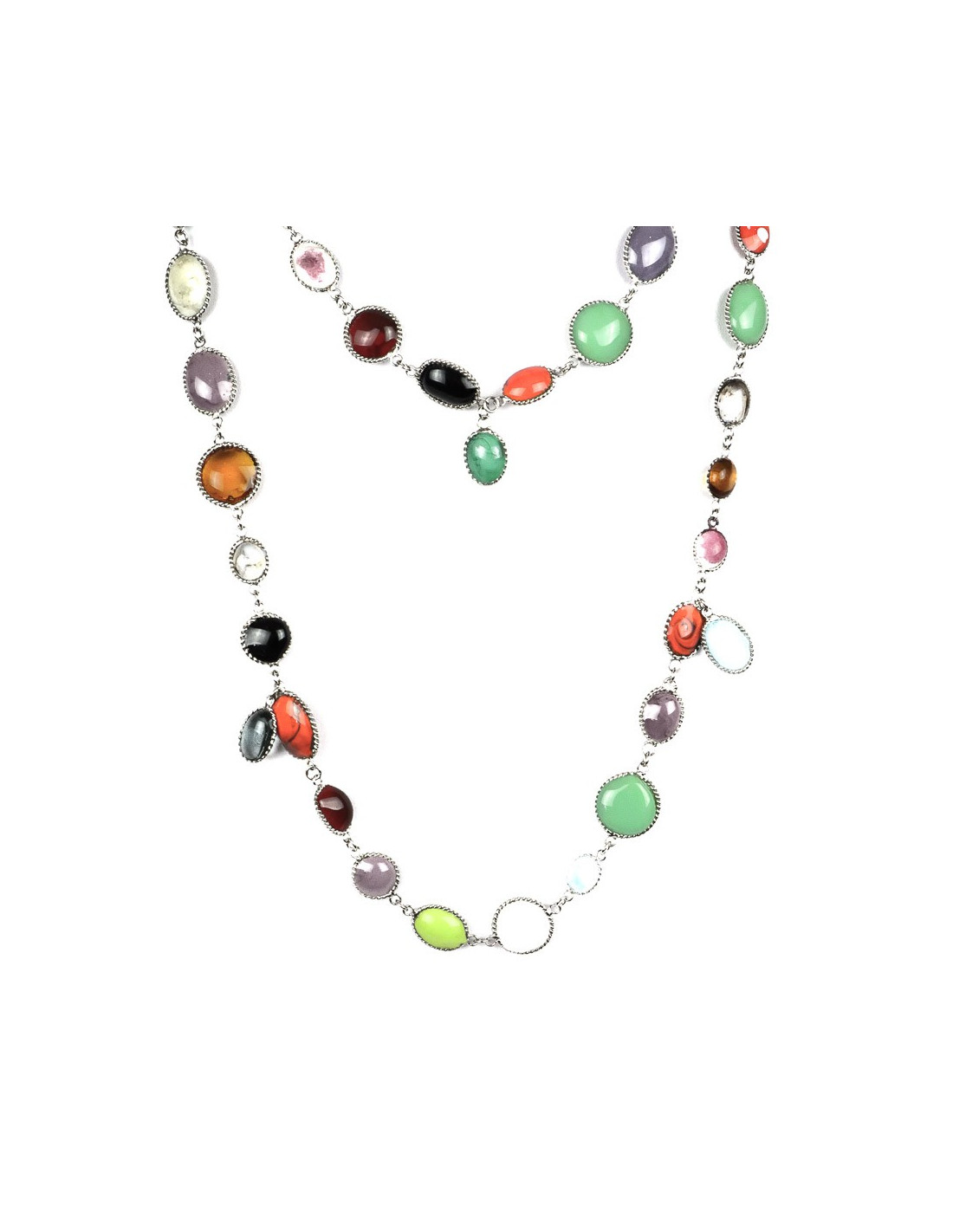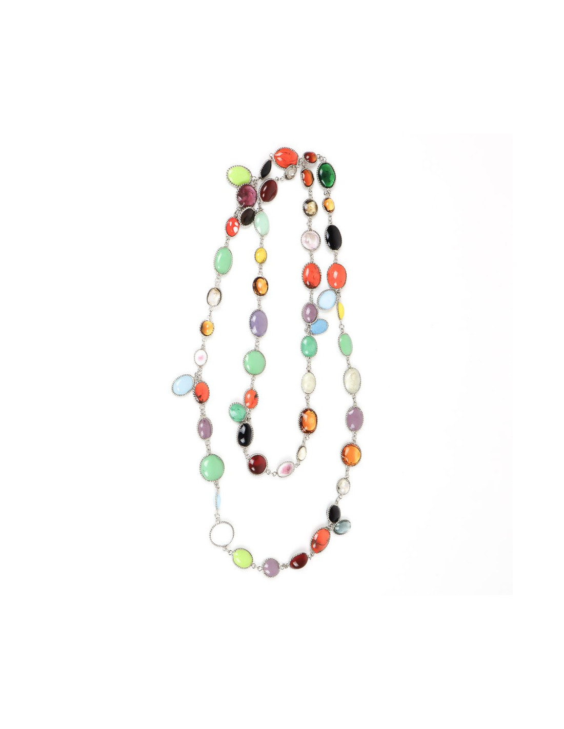 The long necklace is by Maison Marguerite de Valois, whose French craftsmen have worked for some of the world's top designers for over 40 years. The Maison offers us a magnificent long necklace in silver-plated metal with multicolored molten glass resin cabochons. We find blue, red, black, green, purple and orange cabochons.