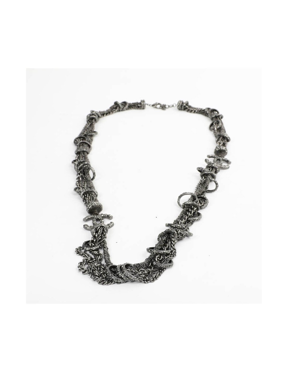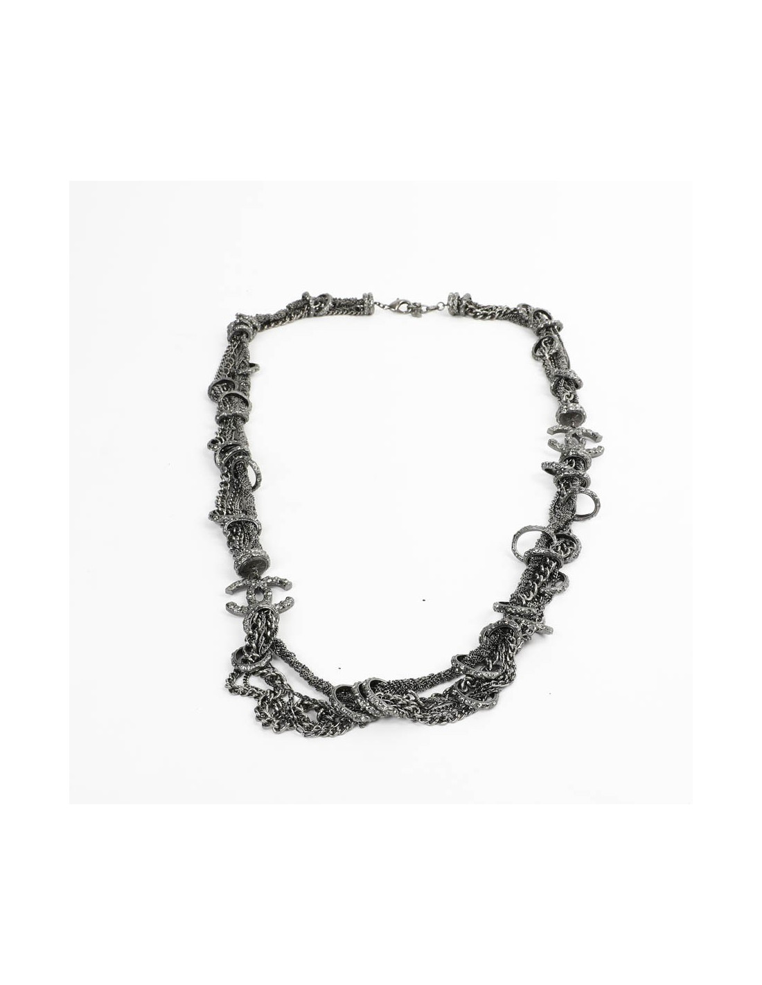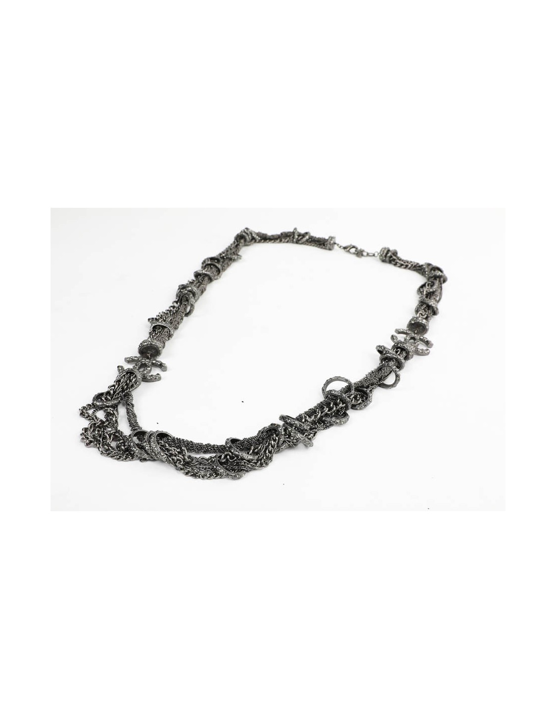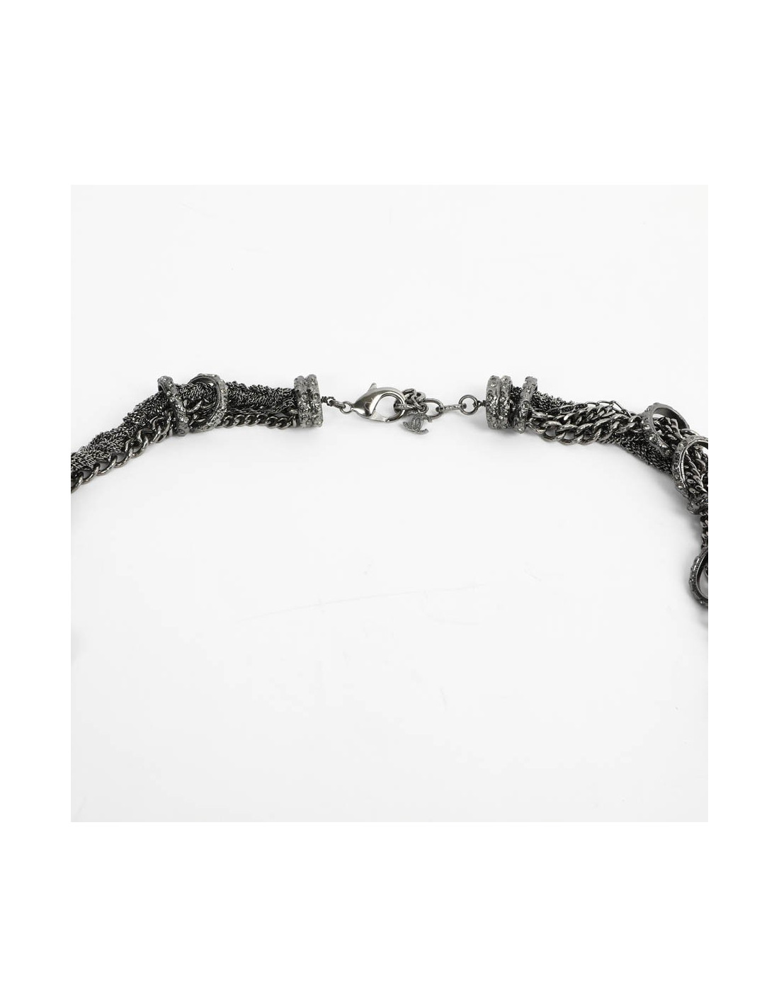 Last items in stock NECKLACES CHANEL couture ceremonial necklace CHANEL 33739 3,500.00 € CHANEL couture ceremonial necklace Condition : very goodMaterials : pearls, stones, resin, metalColors : black, burgundy, greyMeasurement : total length: 45 cmDetails : triple-row necklace with large pendant, CC on metal next to rhinestones. Baguette-cut rhinestones. Triple rows of stones and rhinestones. Add to cart