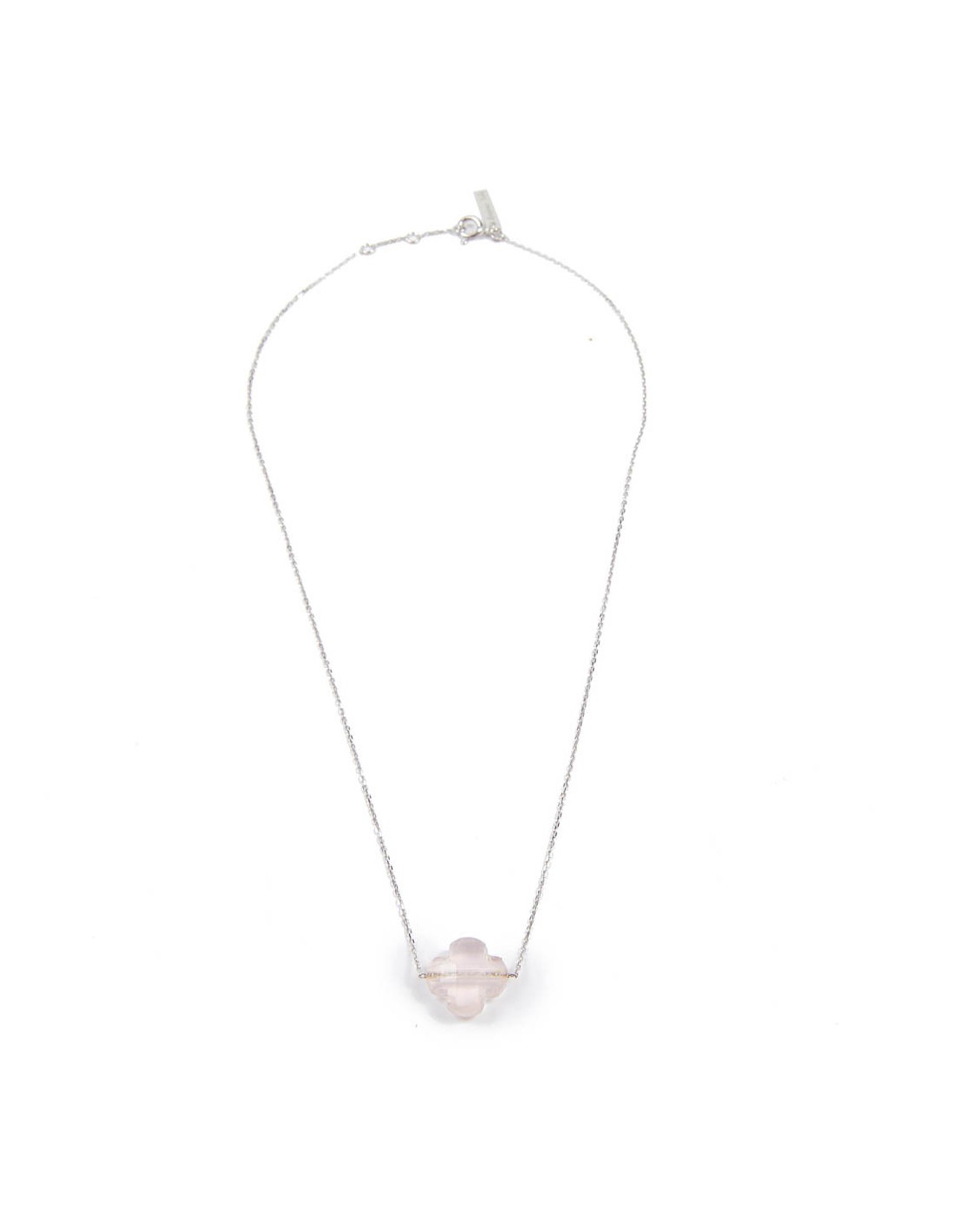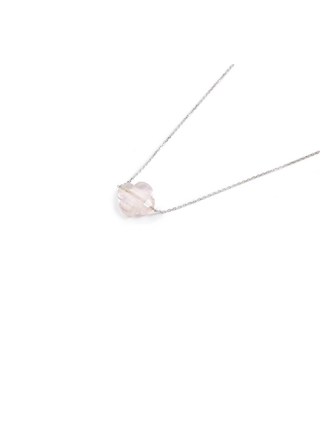 This necklace is very thin, and the clover is made of rose quartz. It is in white gold.