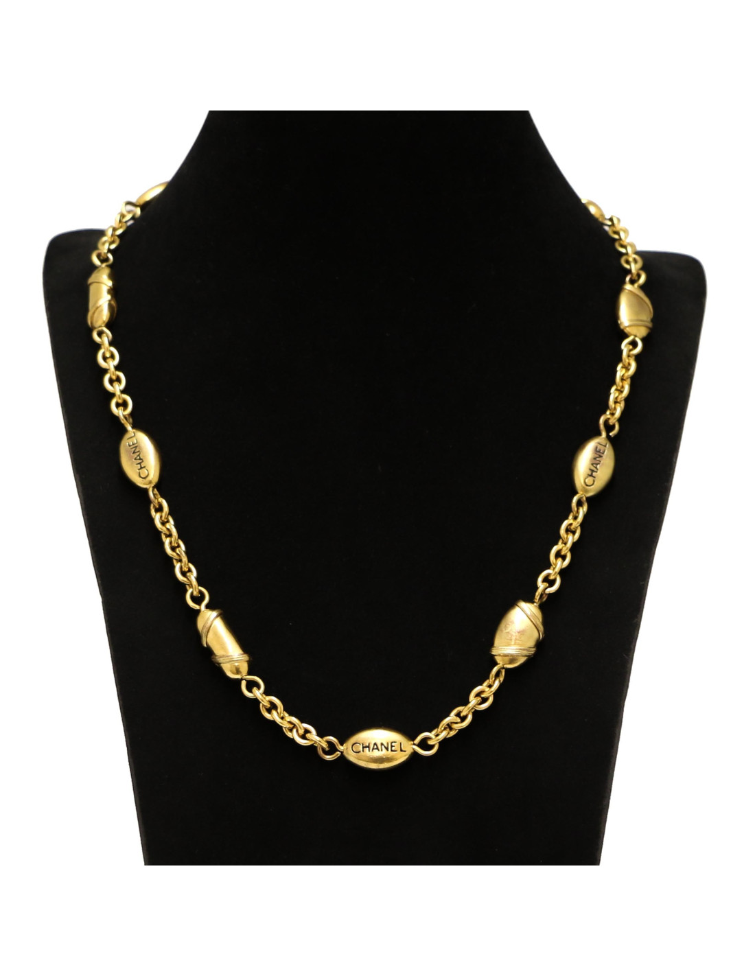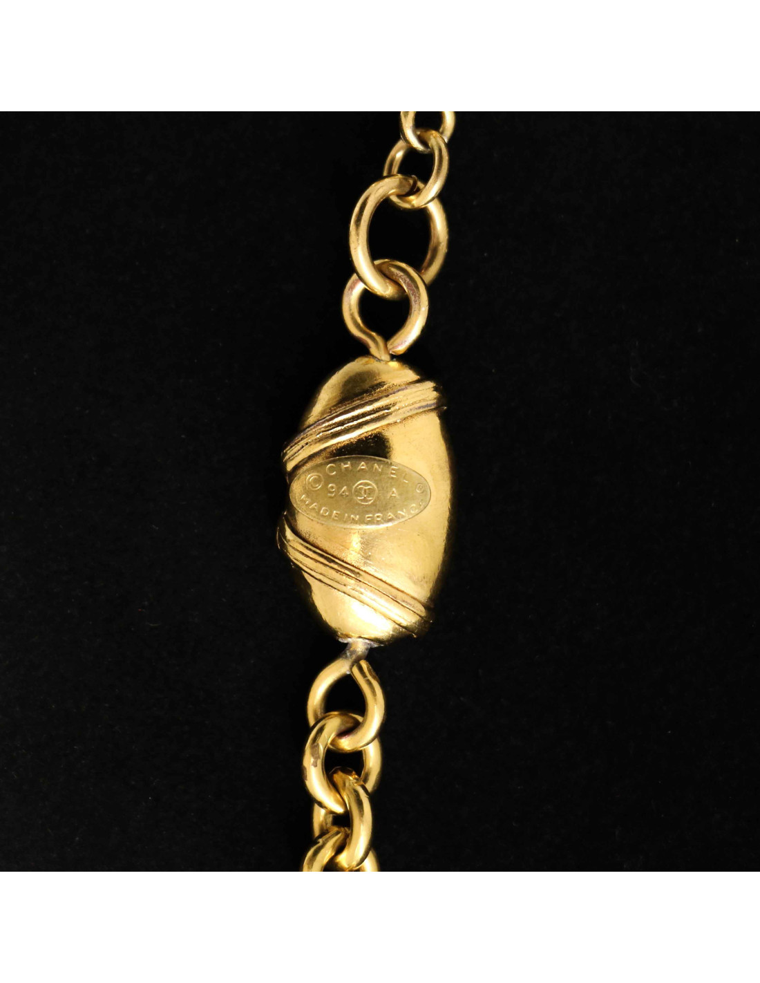 Last items in stock NECKLACES CHANEL pearl and gold bib necklace CHANEL 34334 2,850.00 € CHANEL mother-of-pearl beads and gold bib necklace Condition : very goodMade in FranceMaterials : metal, pearly beadsColor : goldMeasurements : length (adjustable) up to 40 cm, pendant : 15 cmHardware : gold finish metalStamp : yesYear : Spring 2002Details : CC pendant on the clasp, rigid choker with dangling beaded chains. Advantage Valois Vintage Paris... Add to cart