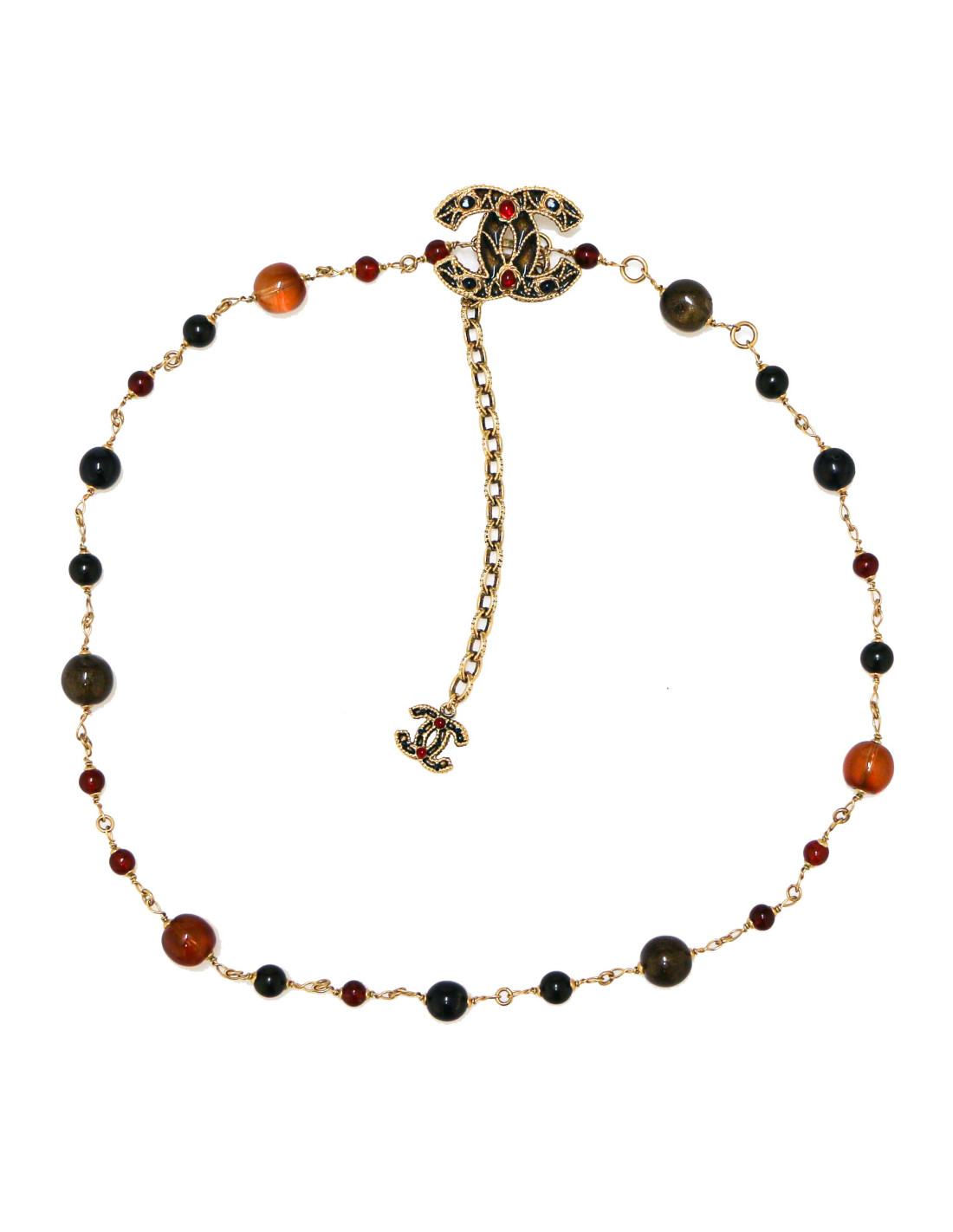 Last items in stock NECKLACES CHANEL couture ceremonial necklace CHANEL 33739 3,500.00 € CHANEL couture ceremonial necklace Condition : very goodMaterials : pearls, stones, resin, metalColors : black, burgundy, greyMeasurement : total length: 45 cmDetails : triple-row necklace with large pendant, CC on metal next to rhinestones. Baguette-cut rhinestones. Triple rows of stones and rhinestones. Add to cart