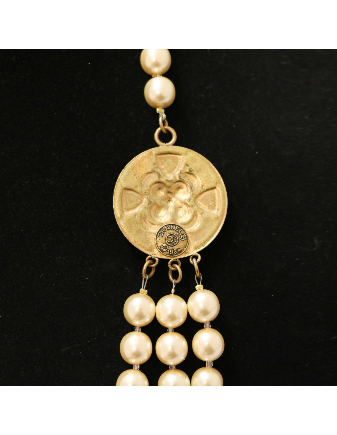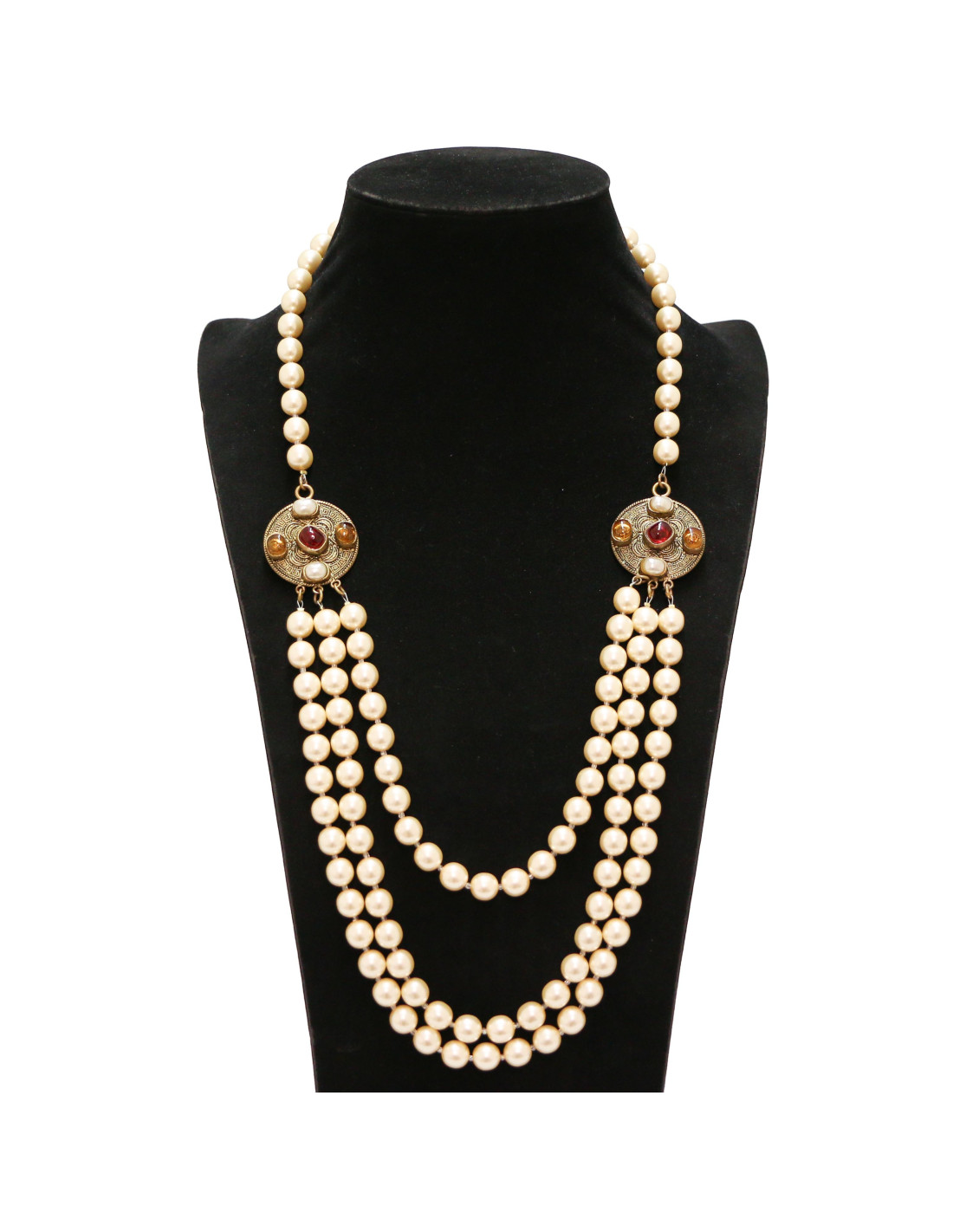 Details : triple rows, 2 metal medallions with pearls and glass paste. Hook clasp.