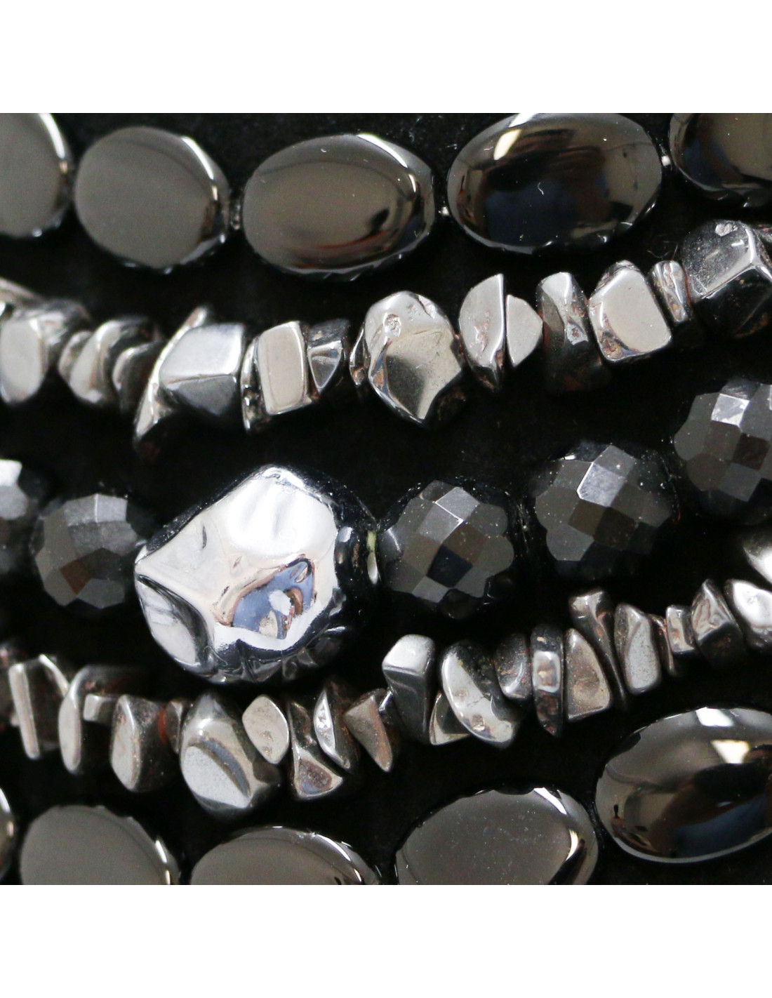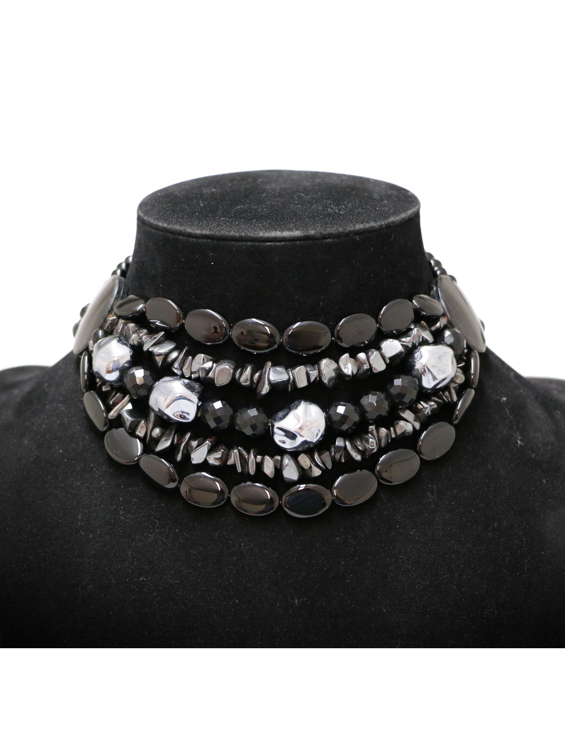 Details : short/choker necklace with five rows of various black, silver and gunmetal gray pearls.