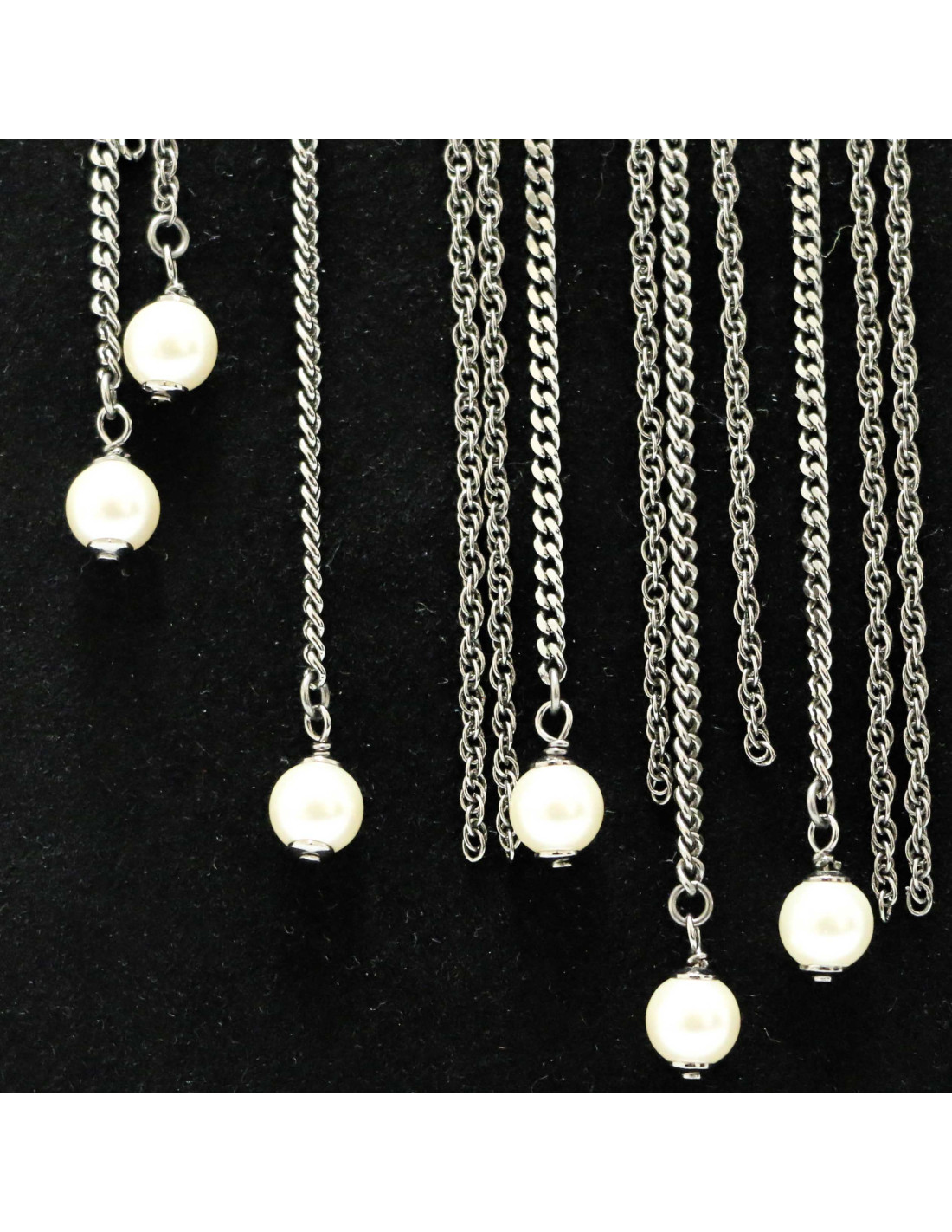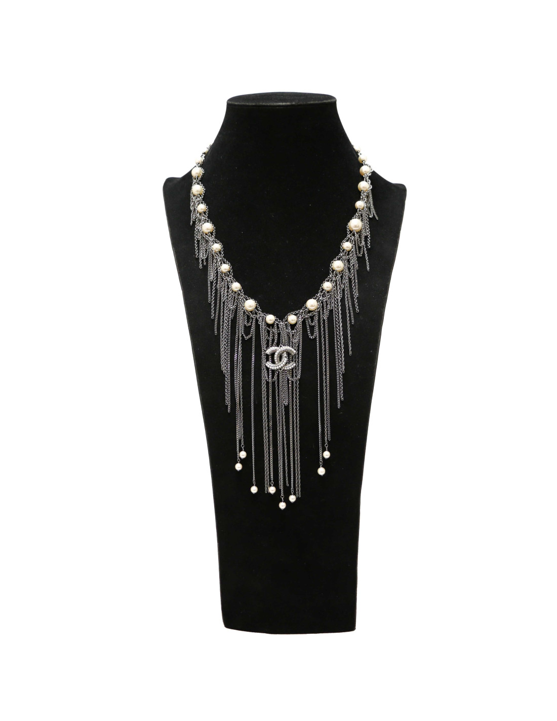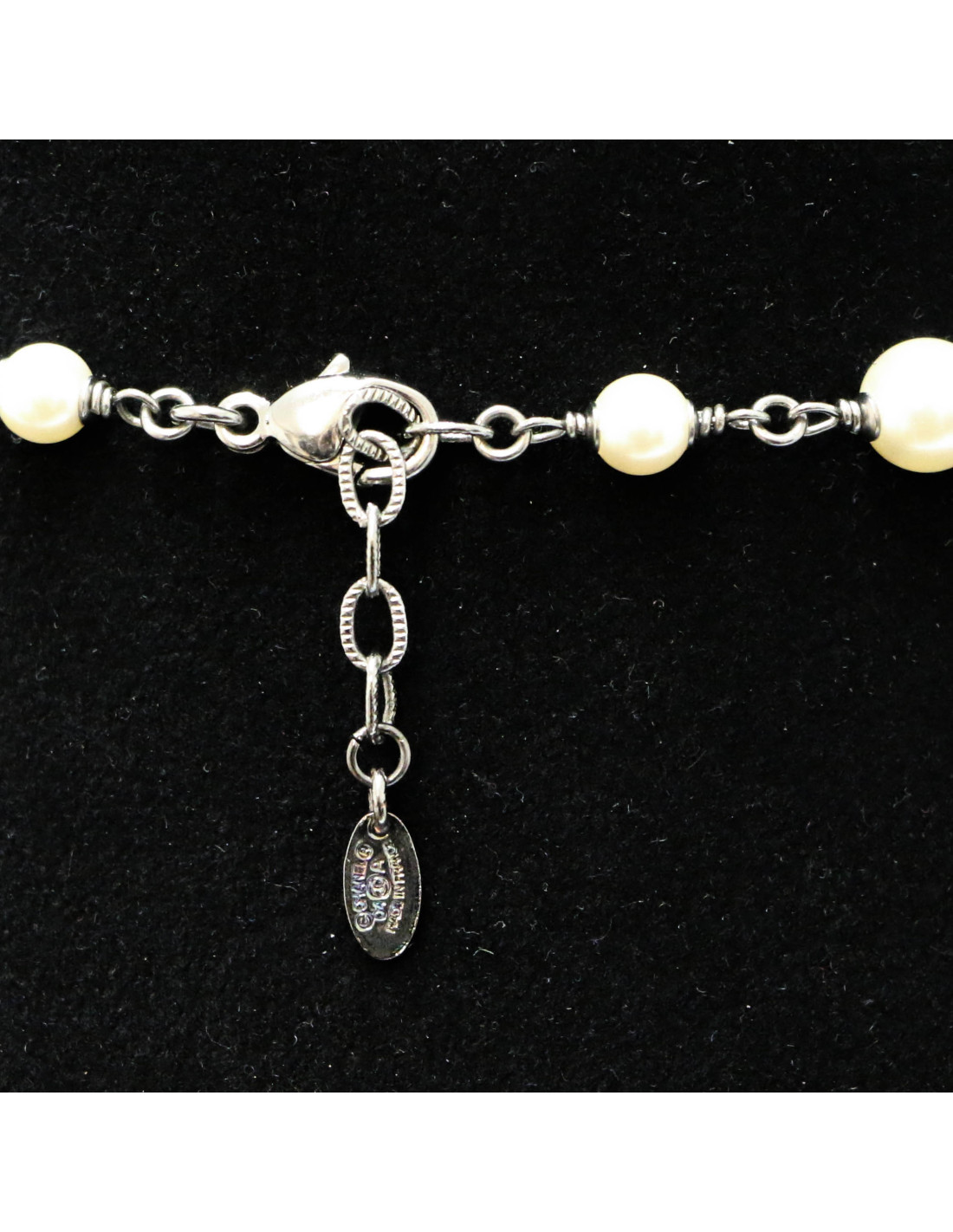 Last items in stock NECKLACES CHANEL ruthenium chain and pearly beads belt-necklace CHANEL 22057 1,200.00 € CHANEL belt in large matte ruthenium chain and pearls Made in FranceCondition: very goodMaterial: metal, pearly beadsColors: silver, mother-of-pearlHardware: mat ruthenium silver finish metalYear: Fall 2006Measurements: total length: 93cm, worn at its longest: 86.5cm, width: 1.5cmDetails: Chanel necklace-belt, large matte ruthenium metal chain, 3 pearly... Add to cart