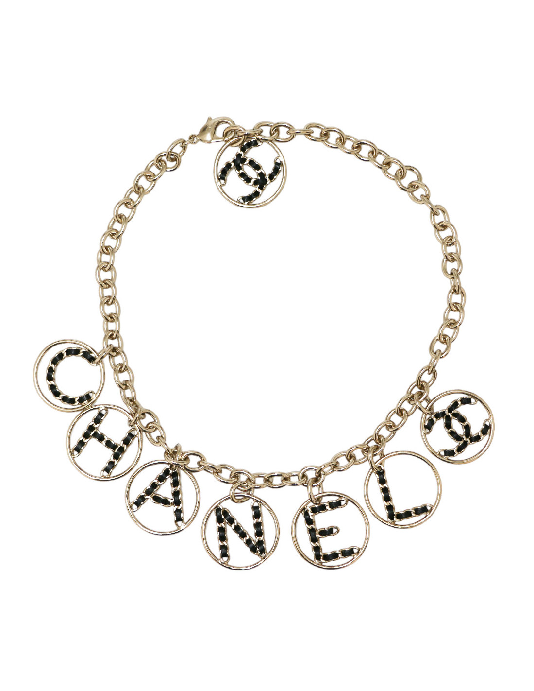 Details : the necklace is adjustable, circles with letters and Chanel logo in metal interlaced with leather