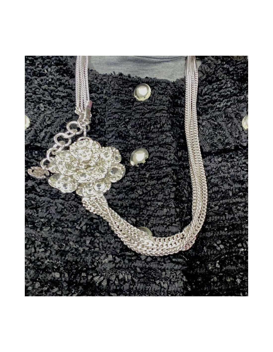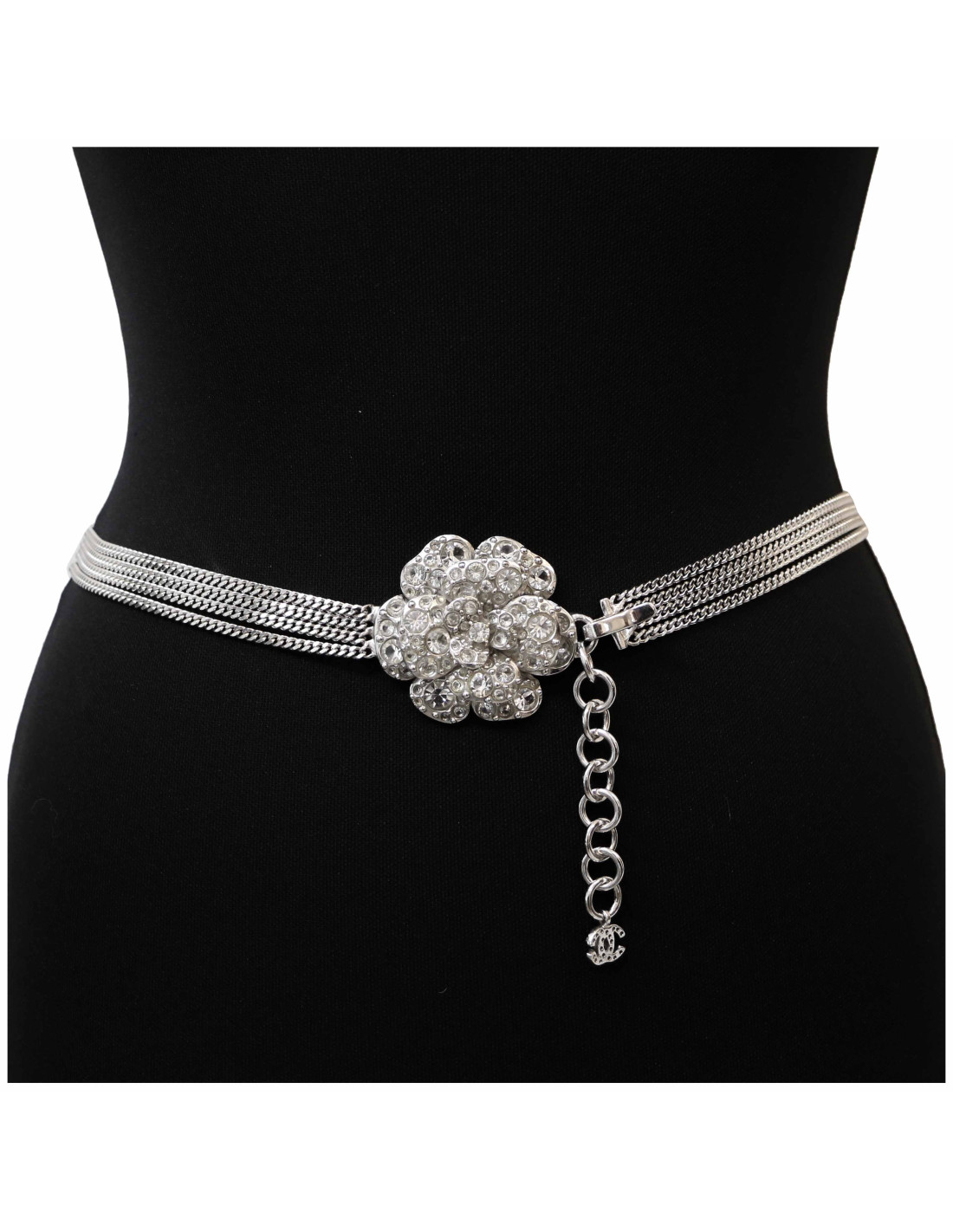 Details : four rows of chains, camellia size 6 x 5 cm, worn as a belt or necklace.