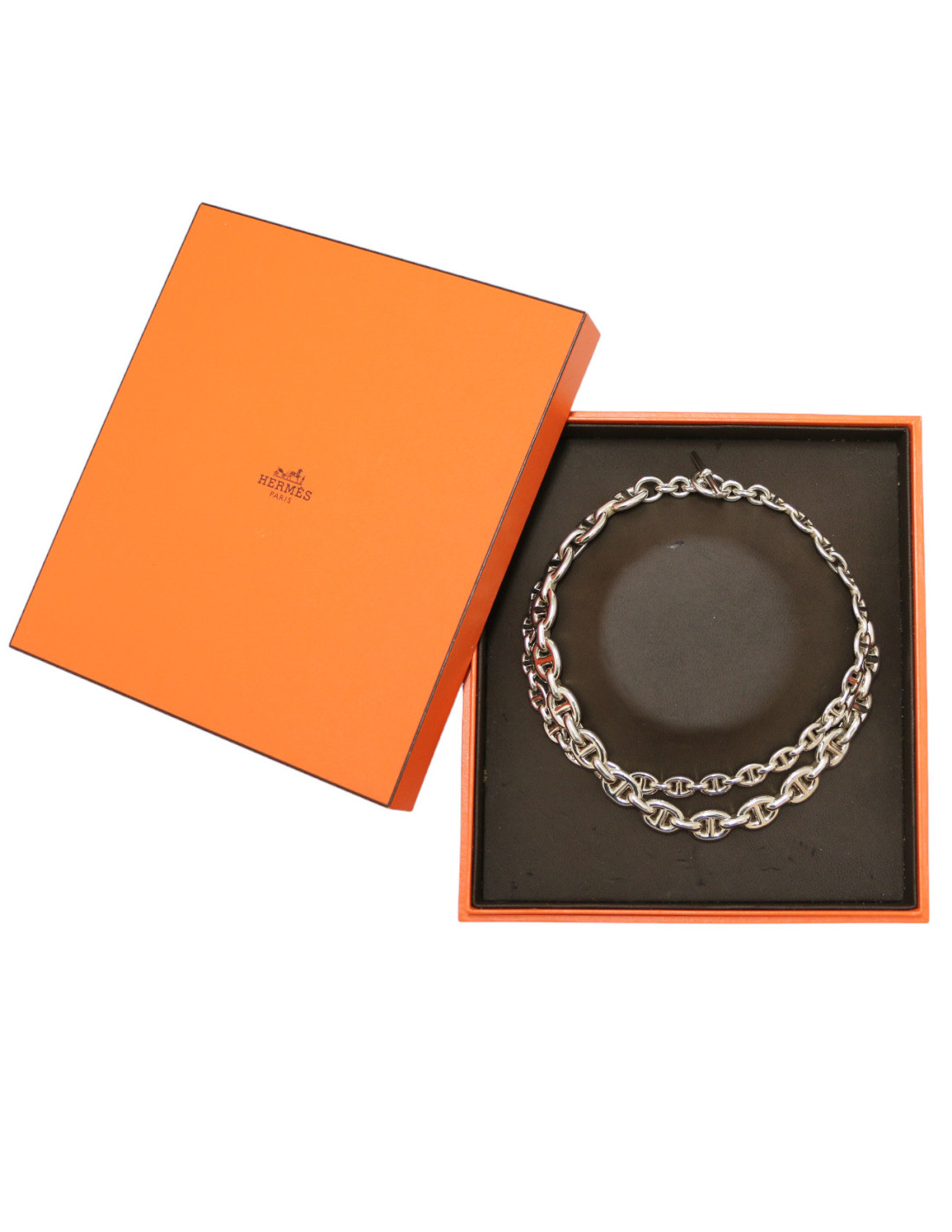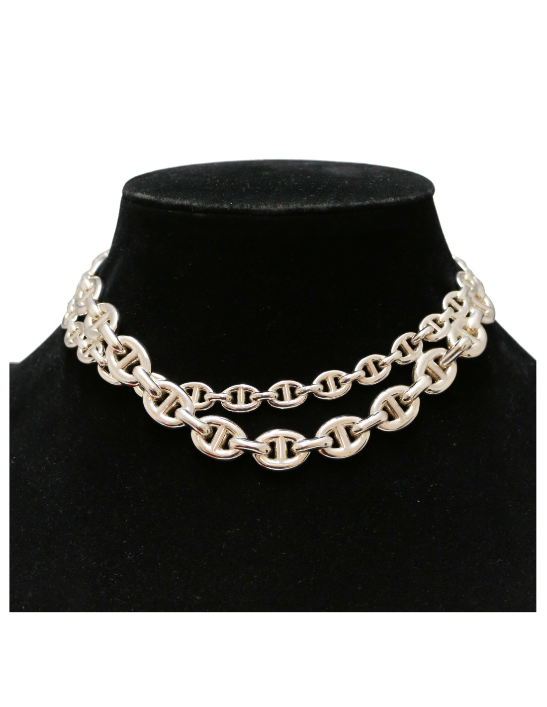 Details : This semi-rigid “Chaîne d'Ancre Enchaînée” choker is made of sterling silver, and this revisited version breaks away from its origins. It's named this way because two chains meet and cross to form a single chain. The ring-and-stick clasp is one of Hermès' signature features.