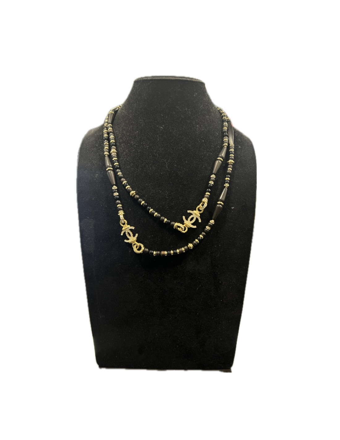 Last items in stock NECKLACES CHANEL couture ceremonial necklace CHANEL 33739 3,500.00 € CHANEL couture ceremonial necklace Condition : very goodMaterials : pearls, stones, resin, metalColors : black, burgundy, greyMeasurement : total length: 45 cmDetails : triple-row necklace with large pendant, CC on metal next to rhinestones. Baguette-cut rhinestones. Triple rows of stones and rhinestones. Add to cart