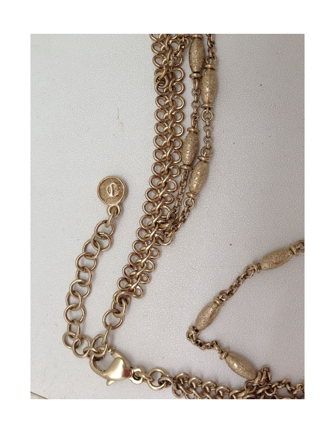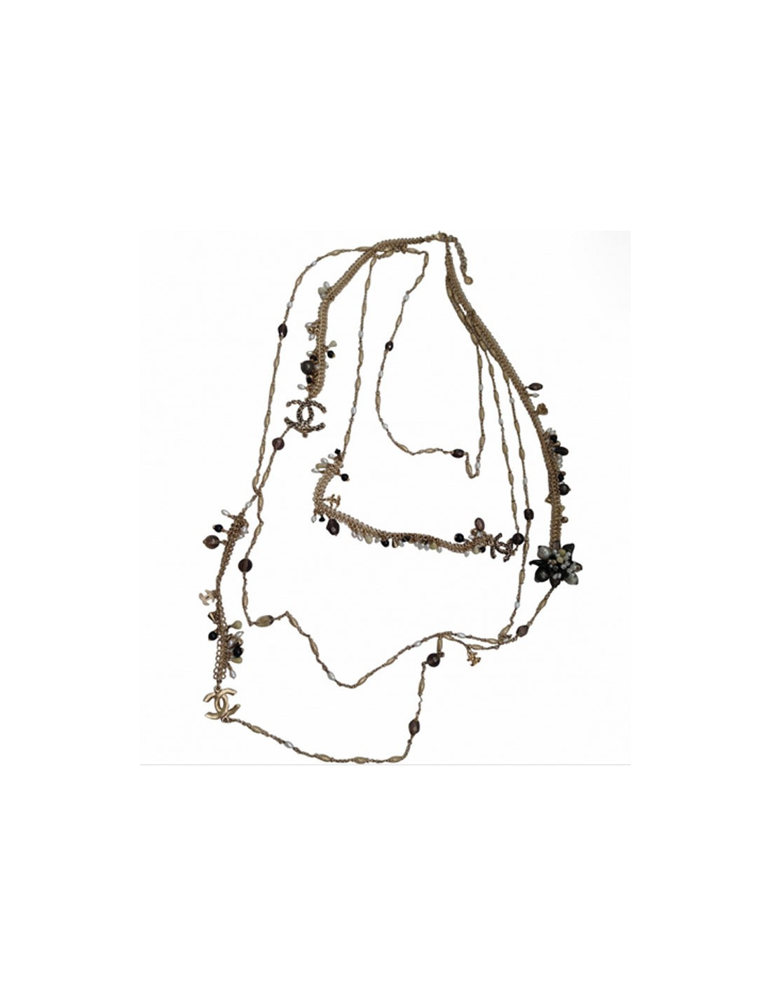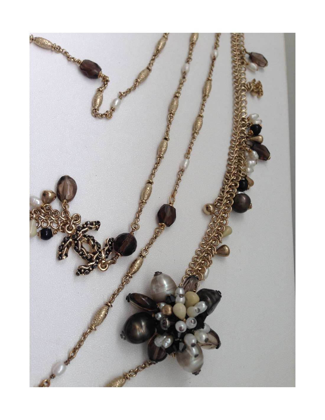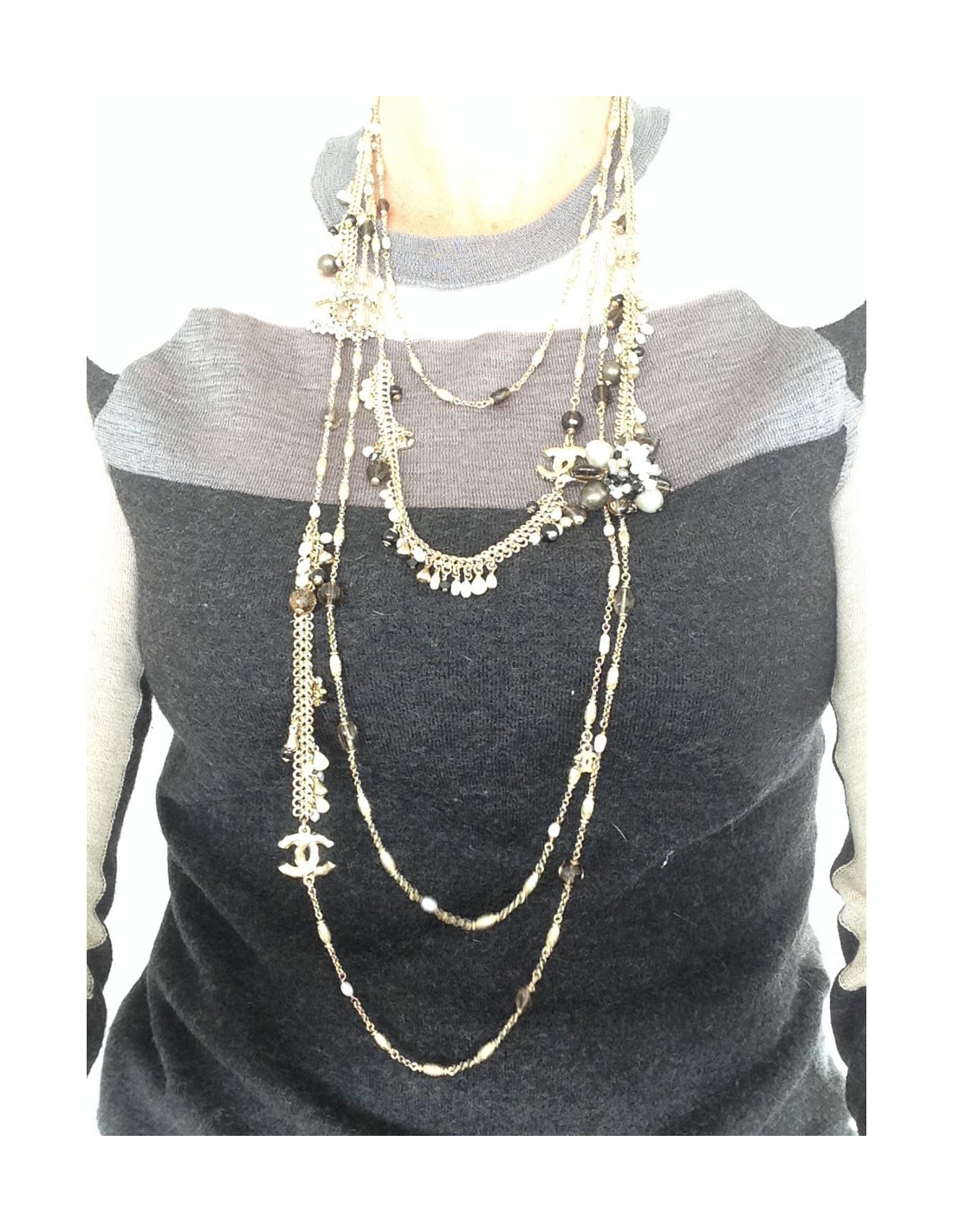 Quadruple jumper ranks Chanel metal fine gilded, two types of strings on this Saltire, surmounted Pearly Pearl, black, faceted smoky gray, CC in rhinestone and a flower jewel composed of beads all different. This quadruple jumper has the advantage of always stay in place because the four channels are welded, they therefore do not turn, Saltire is chest.