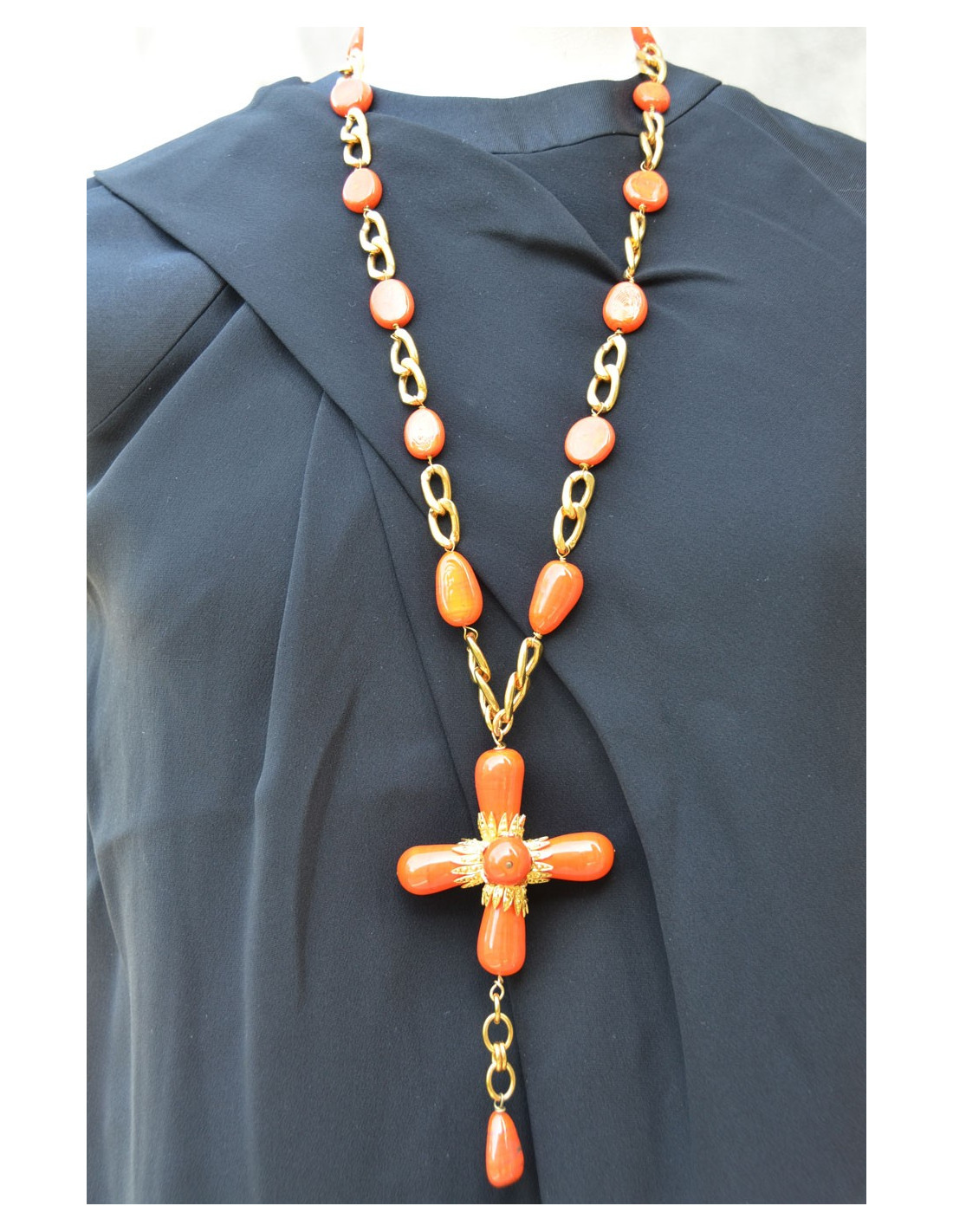 Saltire cross Marguerite de Valois in coral glass and metal gold fine gold.