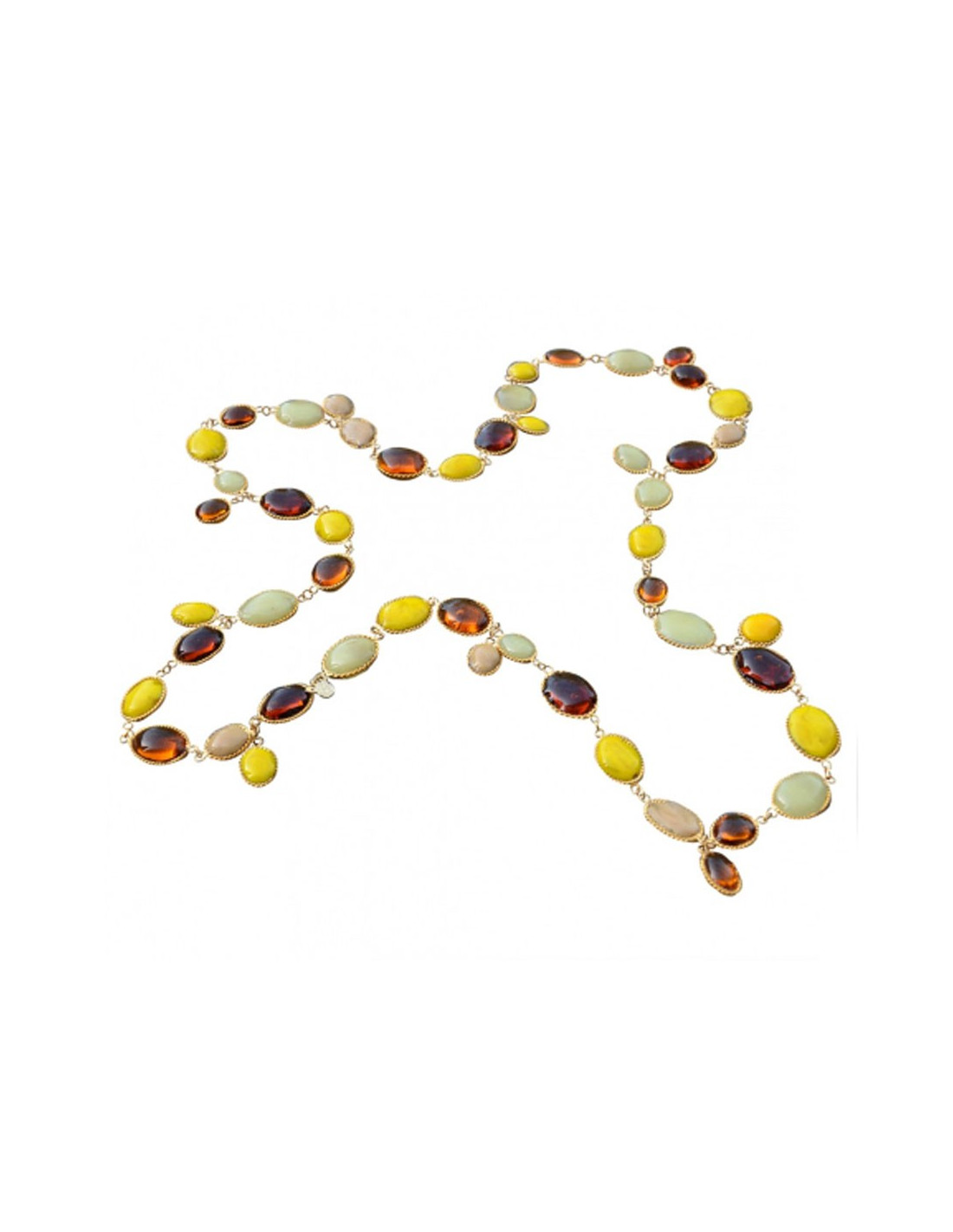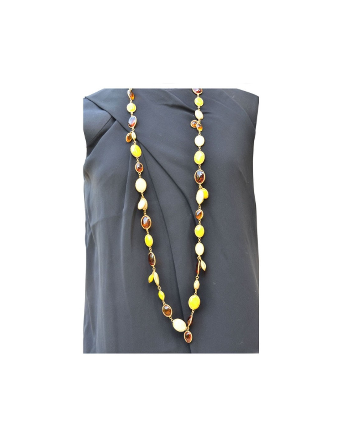 Superb Saltire Marguerite de Valois, in yellow, pale yellow and amber glass cabochons, mounted on metal gilded end 1000th public price. Directed by hand and in France by craftsmen jewellers of the House Marguerite de Valois. Total length: 120 cm or 60 cm door Delivered in his Patil. Published in Vogue Australia (see last photo)