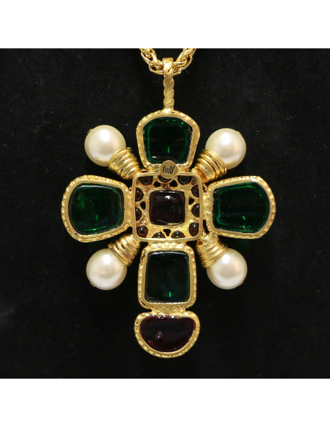 Last items in stock NECKLACES CHANEL pearl and gold bib necklace CHANEL 34334 2,850.00 € CHANEL mother-of-pearl beads and gold bib necklace Condition : very goodMade in FranceMaterials : metal, pearly beadsColor : goldMeasurements : length (adjustable) up to 40 cm, pendant : 15 cmHardware : gold finish metalStamp : yesYear : Spring 2002Details : CC pendant on the clasp, rigid choker with dangling beaded chains. Advantage Valois Vintage Paris... Add to cart