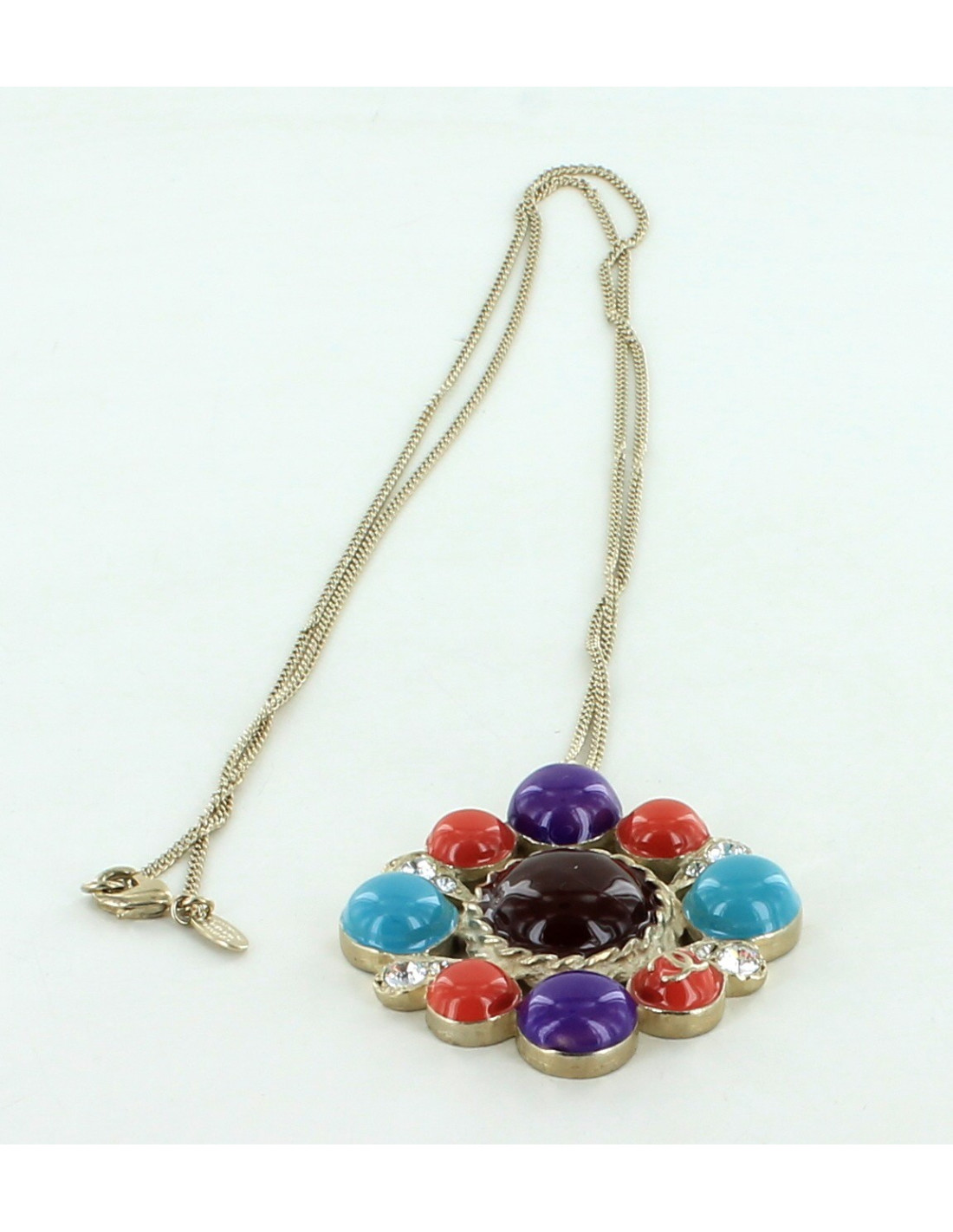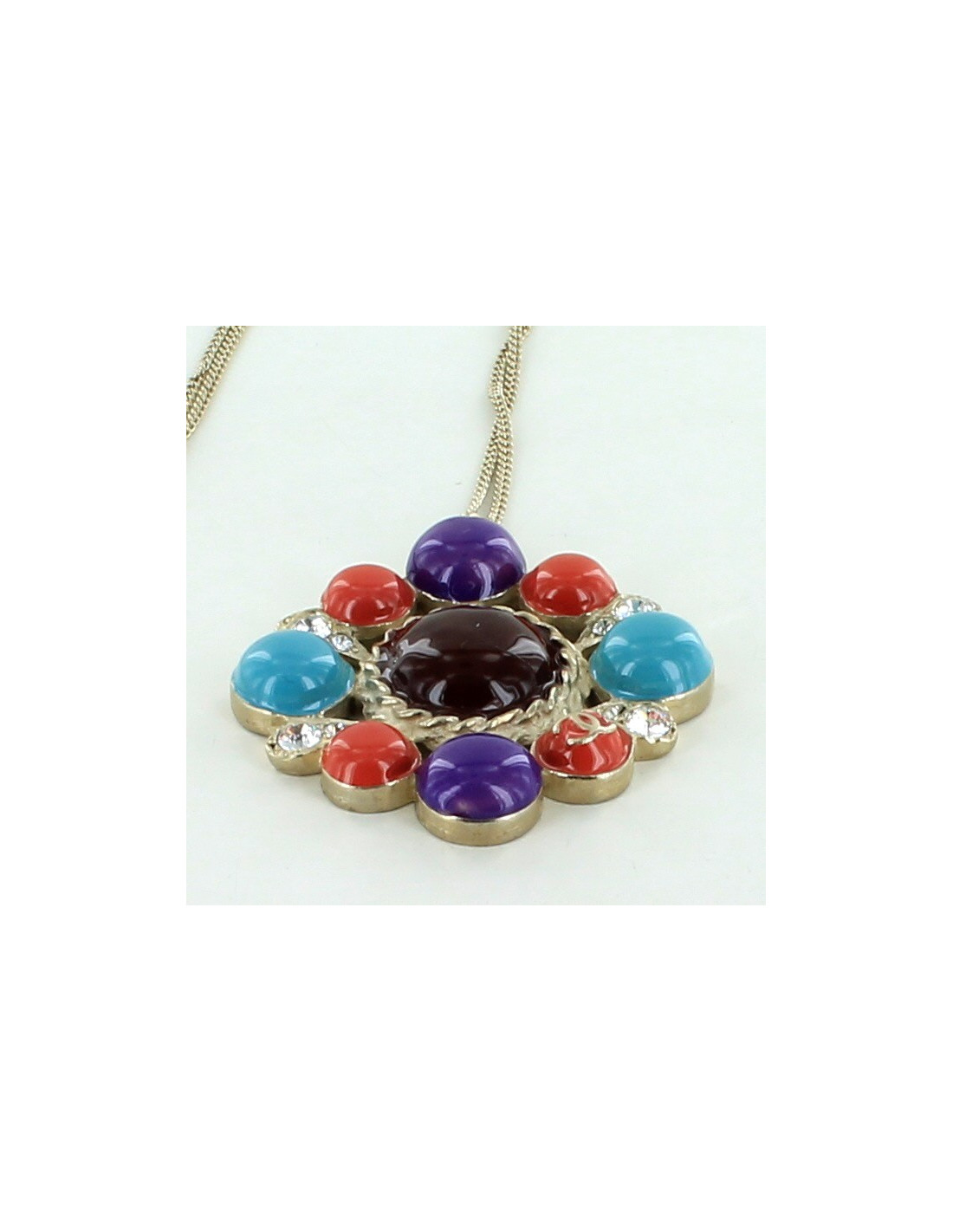 Beautiful multicolor necklace resin CHANEL, purple, turquoise, coral, Plum in the centre and 4 rhinestones on the sides.