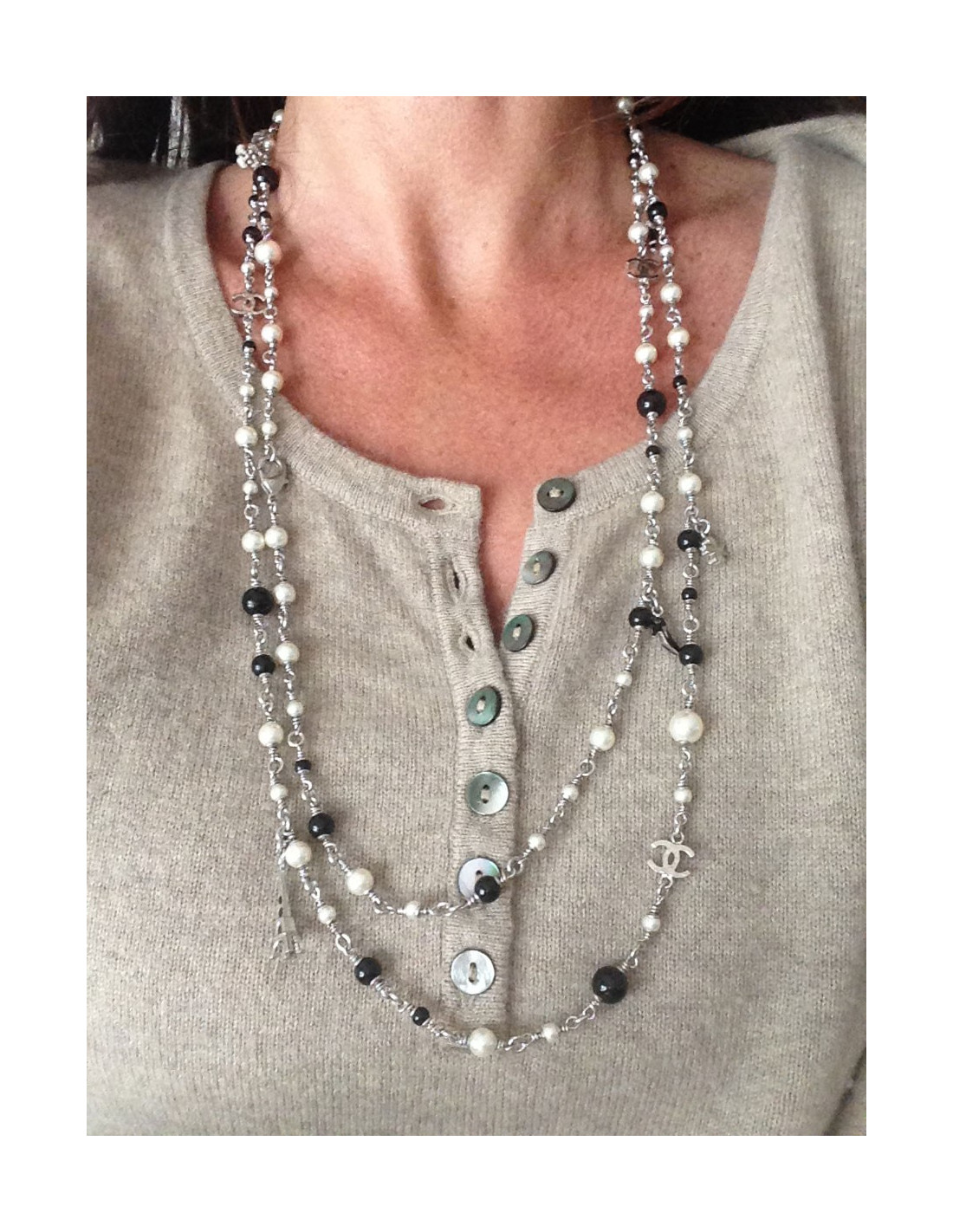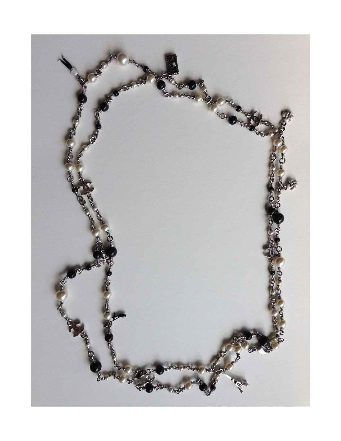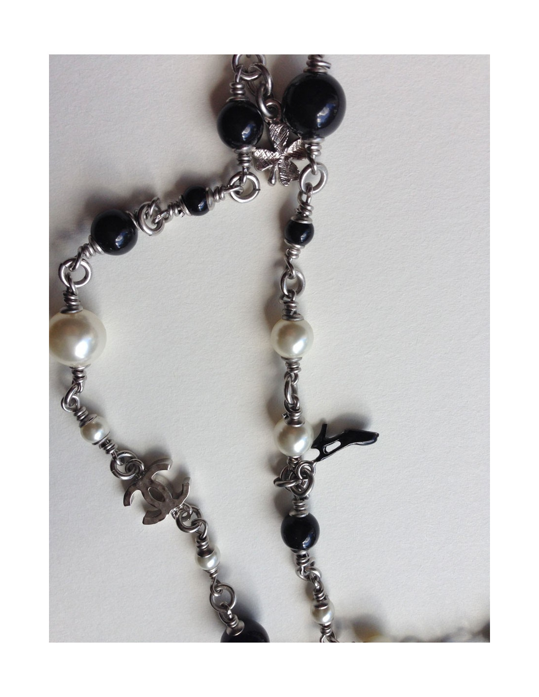 Chanel necklace you like them! It is composed of pearls black and Pearl and especially of small symbols, such as the famous Camellia, Coco, a black shoe, the Eiffel Tower, a bag Chanel quilted, clovers, and finally two c. silver coloured chain.