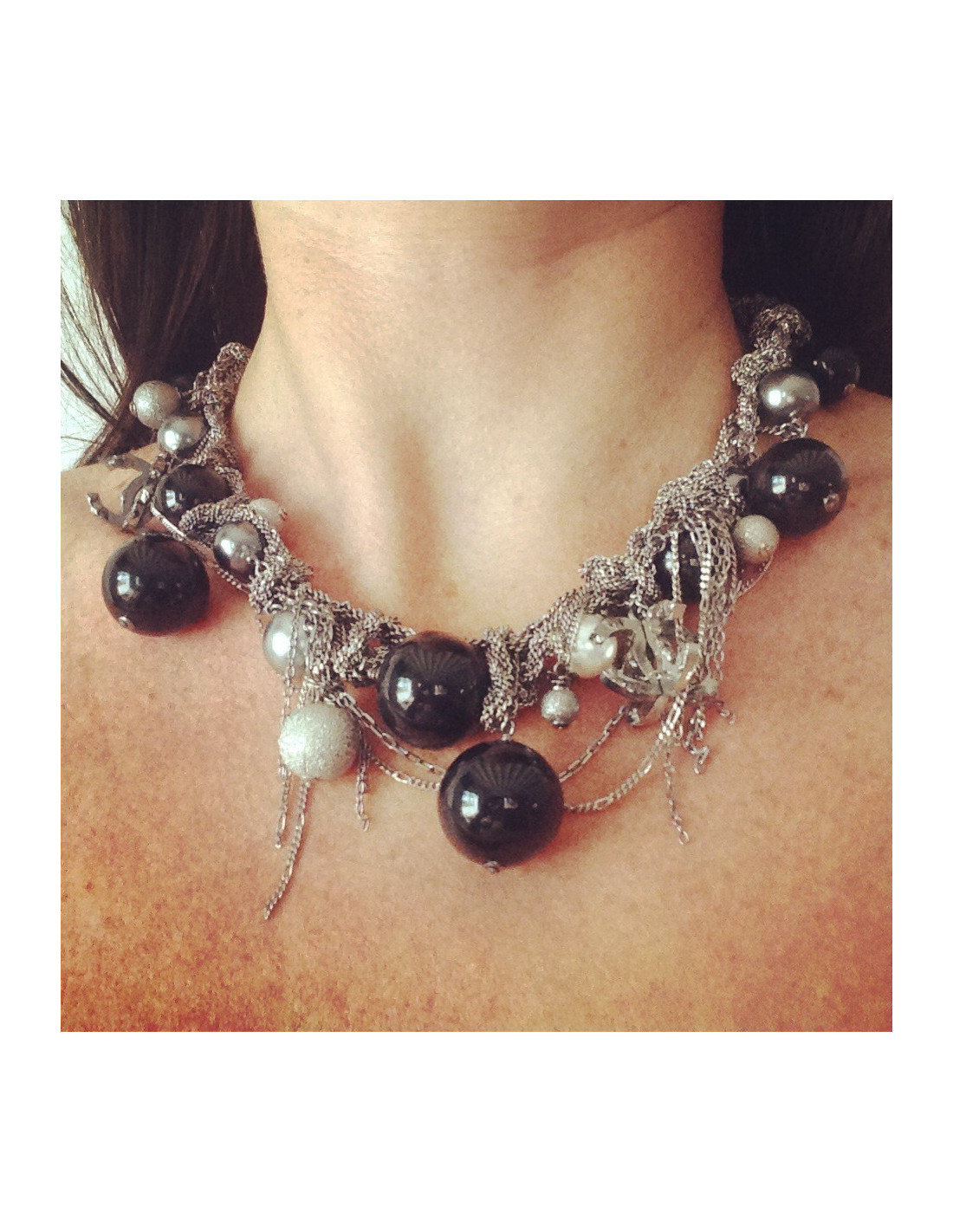 Necklace CHANEL chains ruthenium, pearls and CC