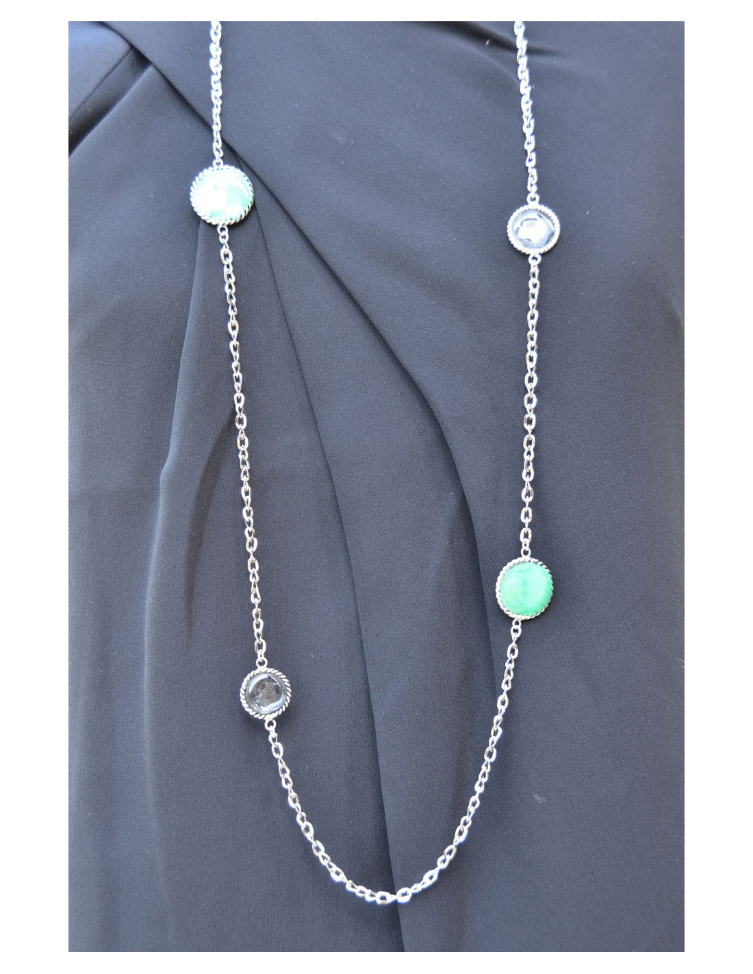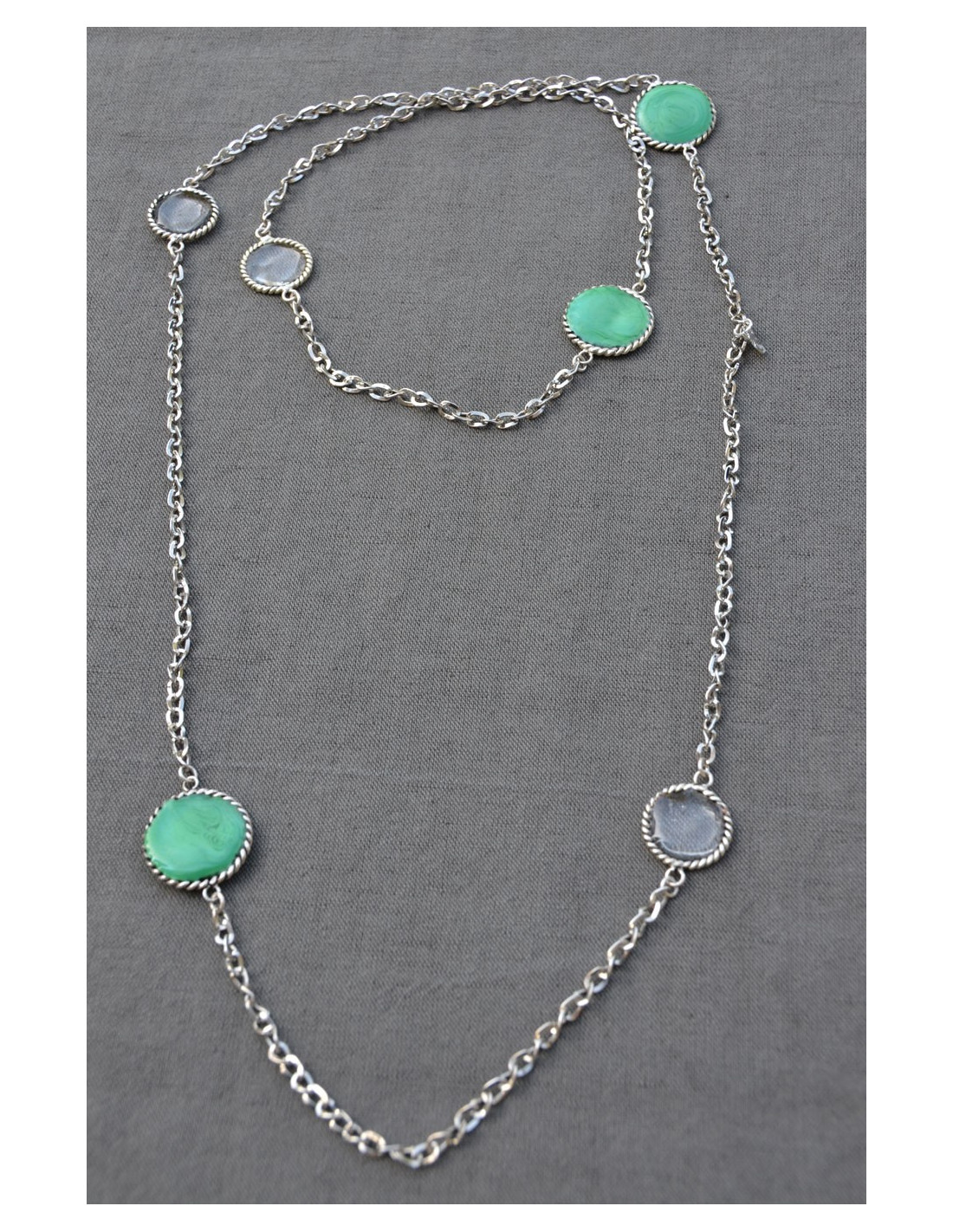 Saltire Marguerite de Valois Pâte de verre transparent and green jade, metal chain silver.
