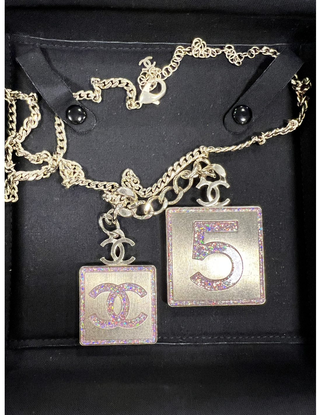 Last items in stock NECKLACES CHANEL pearls and CC rhinestones long necklace CHANEL 28525 1,850.00 € Chanel necklace pearls and CC Made in France, this long Chanel long necklace is in silver metal, pearly pearls and rhinestone CC.It is reversible on both sides. Can be worn long or double.Stamp on lobster clasp.Total length: 108 cm, CC in rhinestones sizes: 2 x 1.5 cm and 1.5 x 1 cm.ref 28525Il will be delivered in a black box Add to cart