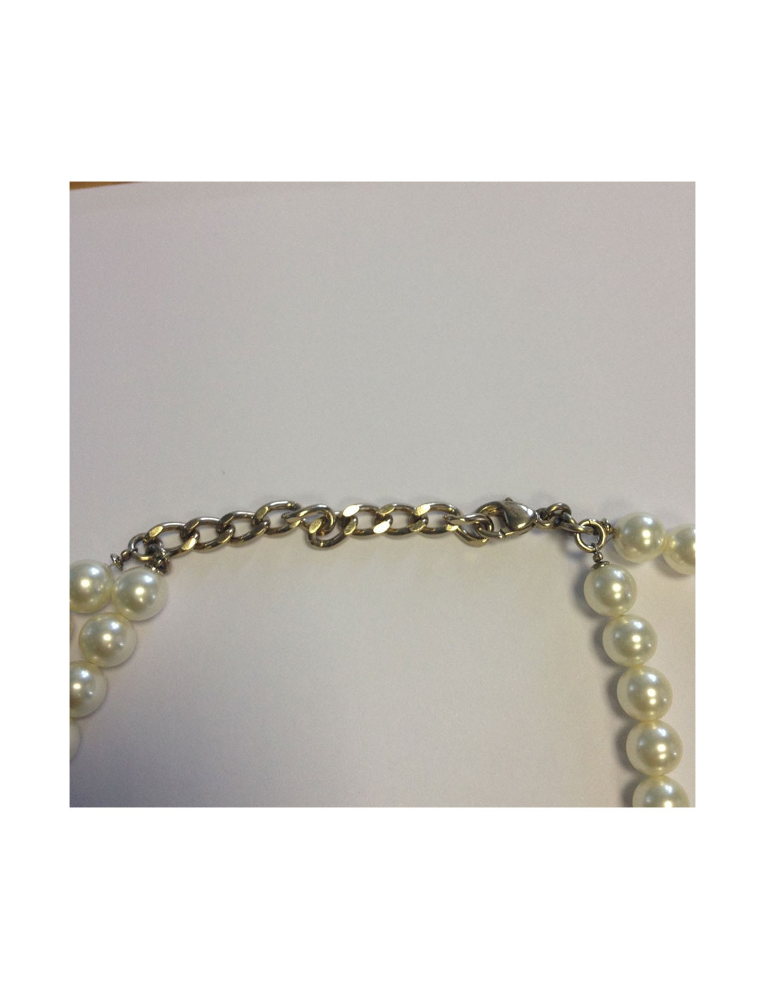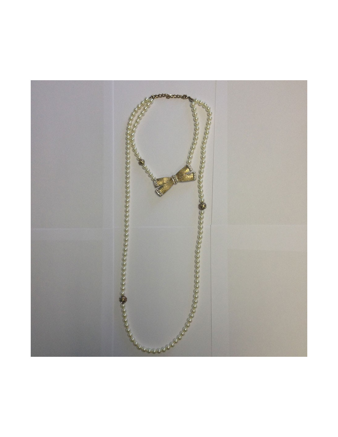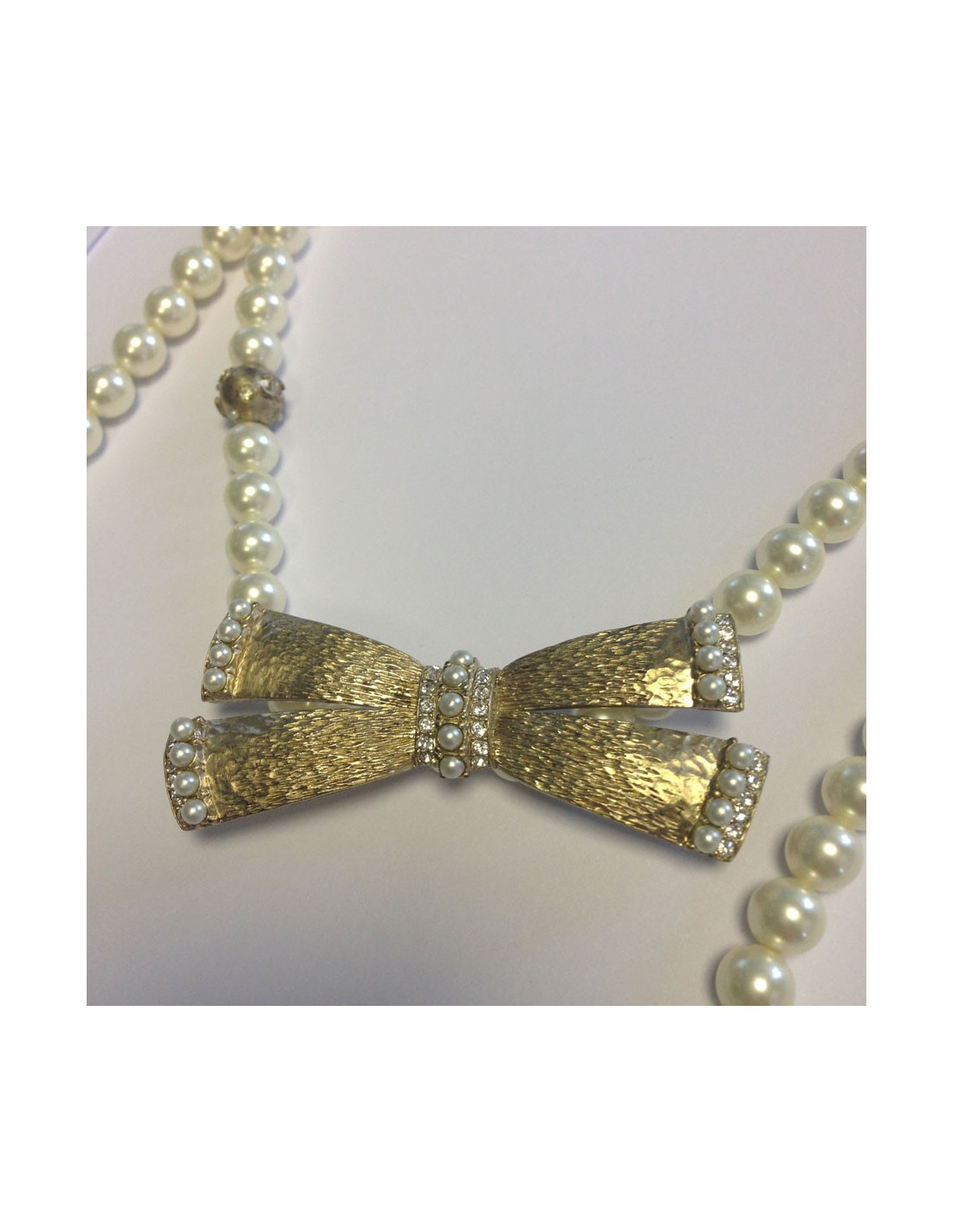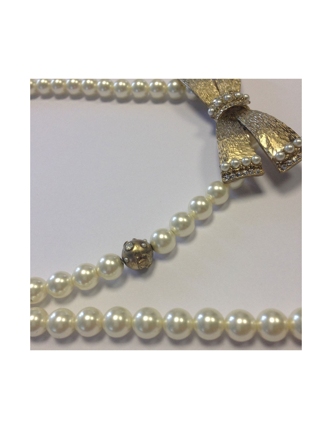 Beautiful necklace Chanel pearls and nodes paved with mini beads and Rhinestones, some beads gold stamped metal CC. Double Tower fixed: a ras row of (adjustable) neck and a long string of pearls.