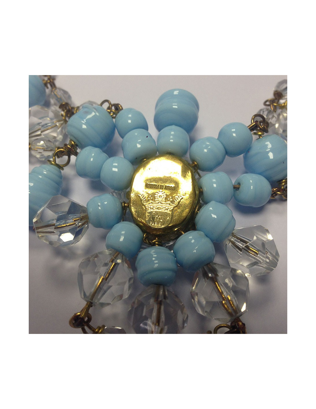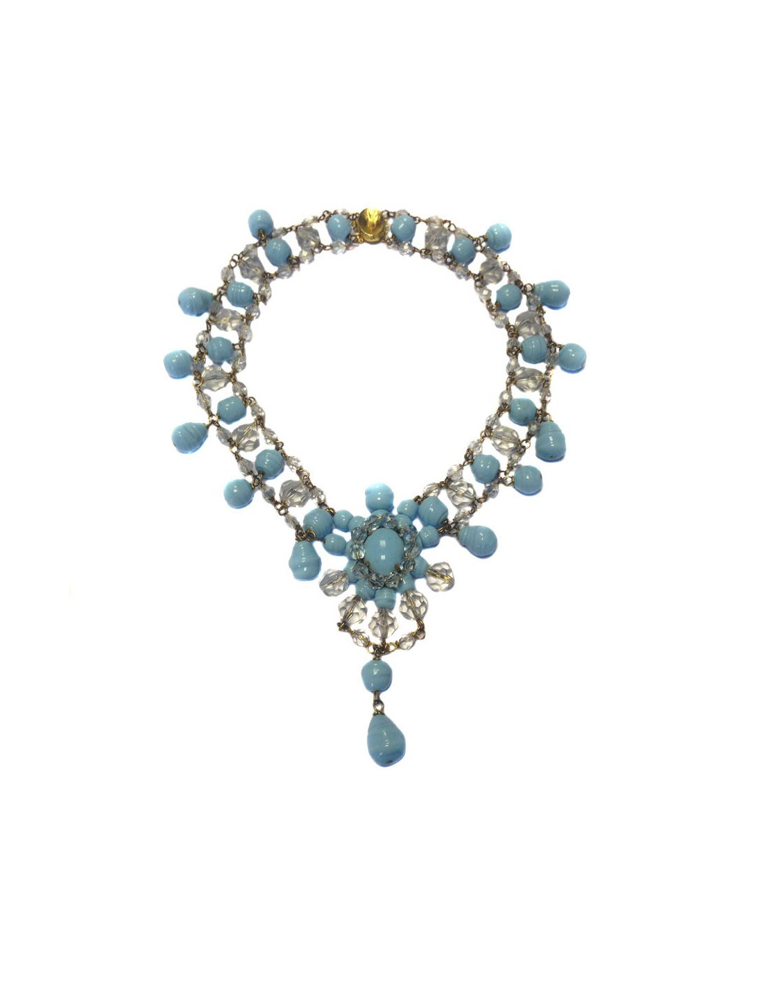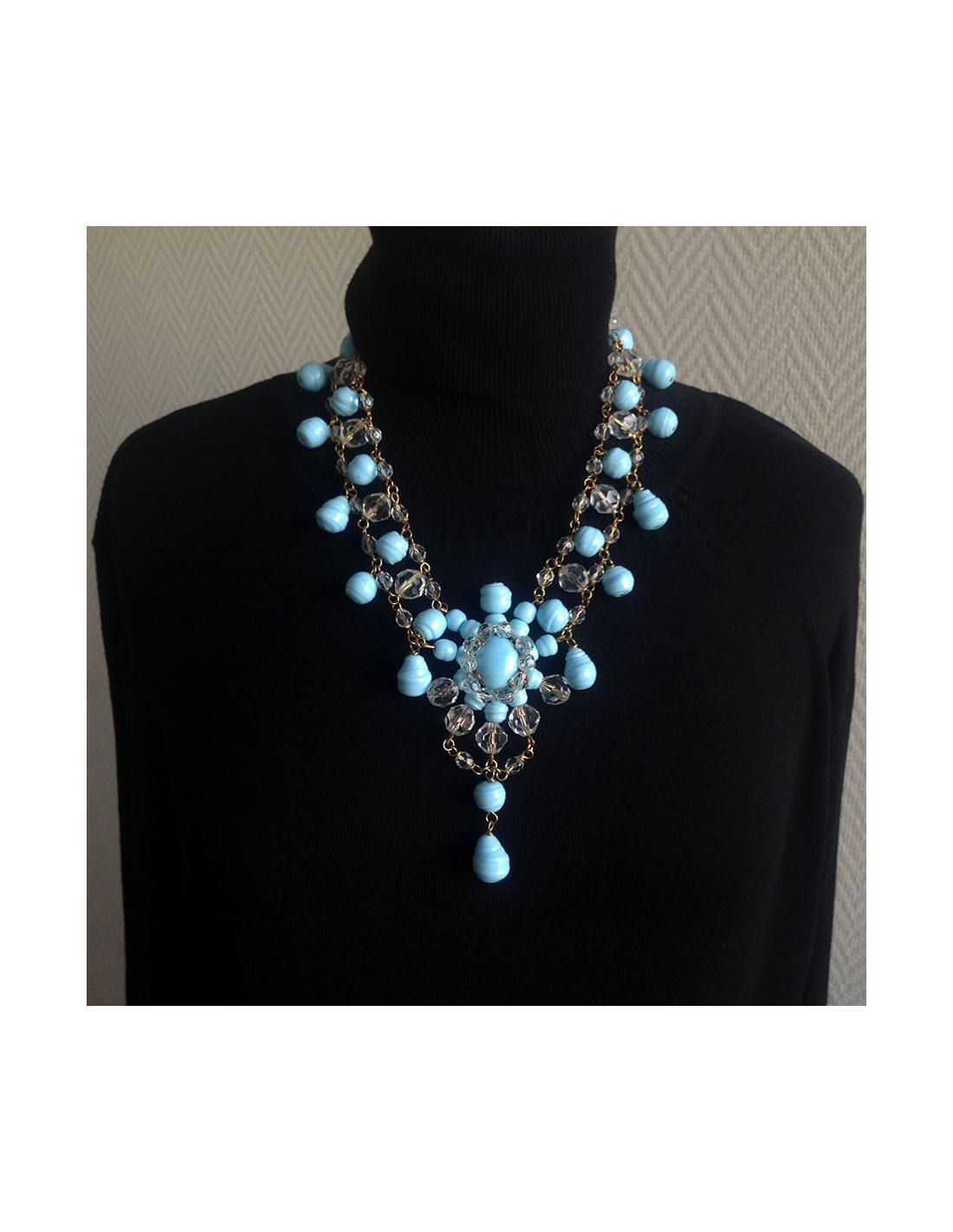 Magnificent Marguerite de Valois necklace set with sky-blue baroque molten glass and faceted stones. Gilded metal chain. Gold-plated metal drawer clasp. Never worn.