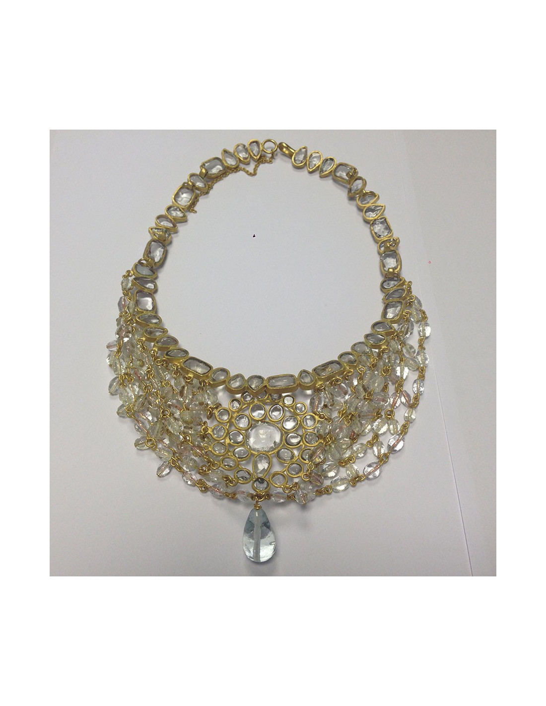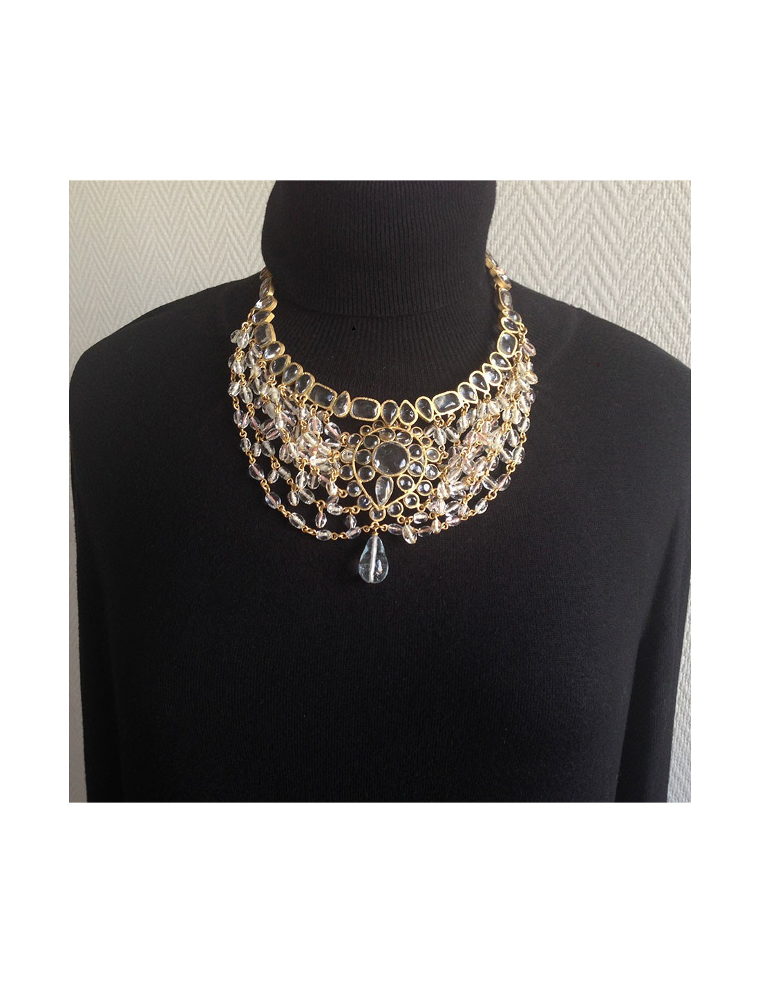 Splendid Byzantine-style Marguerite de Valois necklace set in transparent molten glass ending in a teardrop. The chain is in aged gold-plated metal. Hook clasp. A small chain finishes the necklace at the back. Never worn. Delivered in a pretty pouch.