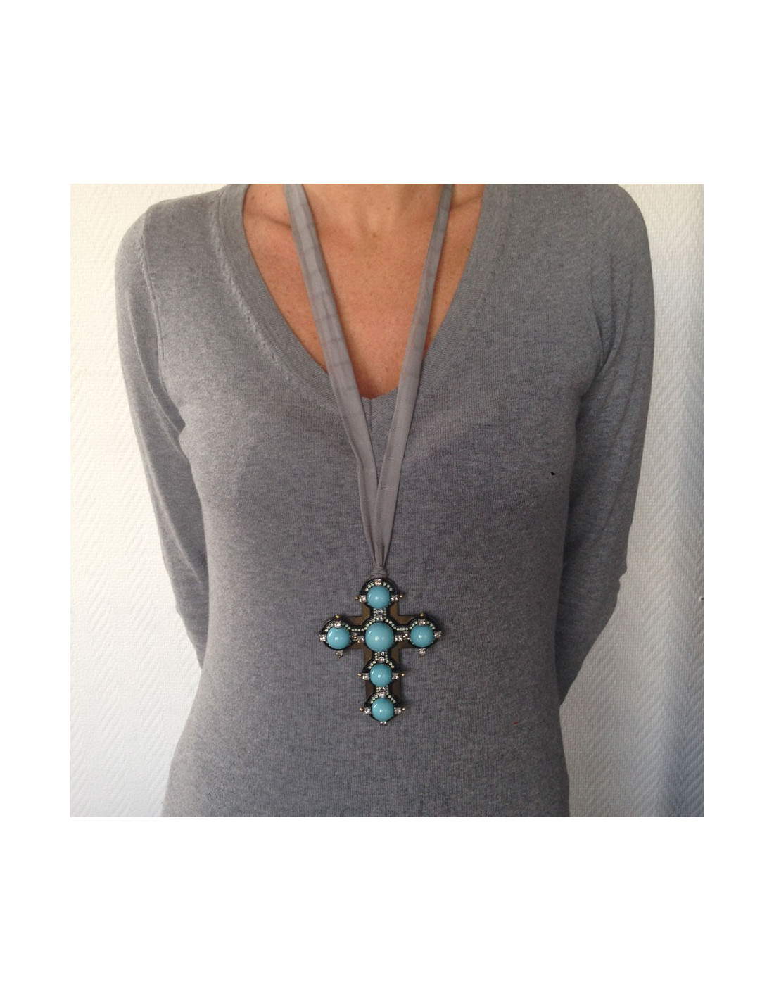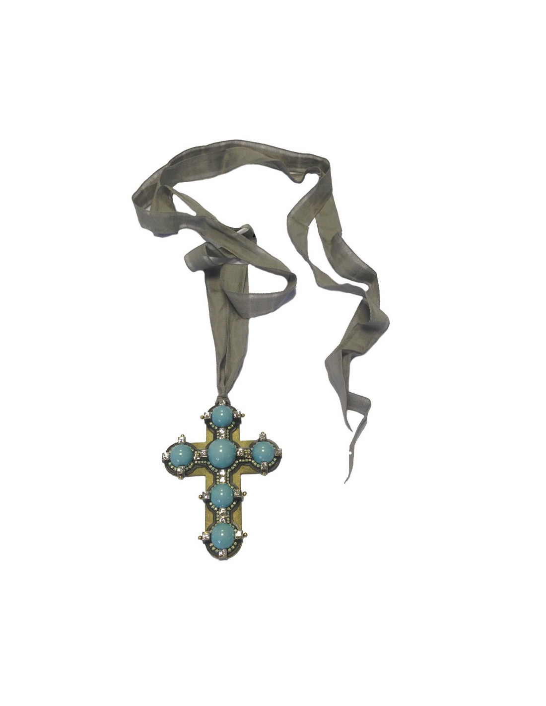 Beautiful cross pendant Lanvin in Tin and copper green grey decorated with six turquoise stones and swarovski crystal rhinestones. Tie Ribbon in cotton grey. Very trendy. Never worn. Delivered in a nice Patil.