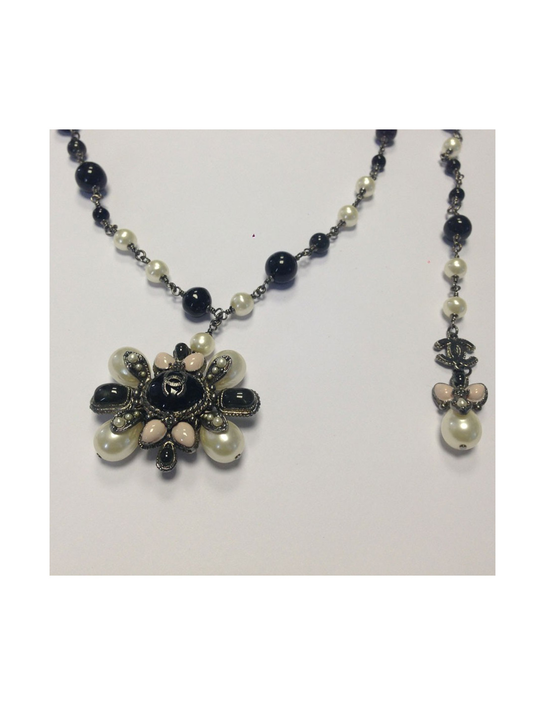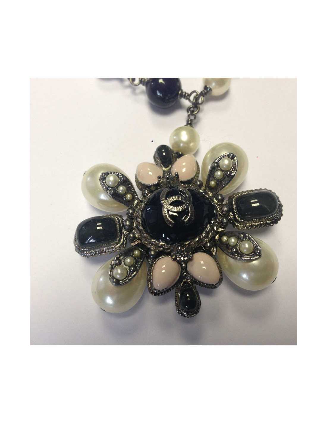 Superb! belt-Saltire CHANEL black and Pearly beads mounted on silver. Clasp signed jewel (CC), with Parma cabochons, pearly beads and black stones. Drop-shaped pendant, pearl beads and purple cabochon. Ornate CC of small beads. Never worn.