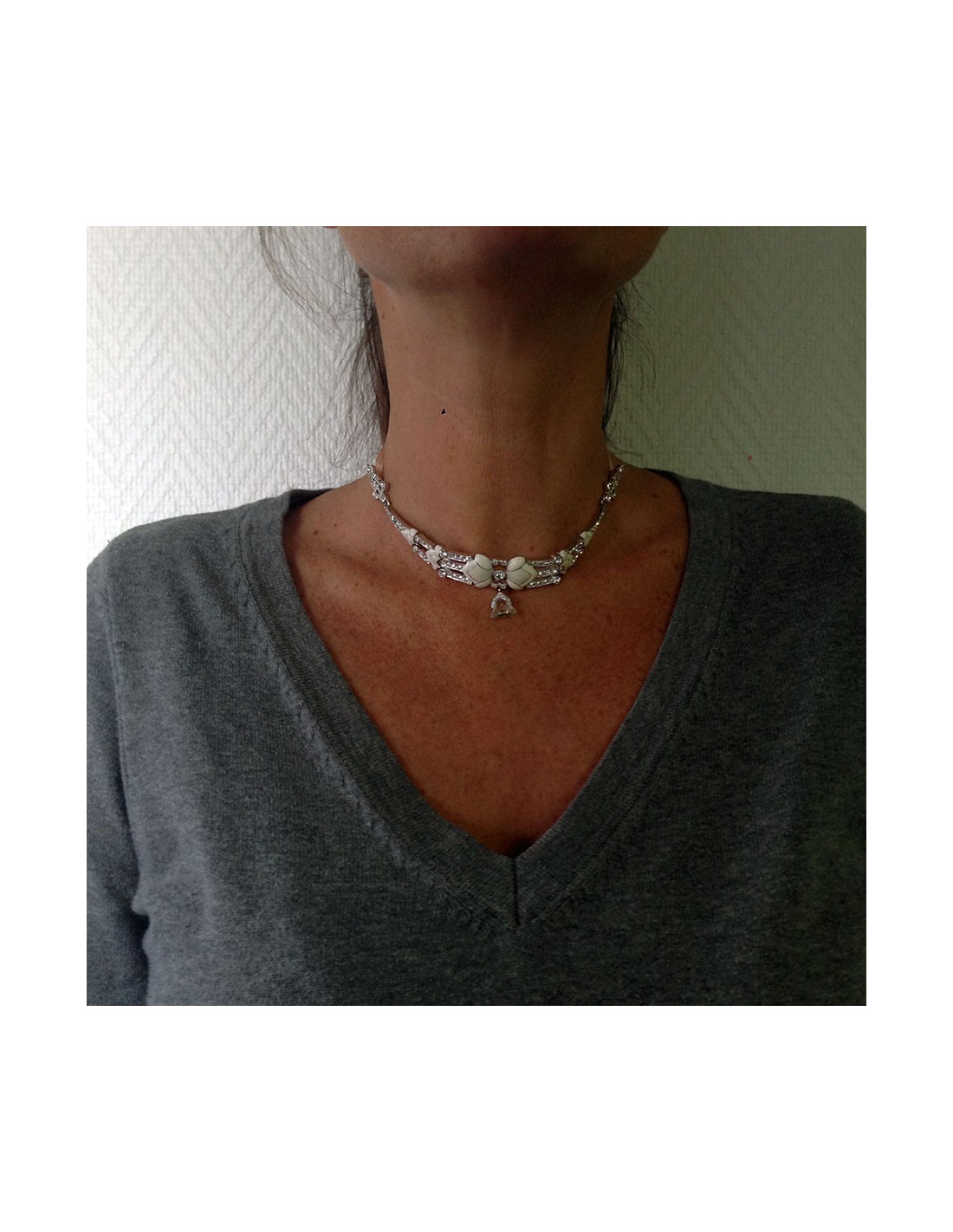 Last items in stock NECKLACES MARGUERITE de VALOIS silver chain necklace with pearly beads and faceted beads MARGUERITE DE VALOIS 18950 120.00 € MARGUERITE de VALOIS silver chain necklace with pearly beads and faceted beads Made in FranceCondition: never wornMaterials:molten glass, metalColors: silver, mother-of-pearl, brownHardware: silver finish metalMeasurements: length: 58cmDetails: Beautiful MARGUERITE DE VALOIS long necklace. Fine silver-plated double chain, 4 pearly beads, 4 faceted amber... Add to cart