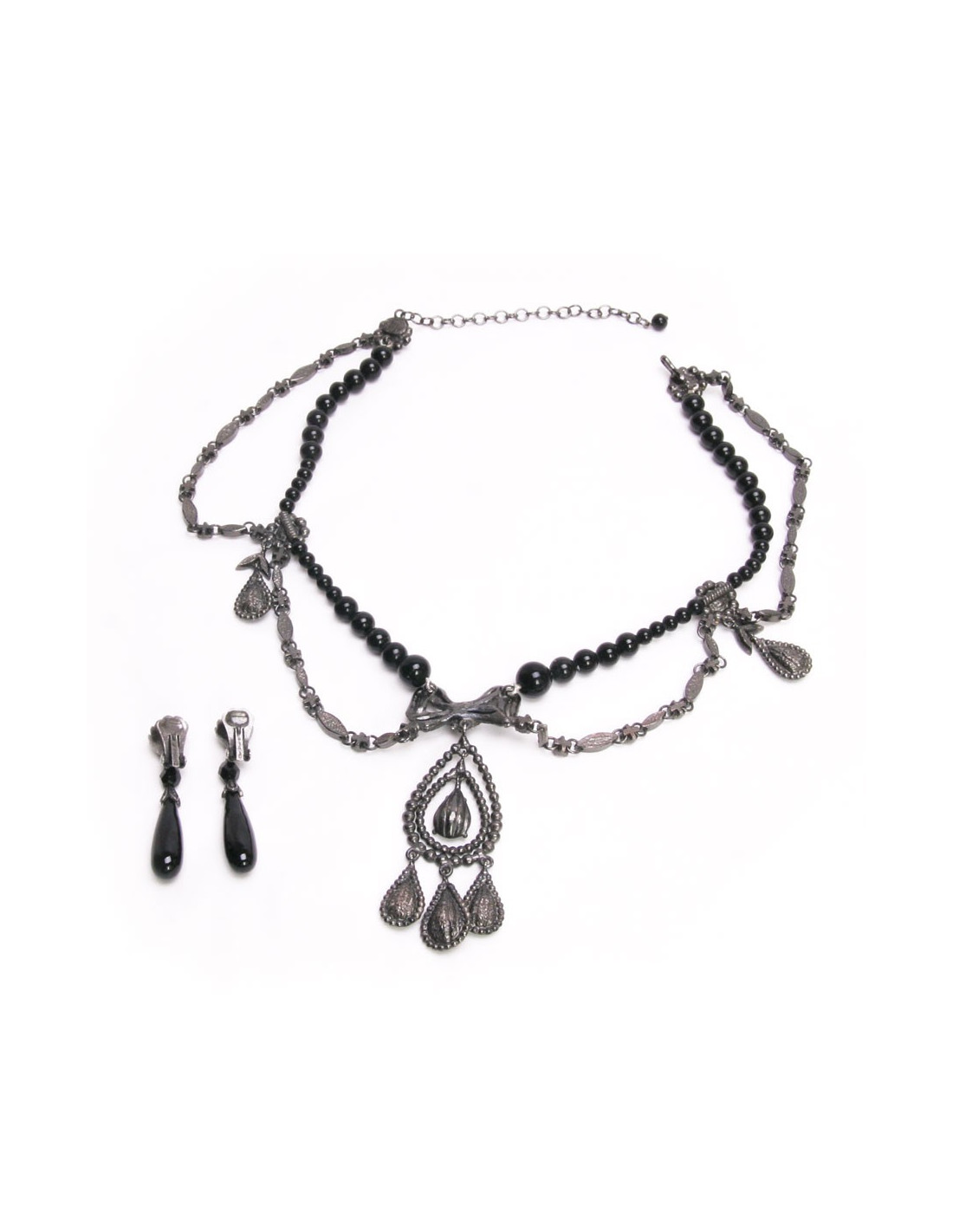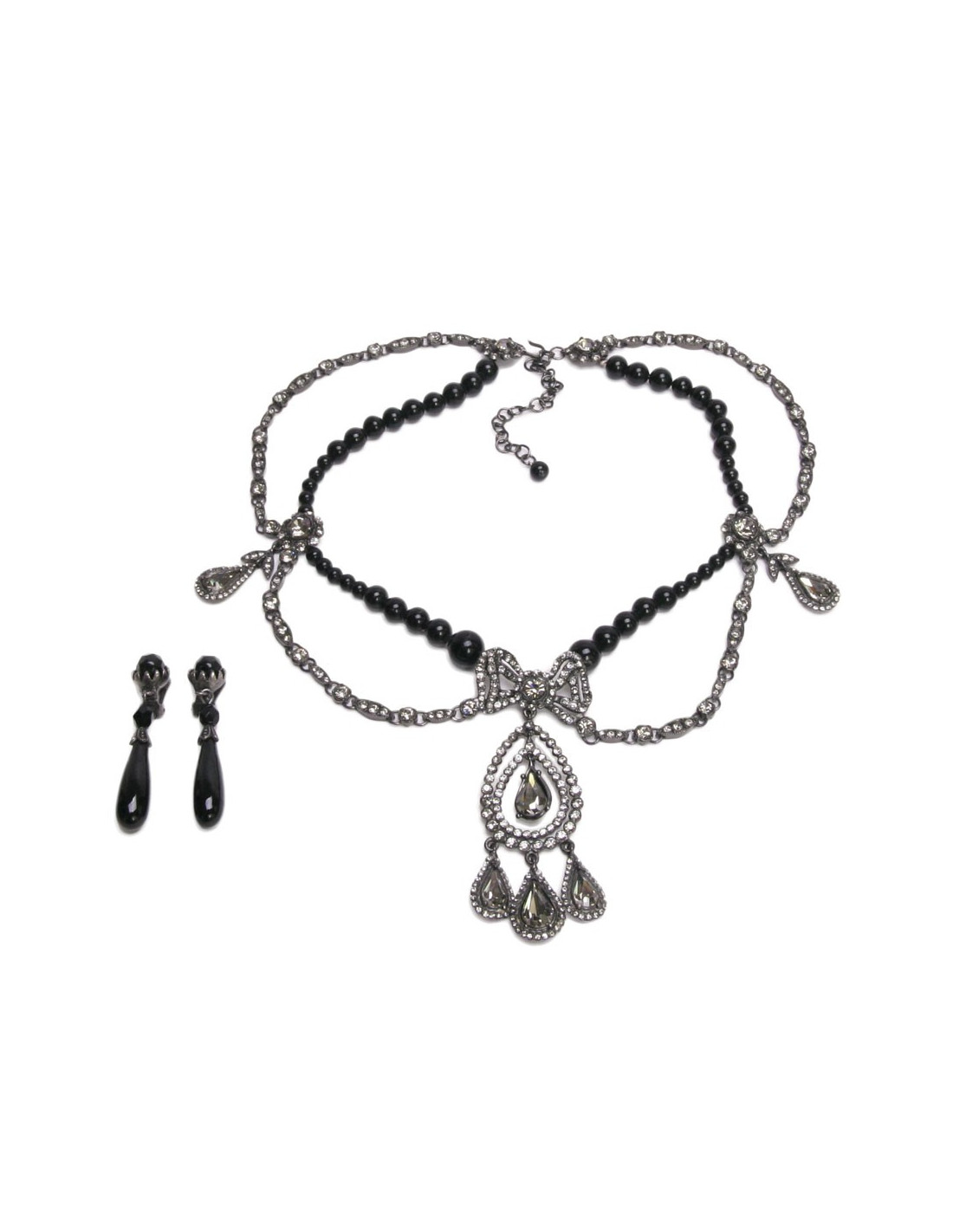 Lovely Christian Dior style Empire, black pearls necklace in fall, knot in gray strass and rhinestones (grey) carved in PEAR. The ear clips are pearls faceted black and smooth black beads in PEAR.