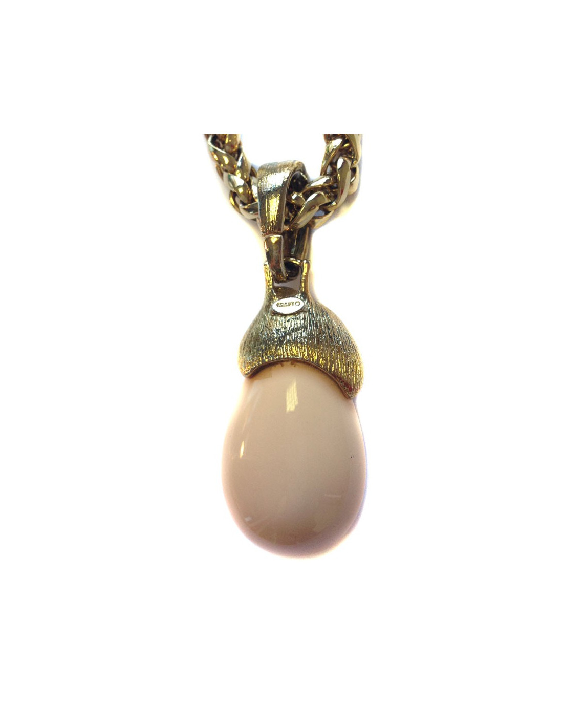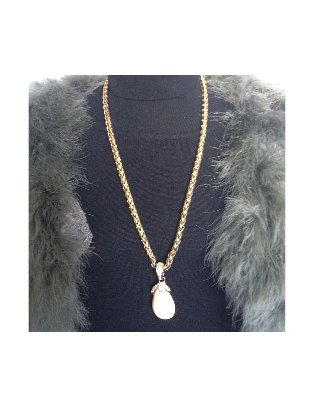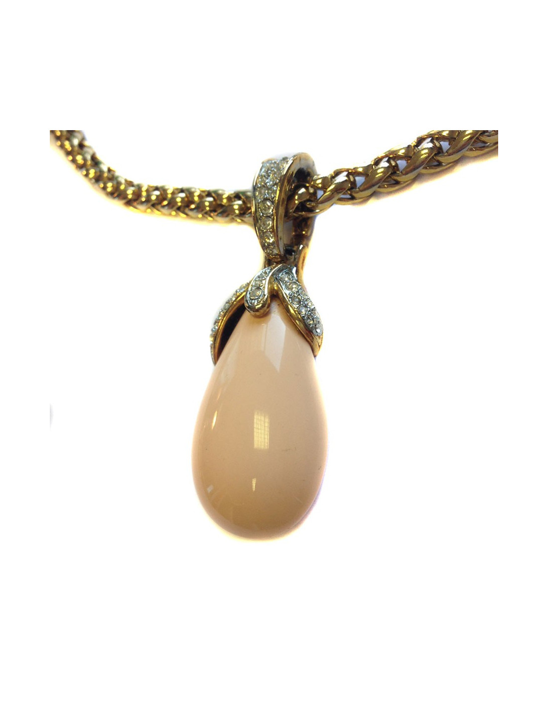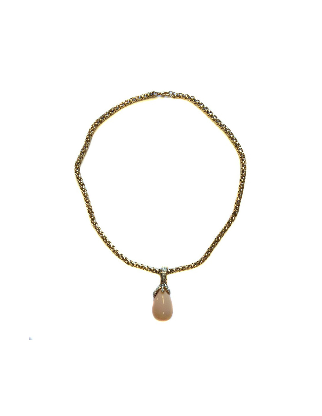 Very beautiful necklace GRAFT knit Golden Palm and pendant Teardrop pale coral color. The pendant hangs from the chain by a ring set with Rhinestones on his half. Can be worn with jeans with an evening dress. In very good condition.
