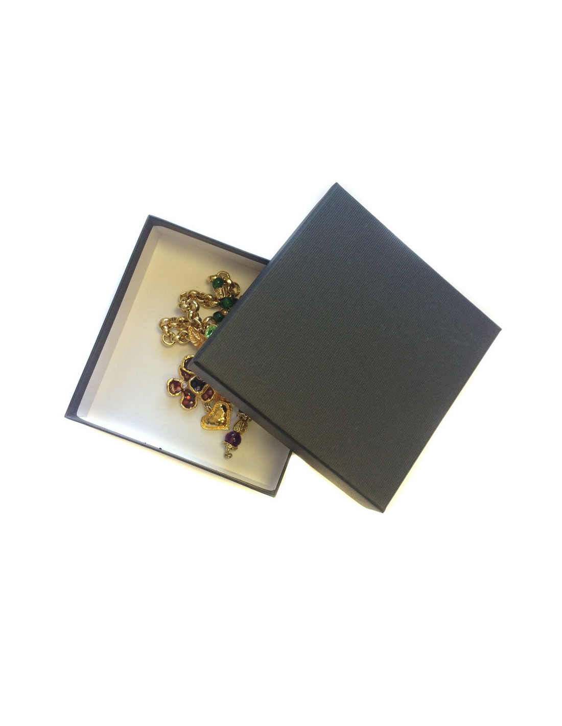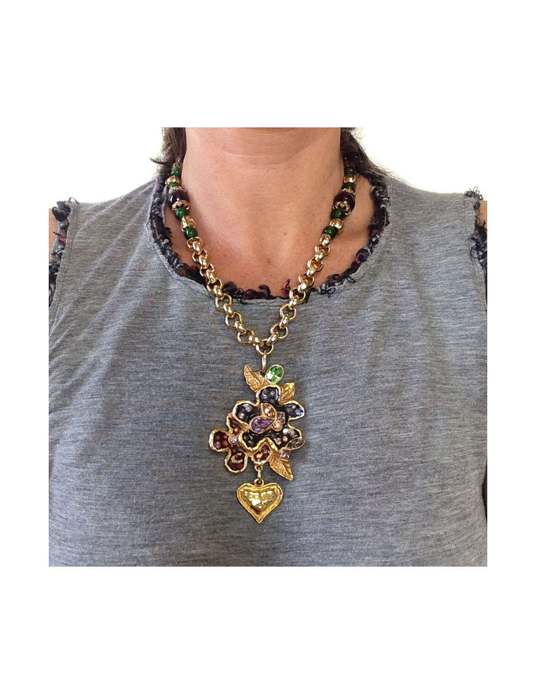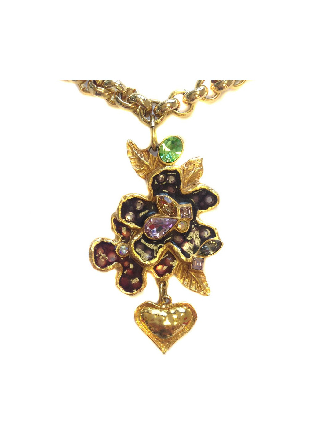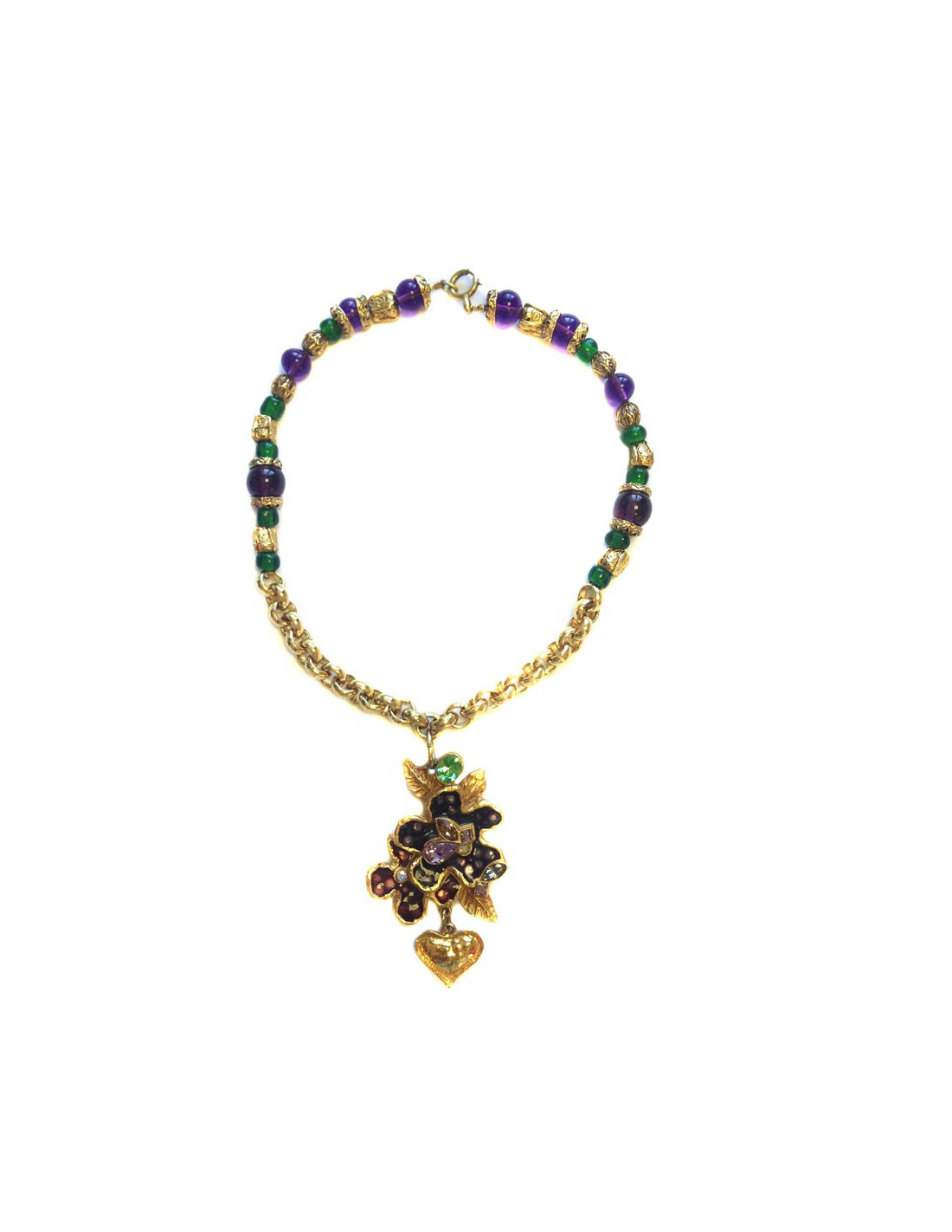 Beautiful necklace couture flowers of Christian LACROIX, resin and glass. Stones in shades of rose, green. Heart pendant in gold metal. Part of the necklace is in medium rings gold metal chain. Necklace in very good condition.