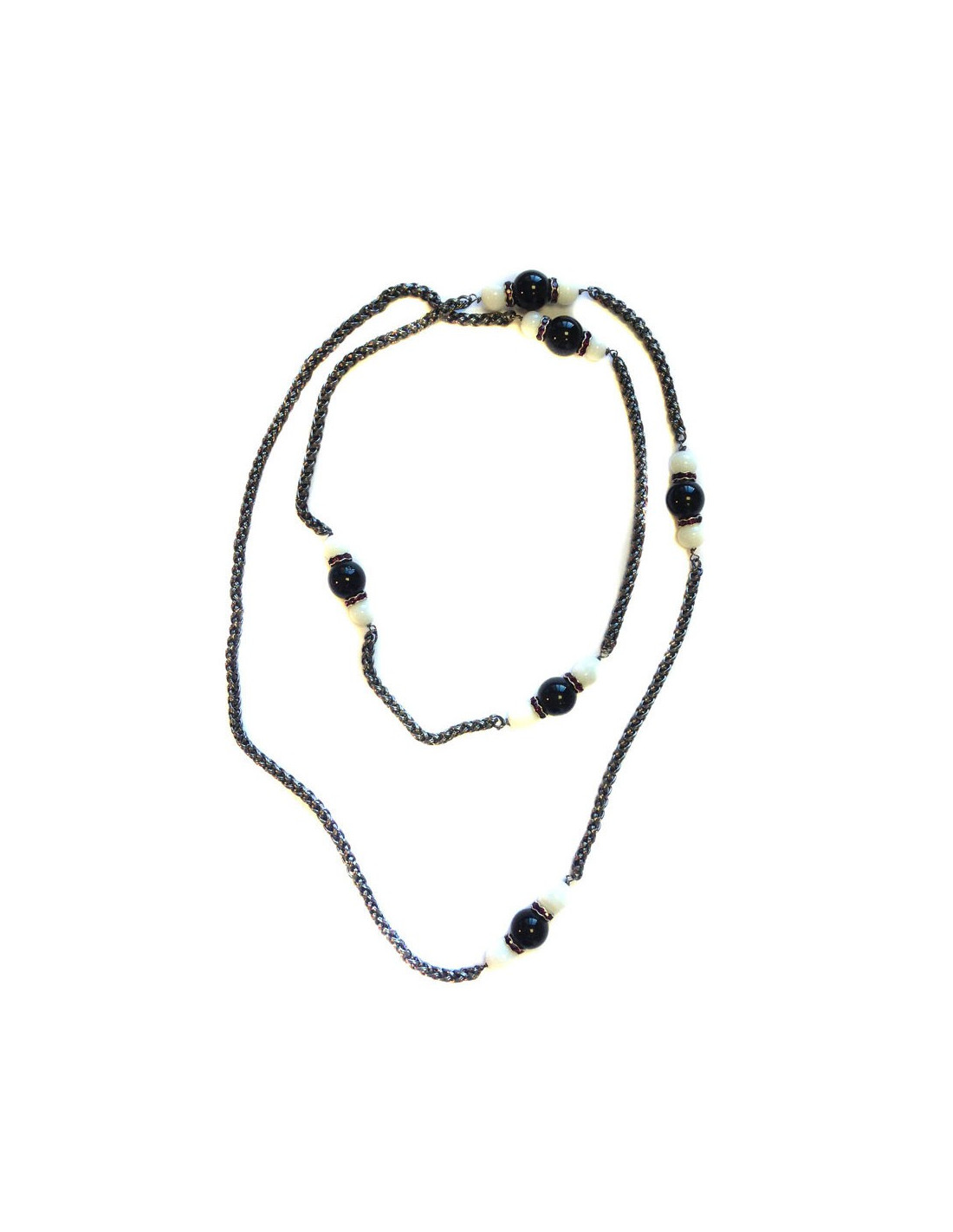 chain 64 cm - white beads: 1 cm in diameter - black pearls: 1.5 cm in diameter cabochons: 1.3 cm