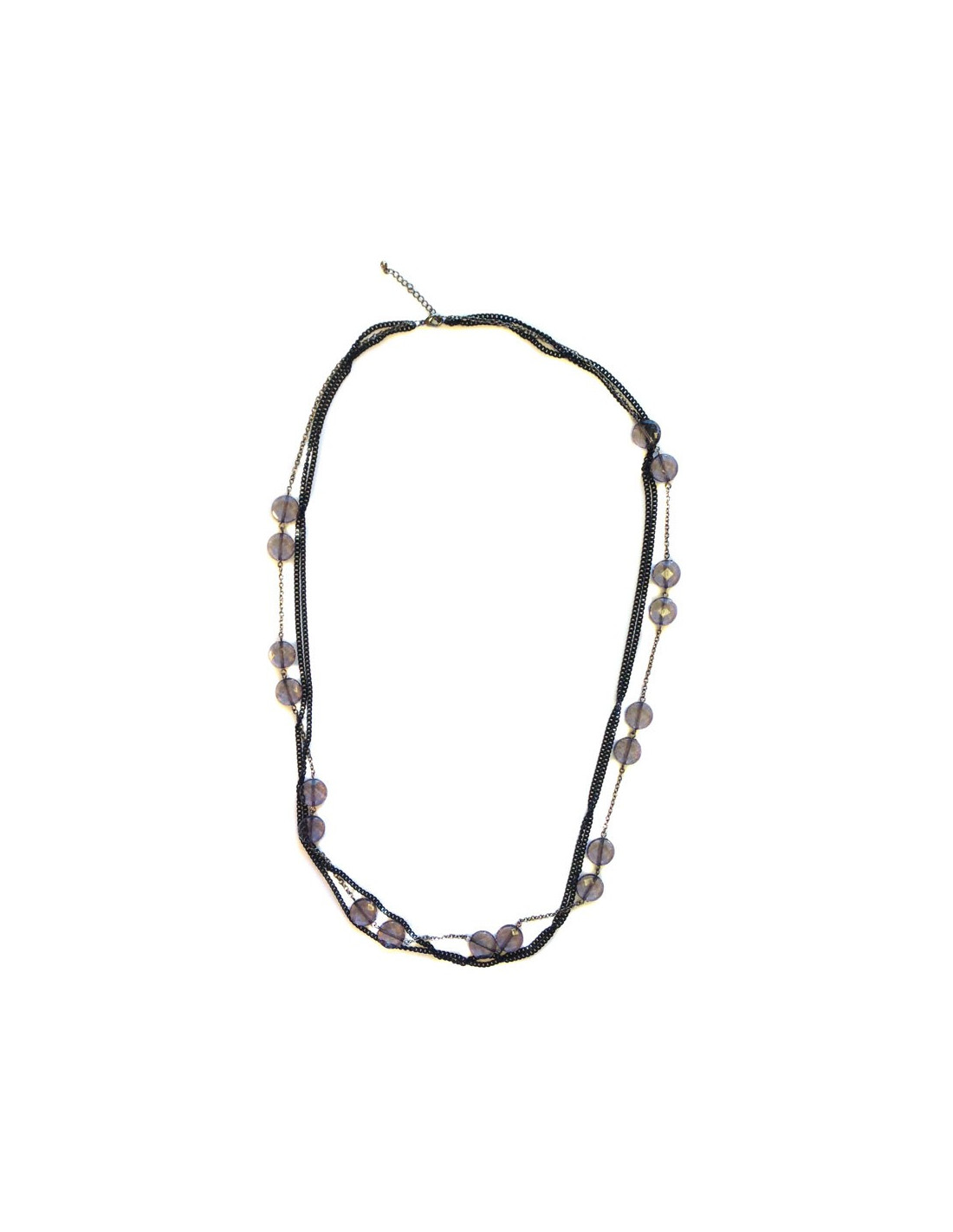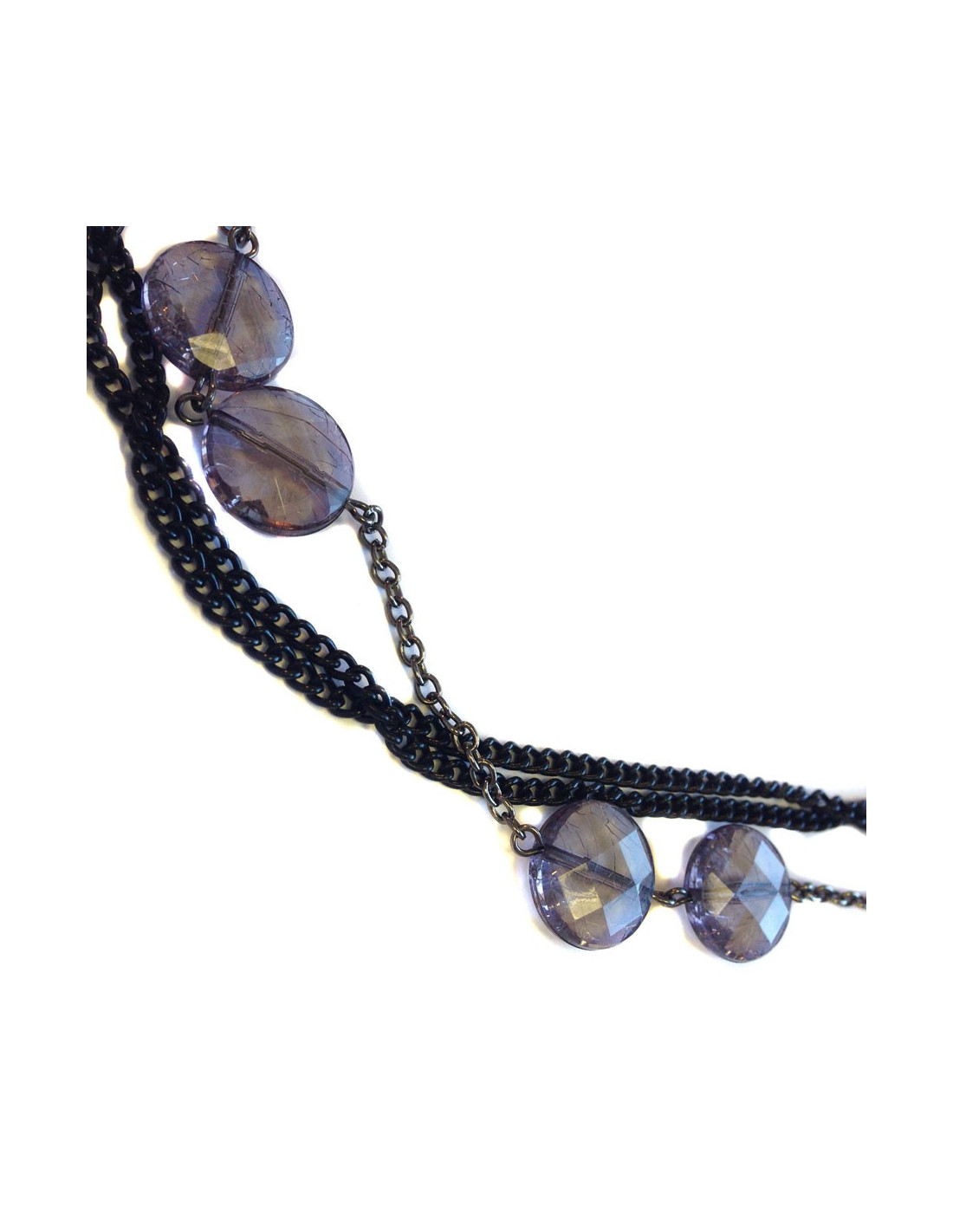 Marguerite de Valois long necklace with fine ruthenium and silver chains, set with transparent purple faceted flat pearls with shatter effect.