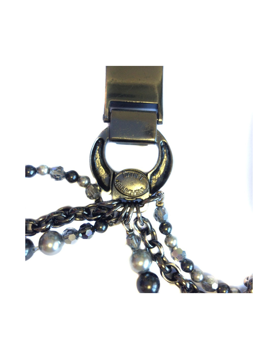 Original! Ras Daniel SWAROVSKI's neck, 3 rows necklace, string in ruthenium and varied (faceted, smooth, pearly) pearls in shades of gray. The clasp is a push button. It is partly in rigid metal with in its Center a green Crystal faceted and is on the front of the neck. On the side 2 strings of beads and a string of ruthenium. In very good condition.