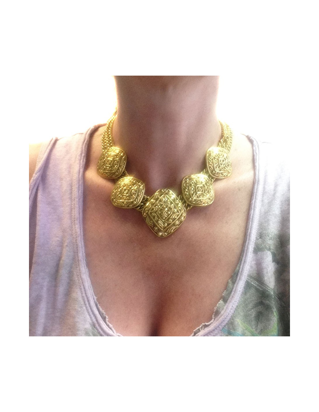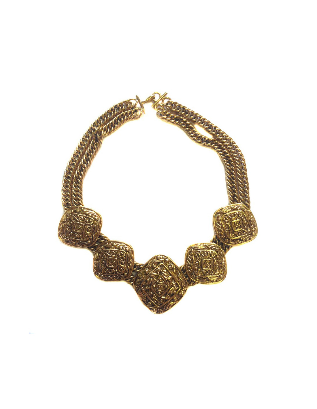 Beautiful vintage Chanel necklace. Crew neck with 2 mesh chains, composed of 5 golden diamond-shaped pieces with floral decorations and a CC in the center. Hook clasp.