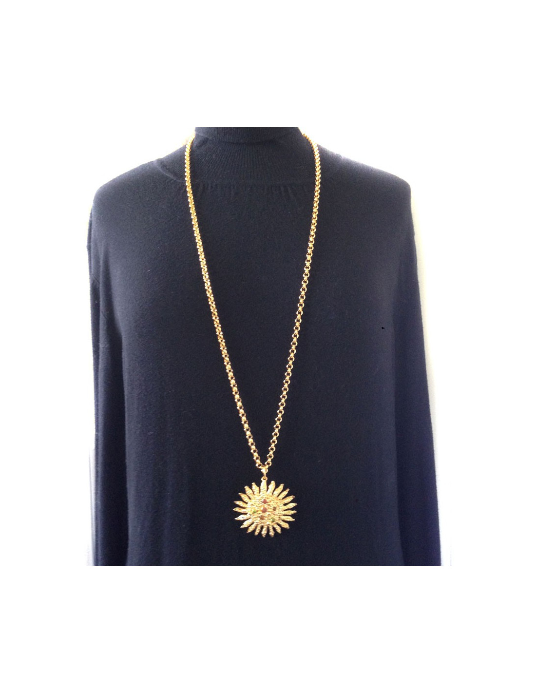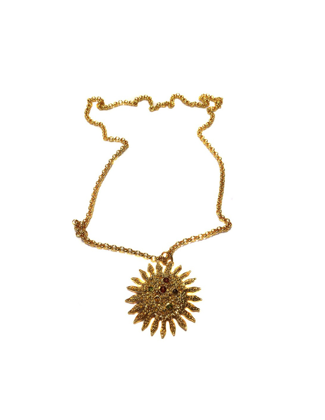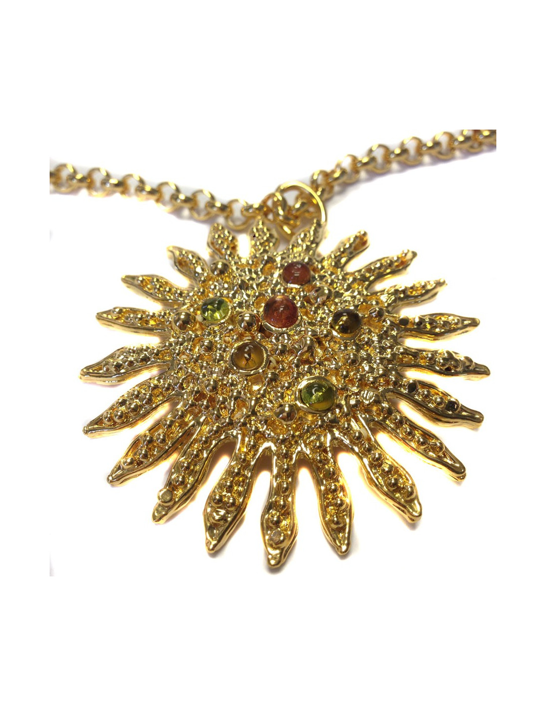 Beautiful necklace LOEWE, crafted by the House of GRIPOIX. Necklace with chain gold metal pendant Sun with small spheres in blocks of glass inlaid with amber, green and yellow.