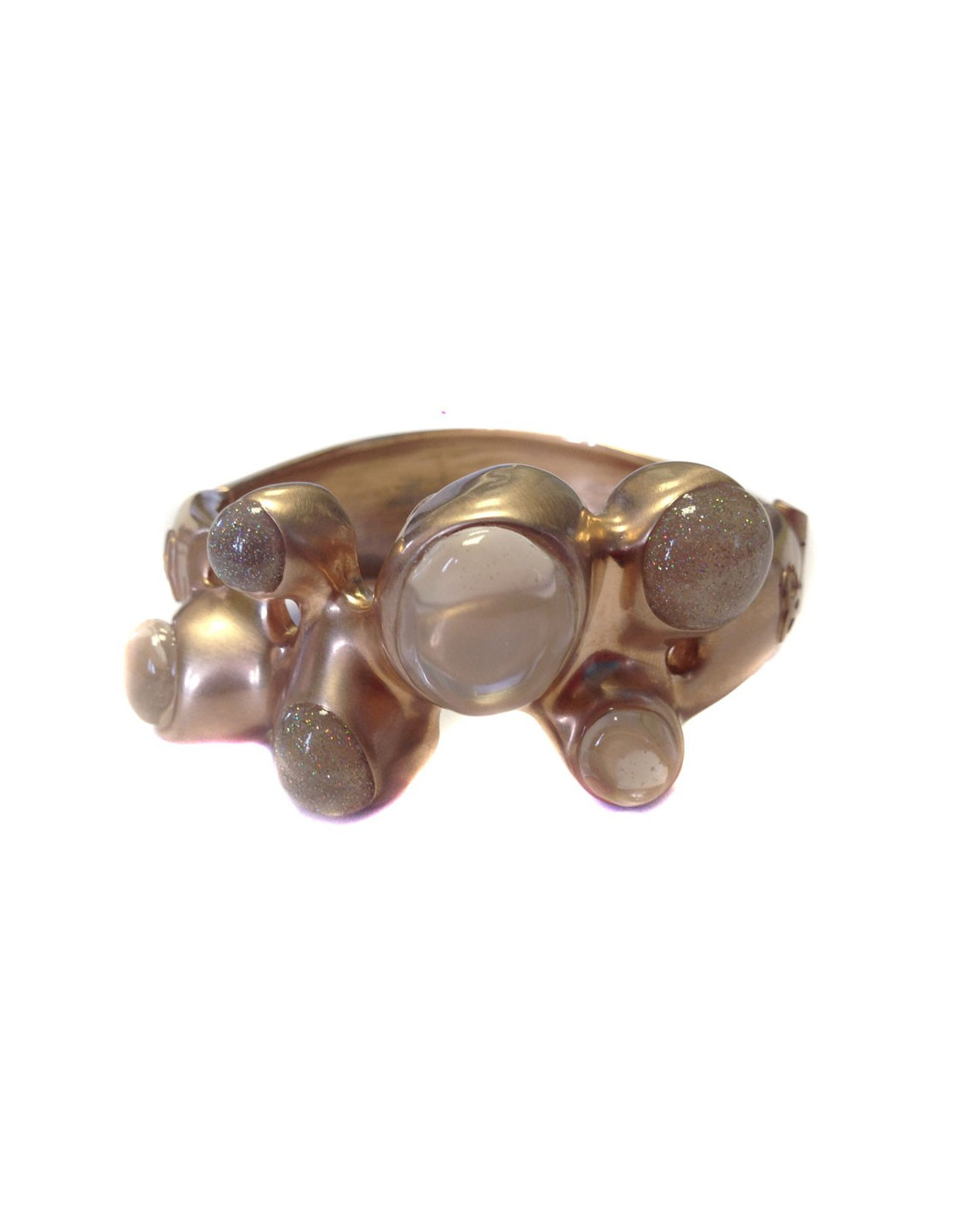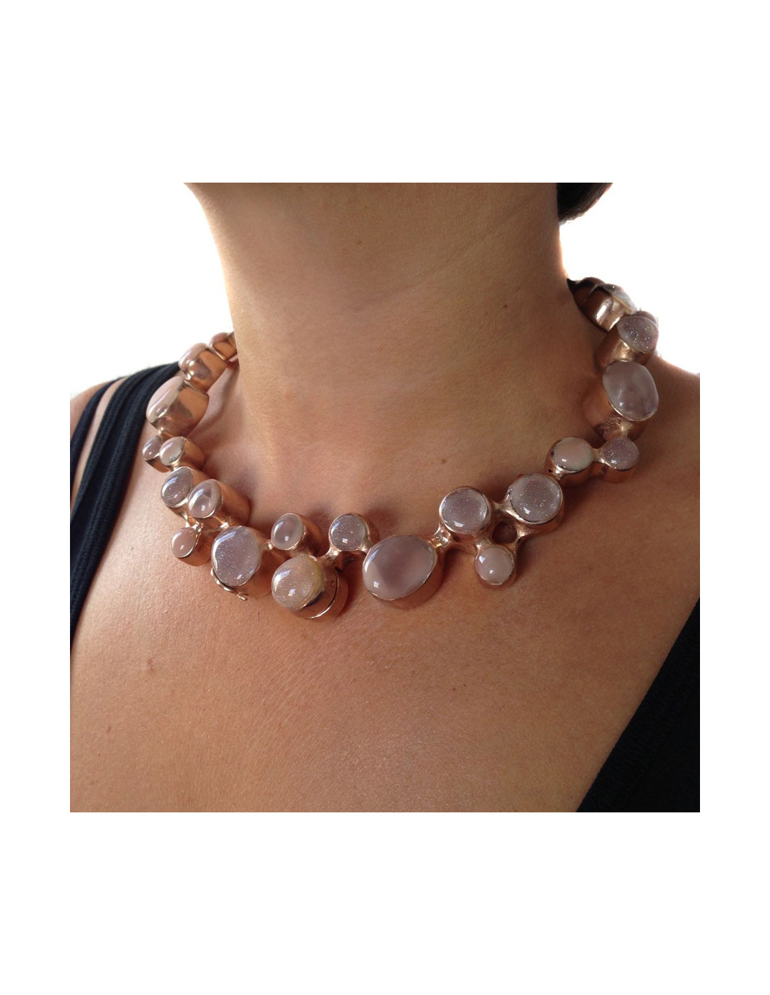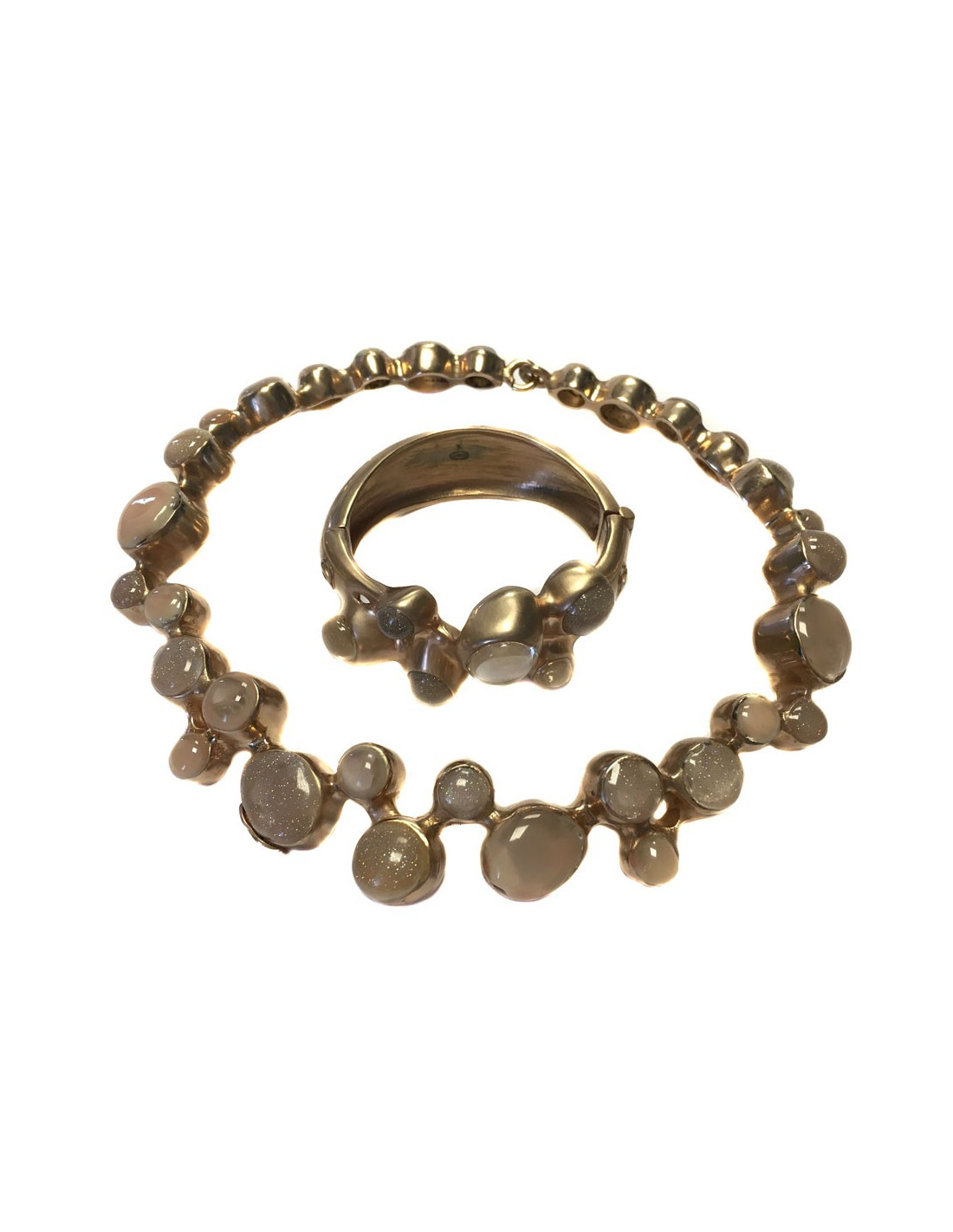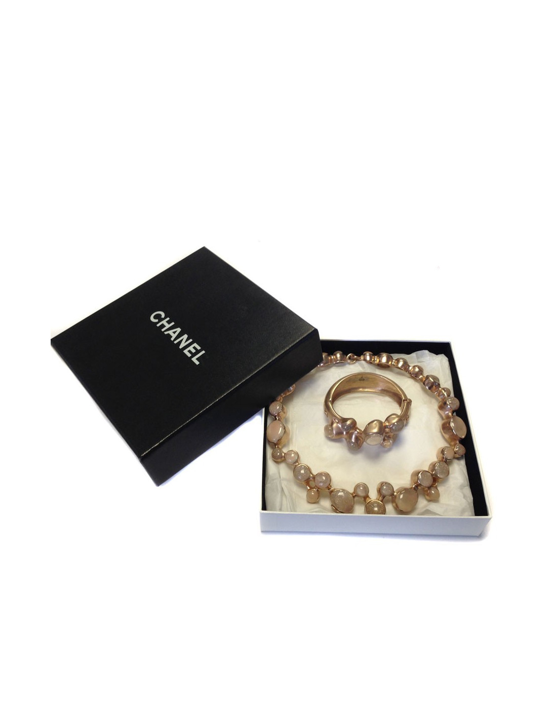 Stunning adornment CHANEL necklace and bracelet of the trades of Art collection Paris Bombay metal color rose gold. The collar and the bracelet are rigid, metal stone glass transparent, pale pink and glitter. The clasps are magnets.