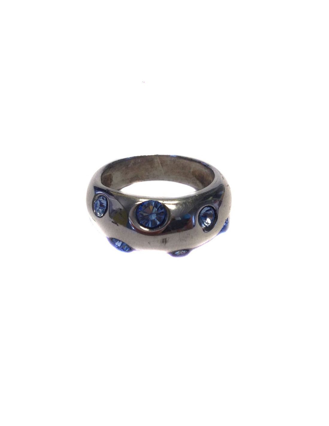 YVES SAINT LAURENT necklace and ring set in silver and blue rhinestones. The collar has a small silver ball chain and a heart pendant with inlaid blue rhinestones.