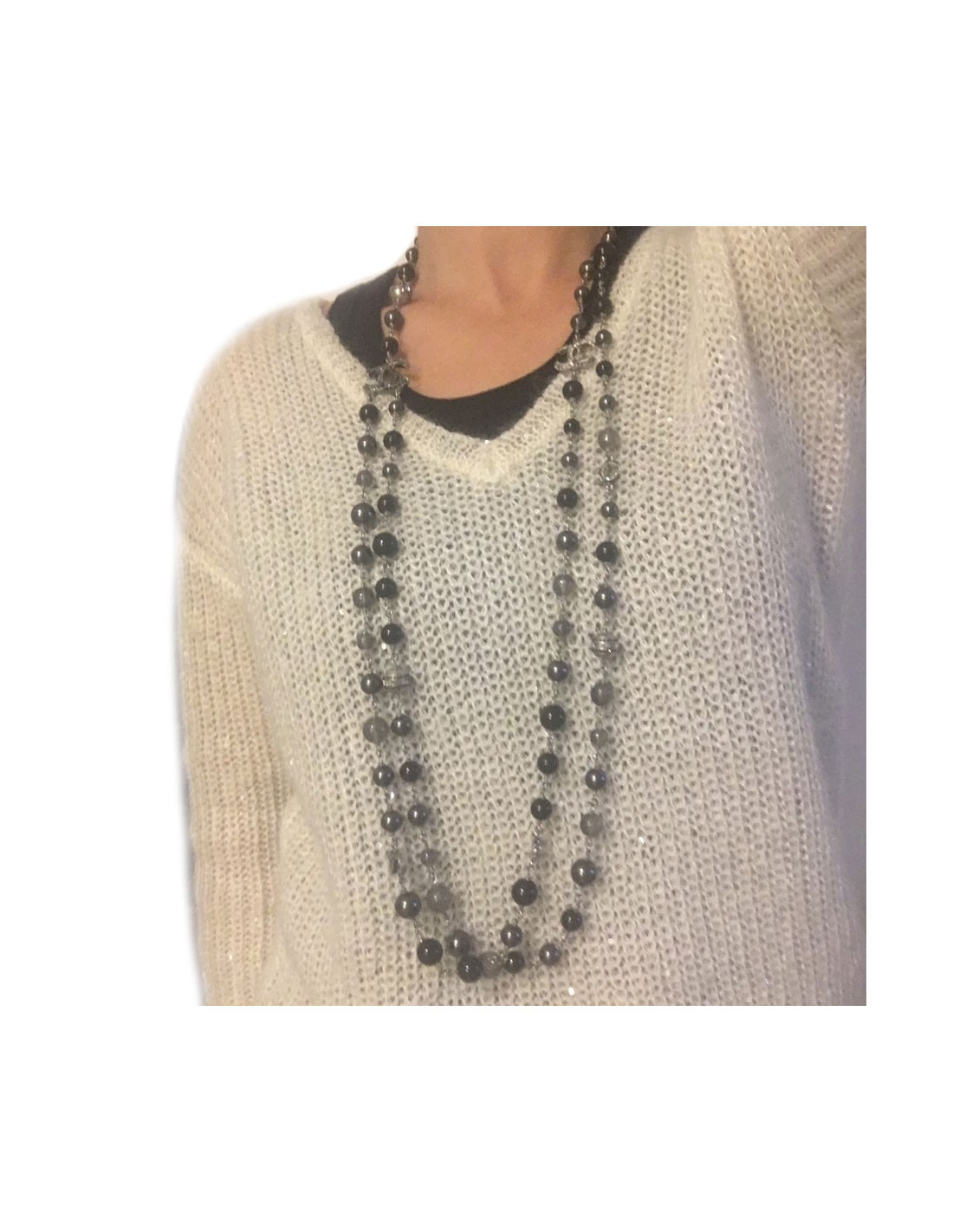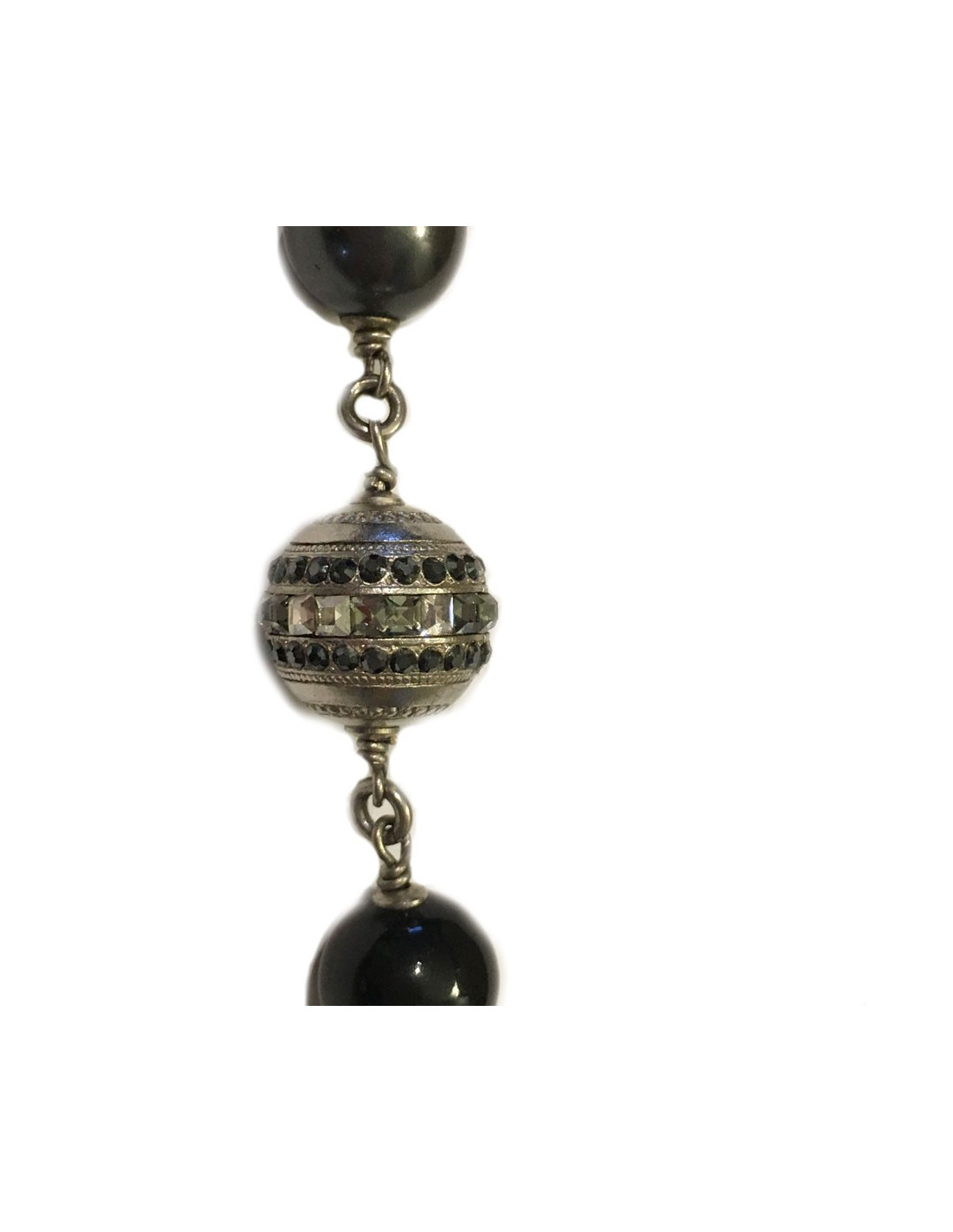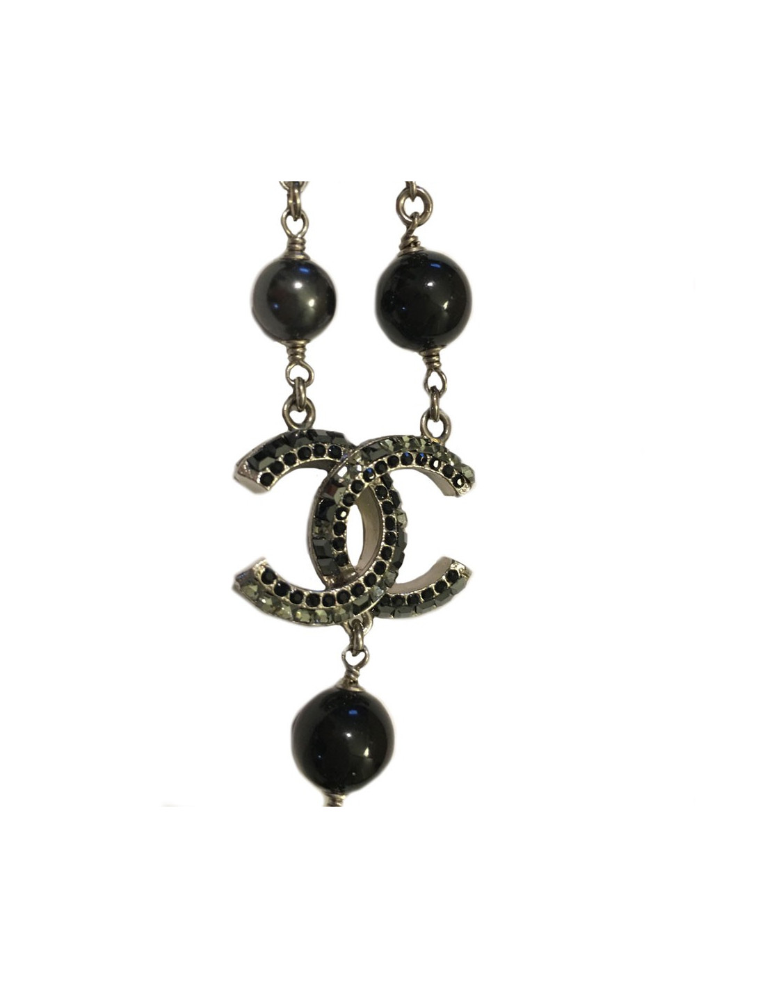 Very nice necklace in silver and gray pearls, pearly, transparent CHANEL sequin and black sizes. CC with Rhinestones, black, and white CC in rhinestone white. Small spheres in silver with black and white rhinestones. Collection 2011.