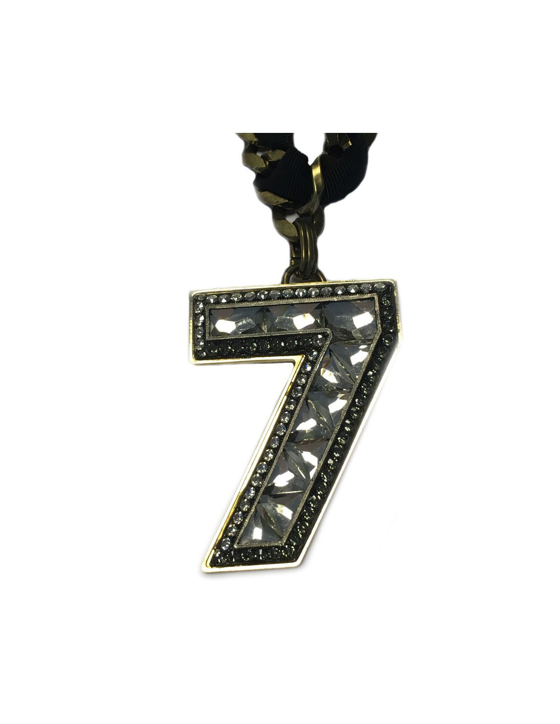 LANVIN necklace chain with large matte gold mesh surrounded by a black grosgrain ribbon. Pin pendant number 7 in rhinestones. Never worn. Pastille of the present brand.