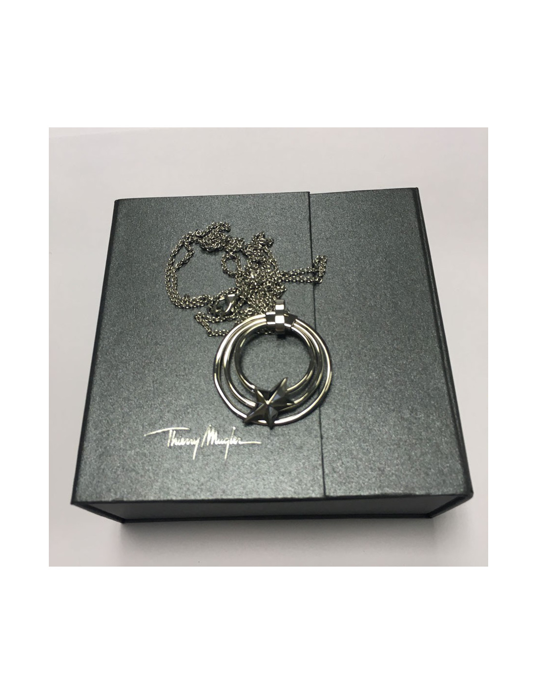 Details: THIERRY MUGLER necklace and pendant in silver-plated metal. With iconic Mugler star.