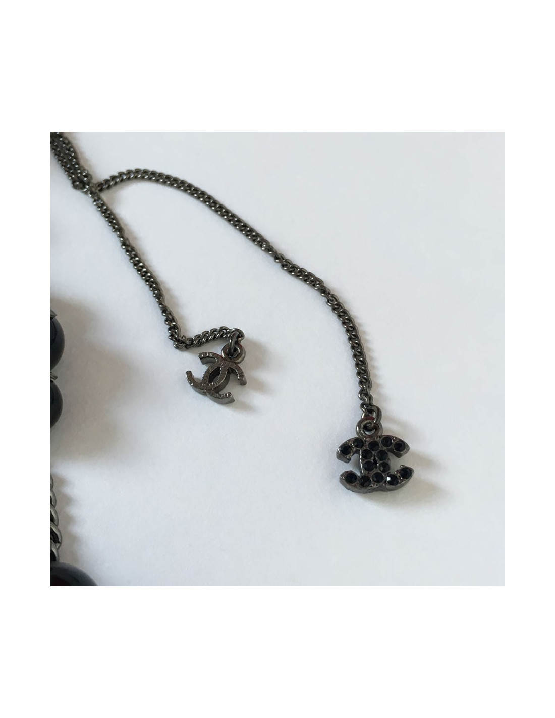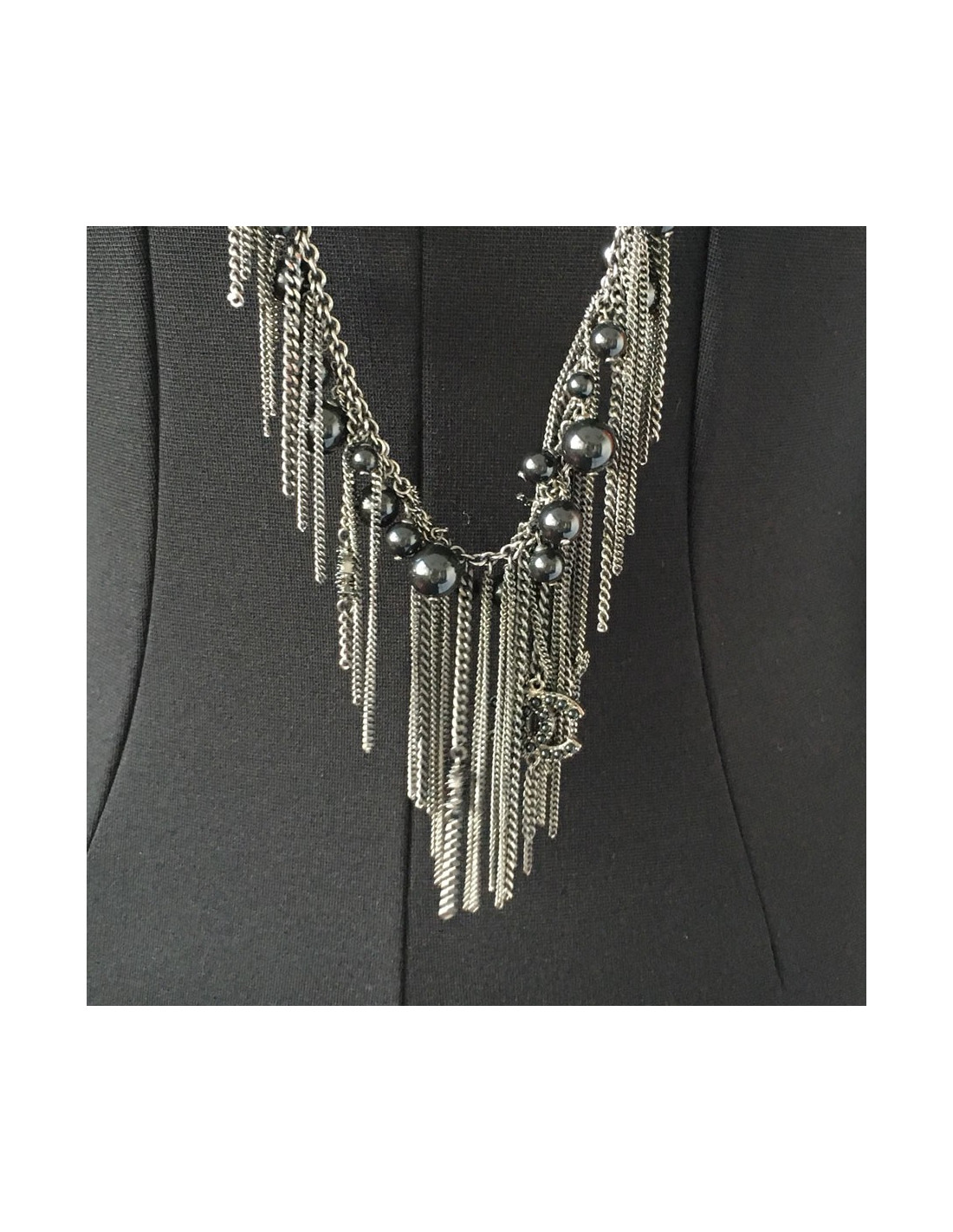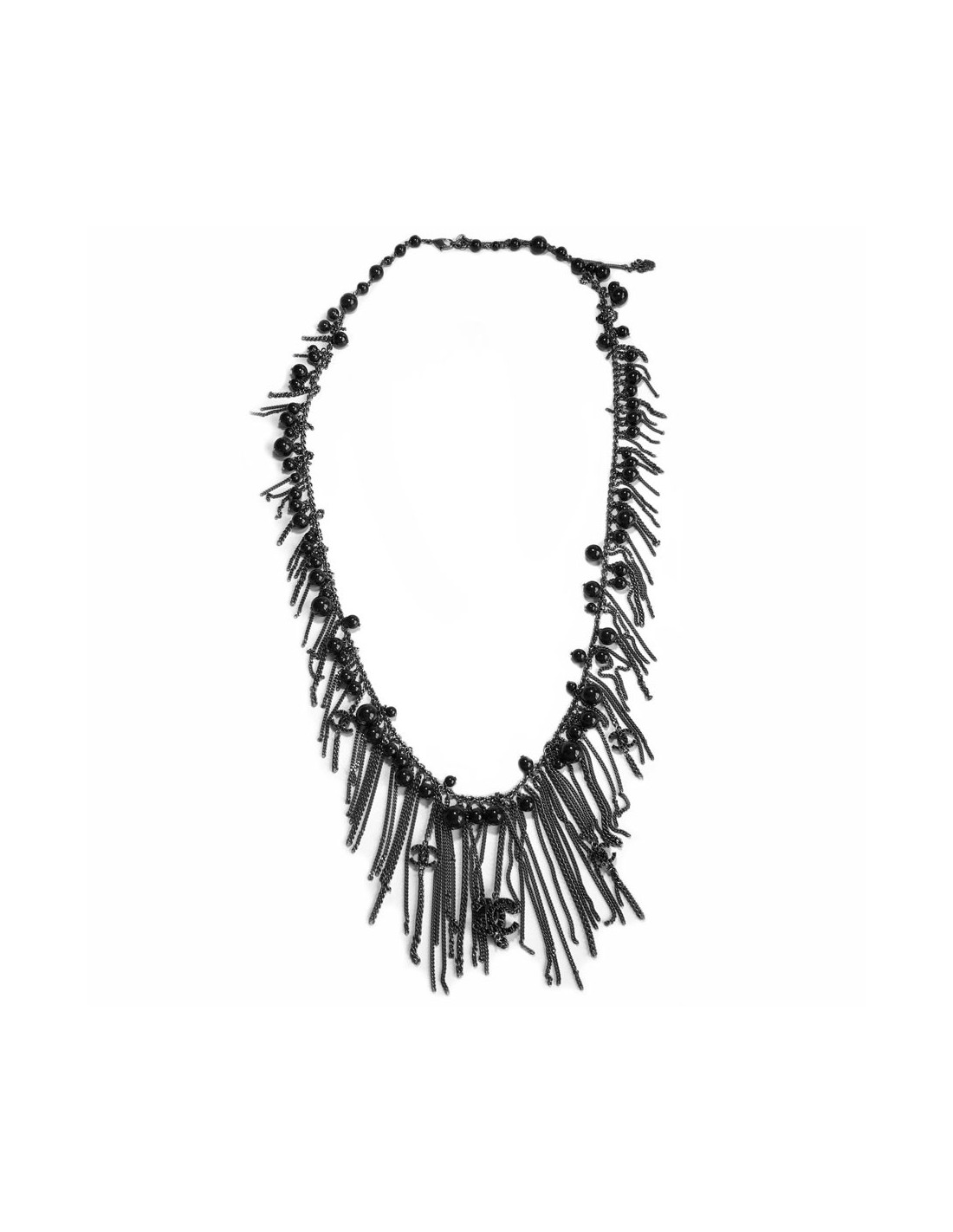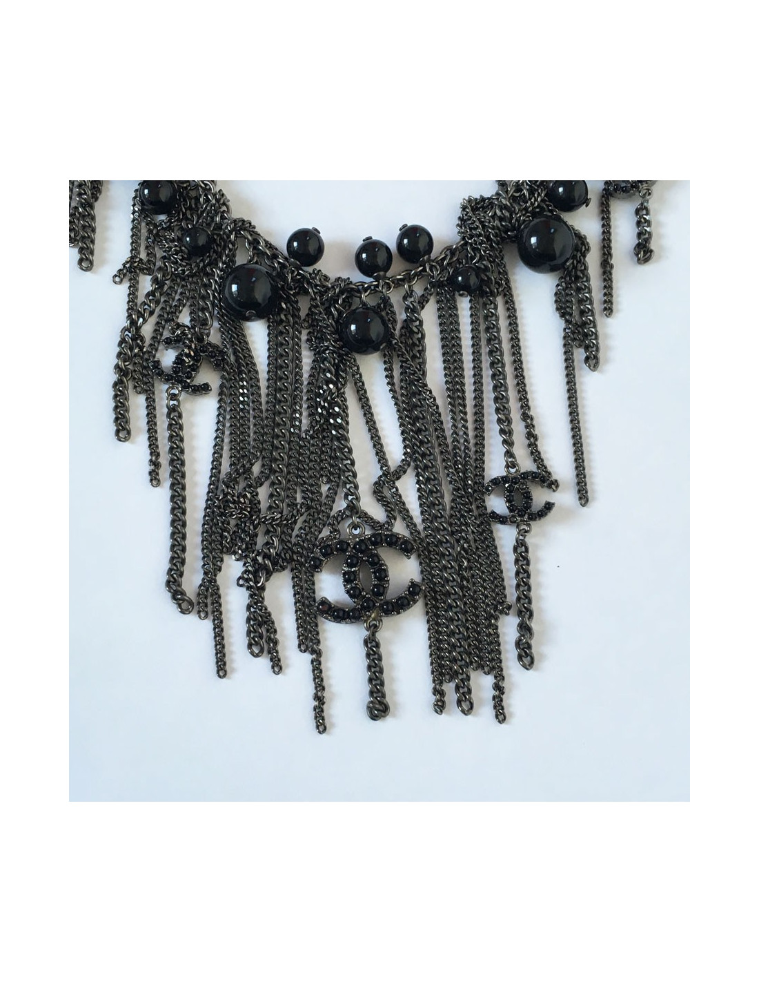 Beautiful necklace CHANEL chain, pearls black and multiple small silver dangling strings. Ornate CC 5 of small black beads. Never worn.