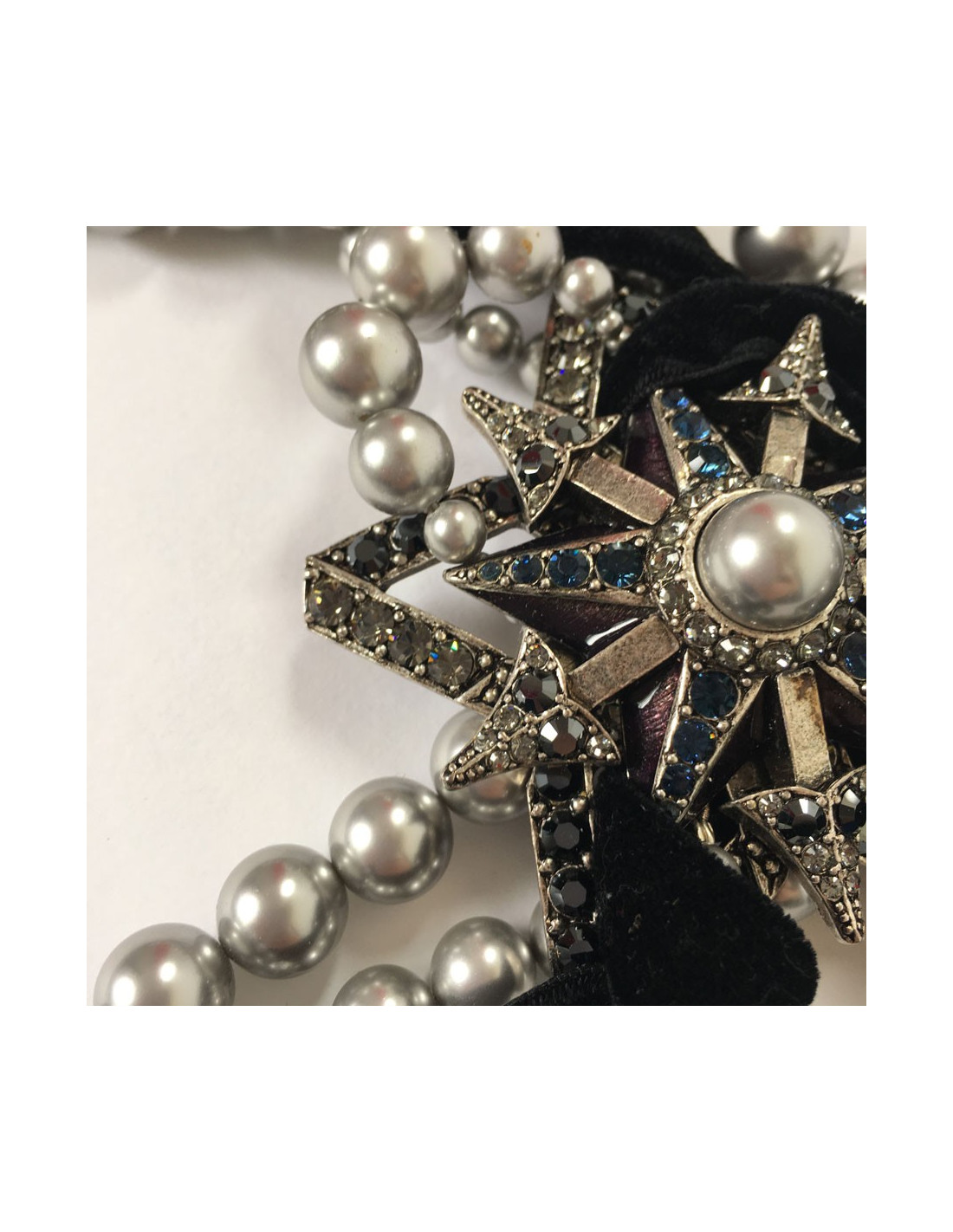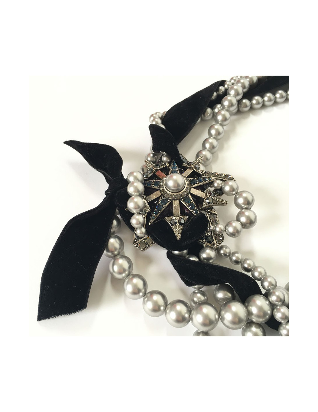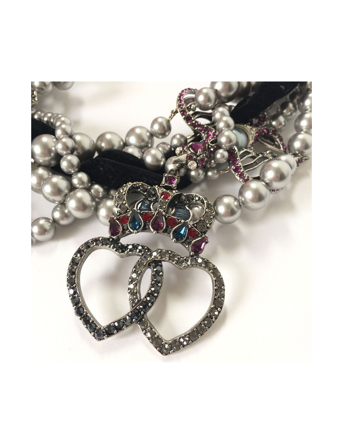Imposing and beautiful LANVIN choker necklace. Multiple rows of gray pearls, star, heart and bird in silver plated metal with multicolored rhinestones. Velvet ribbon all around the necklace.